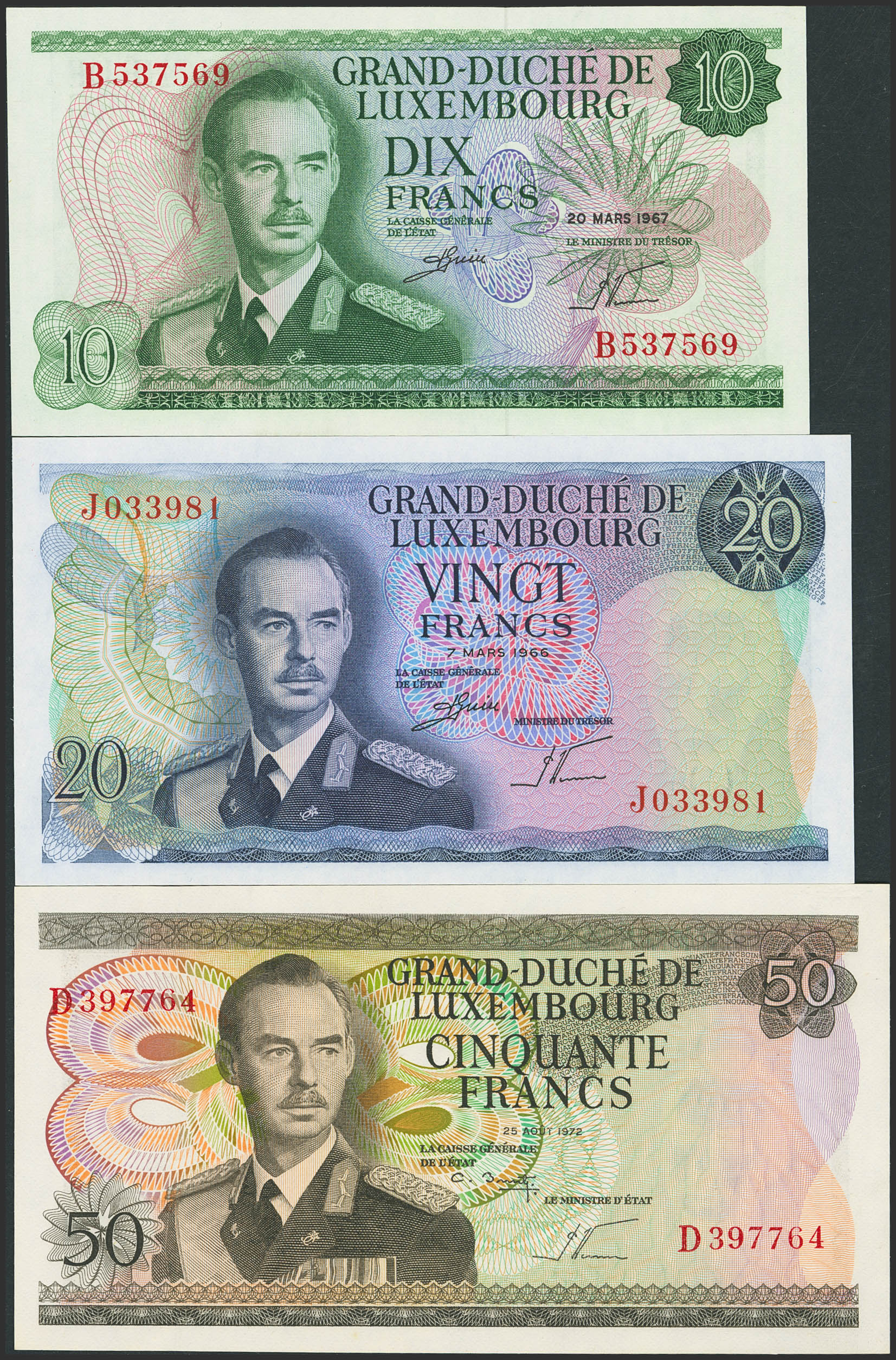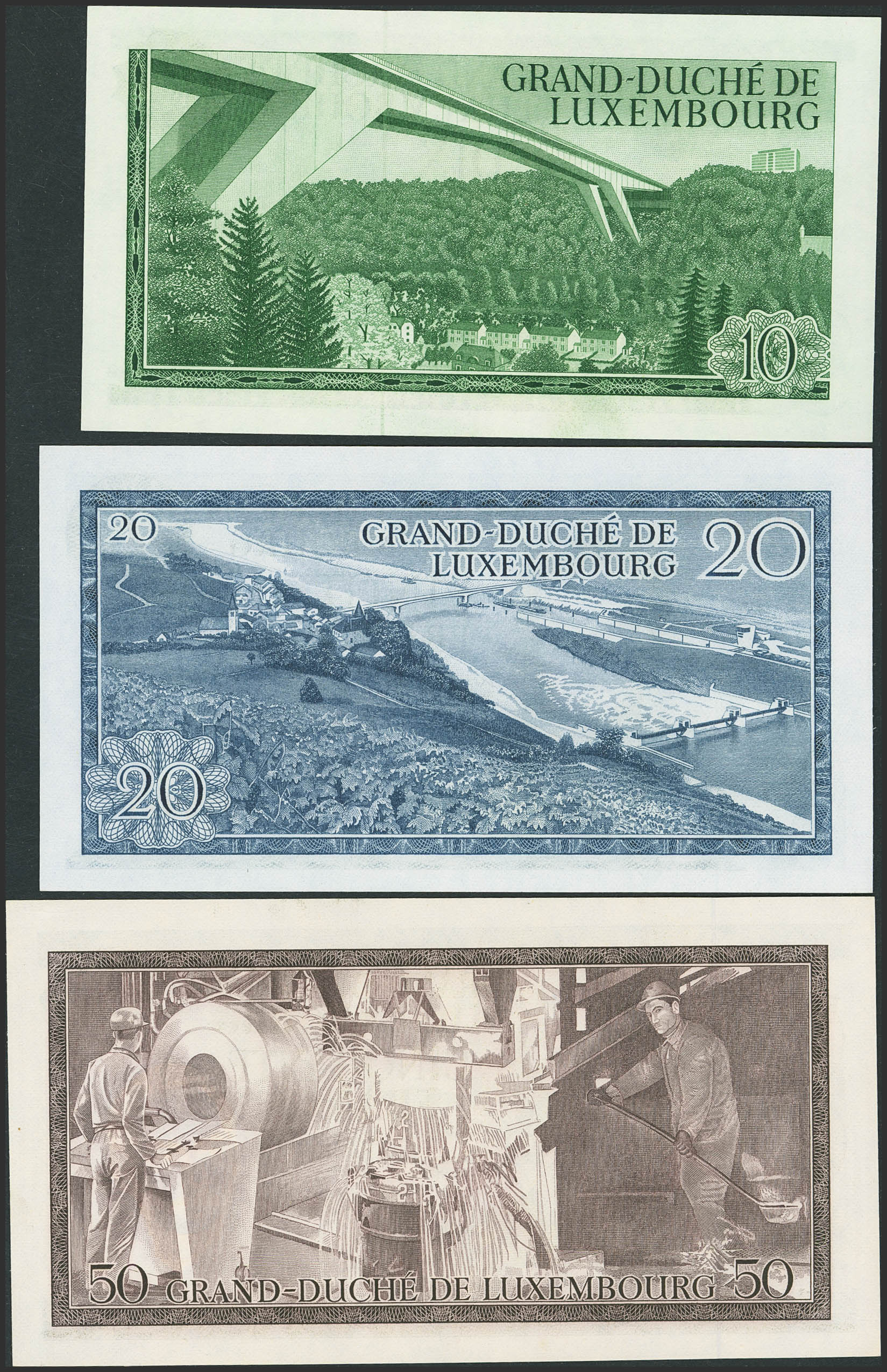 Set of 3 banknotes of Luxembourg of 10 Francs, 20 Francs and 50 Francs. (1967ca). (Pick: 53, 54, 55). Less than Uncirculated / Uncirculated.