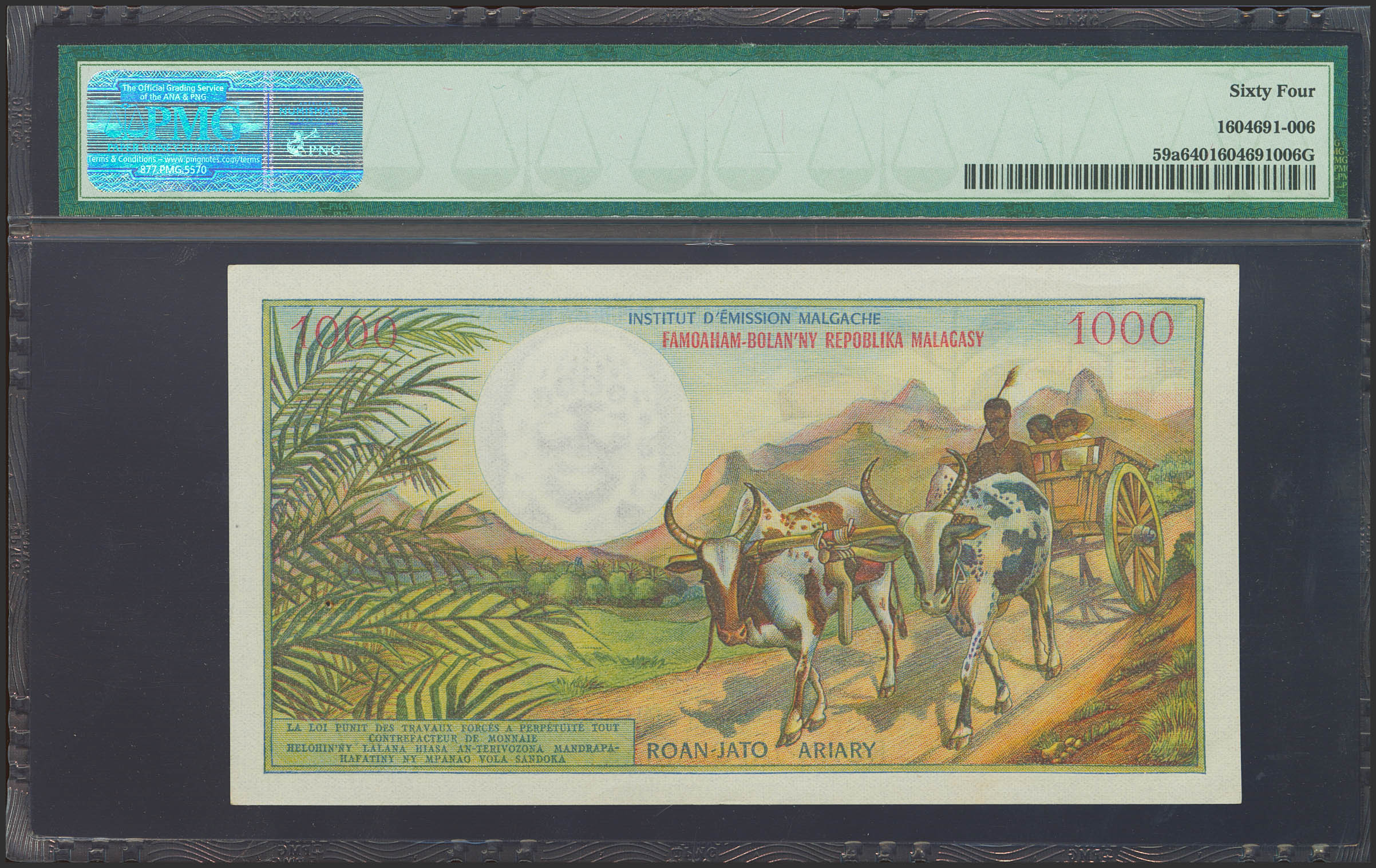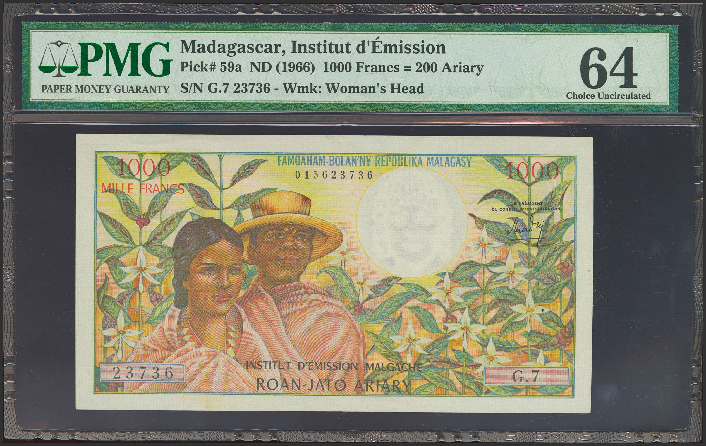 MADAGASCAR. 1000 Francs. (1966ca). (Pick: 59a). Extremely rare, especially in this exceptional quality. PMG64.