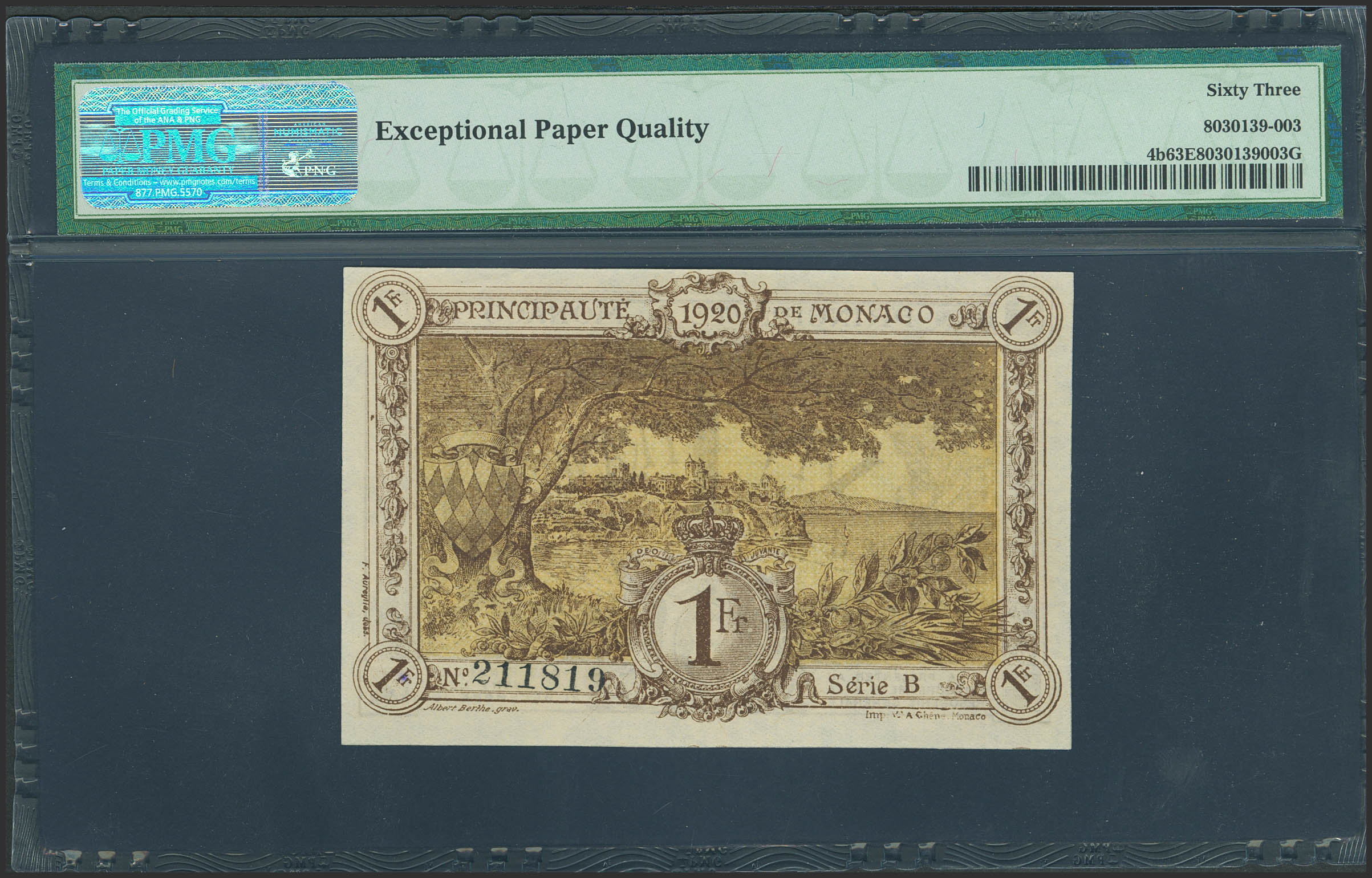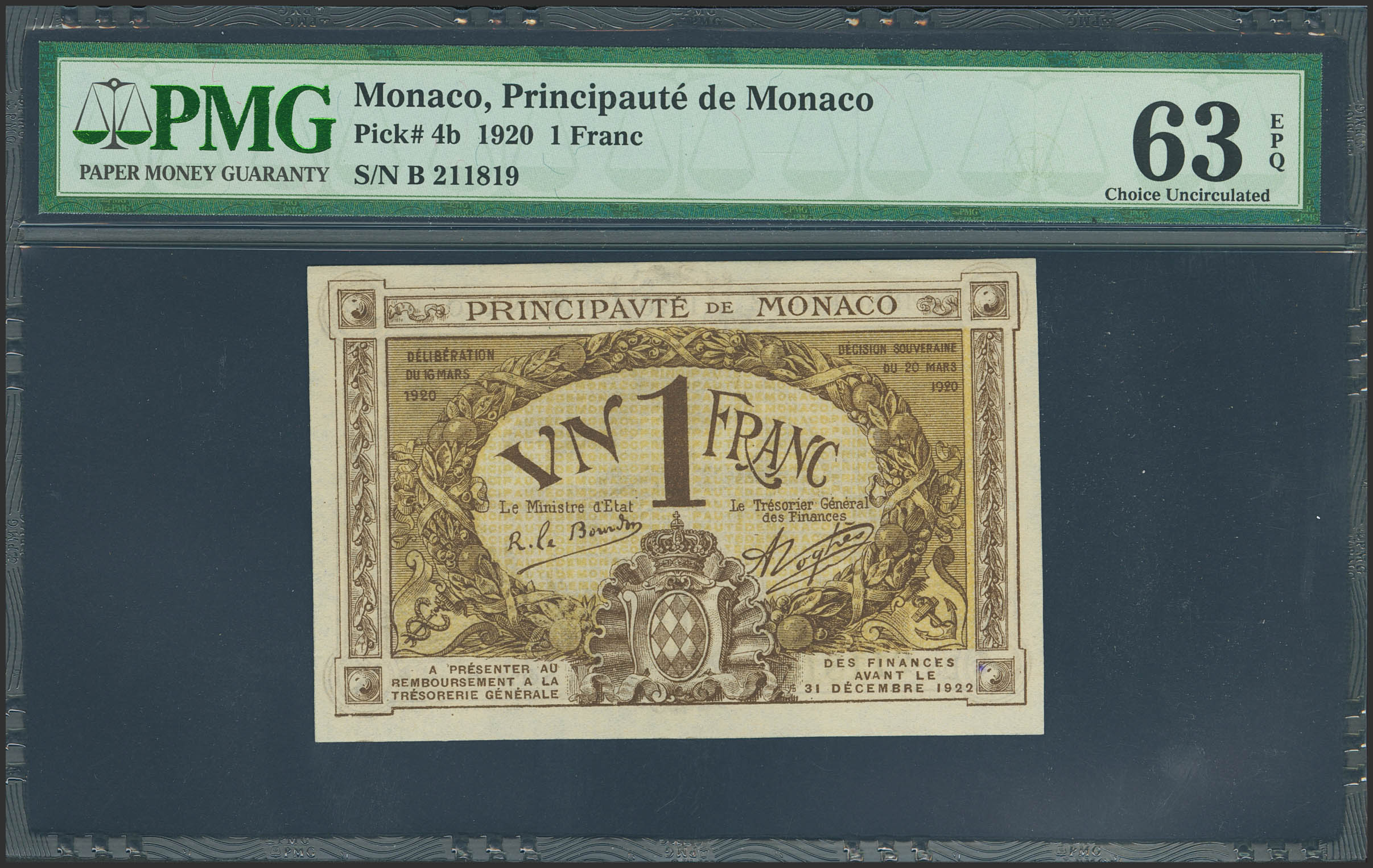 MONACO. 1 Franc. 1920. (Pick: 4b). Very rare, especially in this exceptional quality. PMG63EPQ.