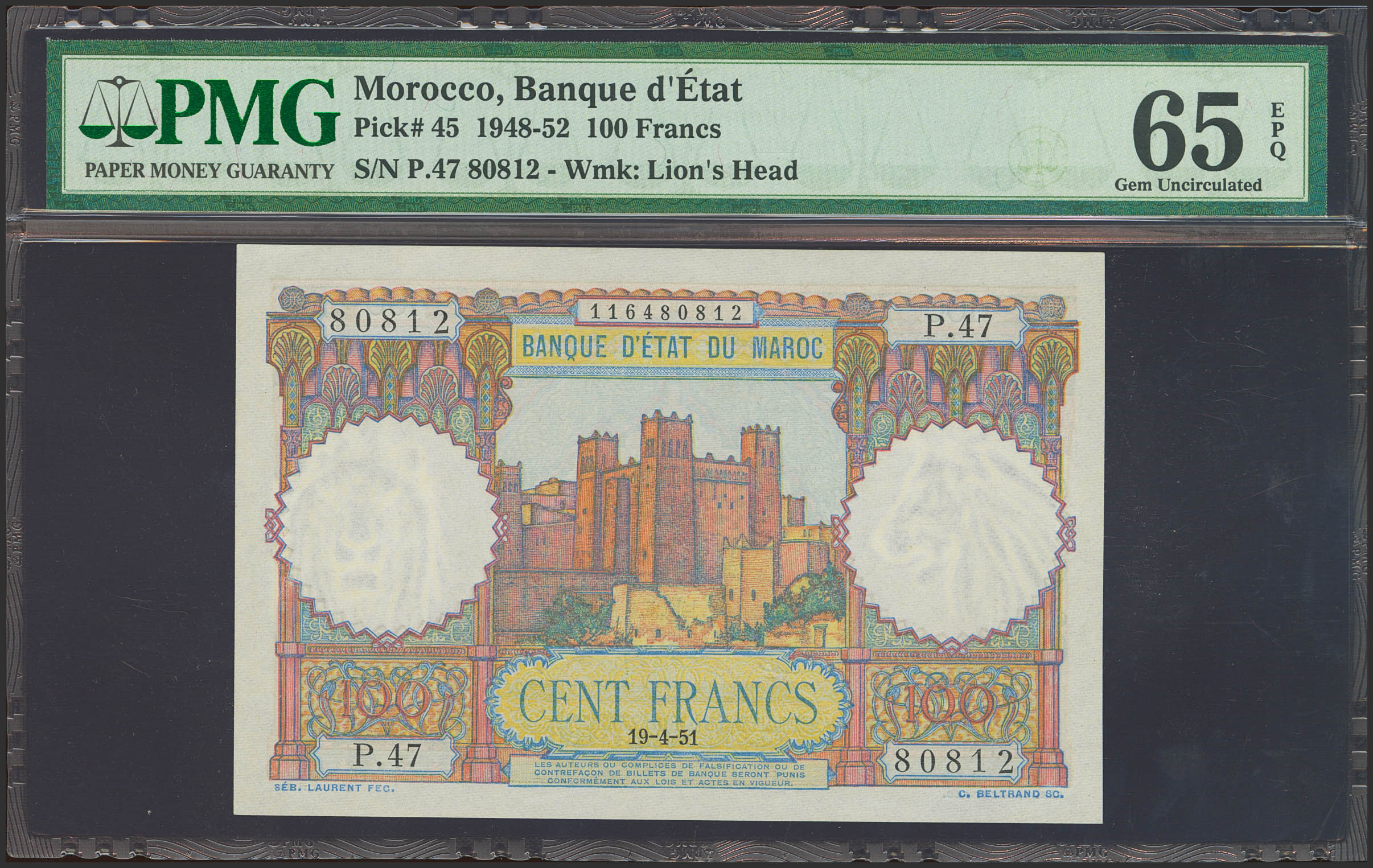 MOROCCO. 100 Francs. 19 April 1951. (Pick: 45). PMG65EPQ.