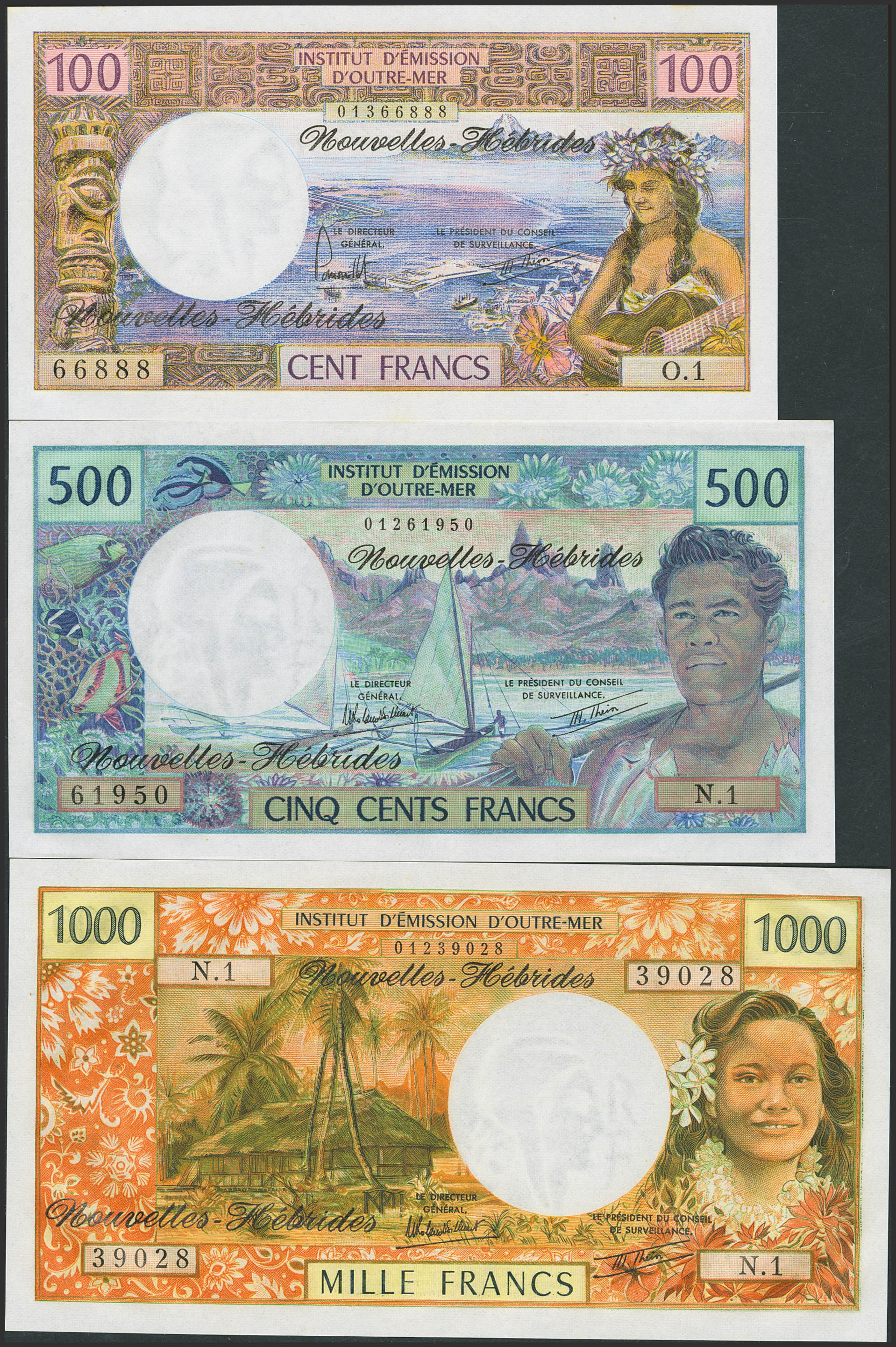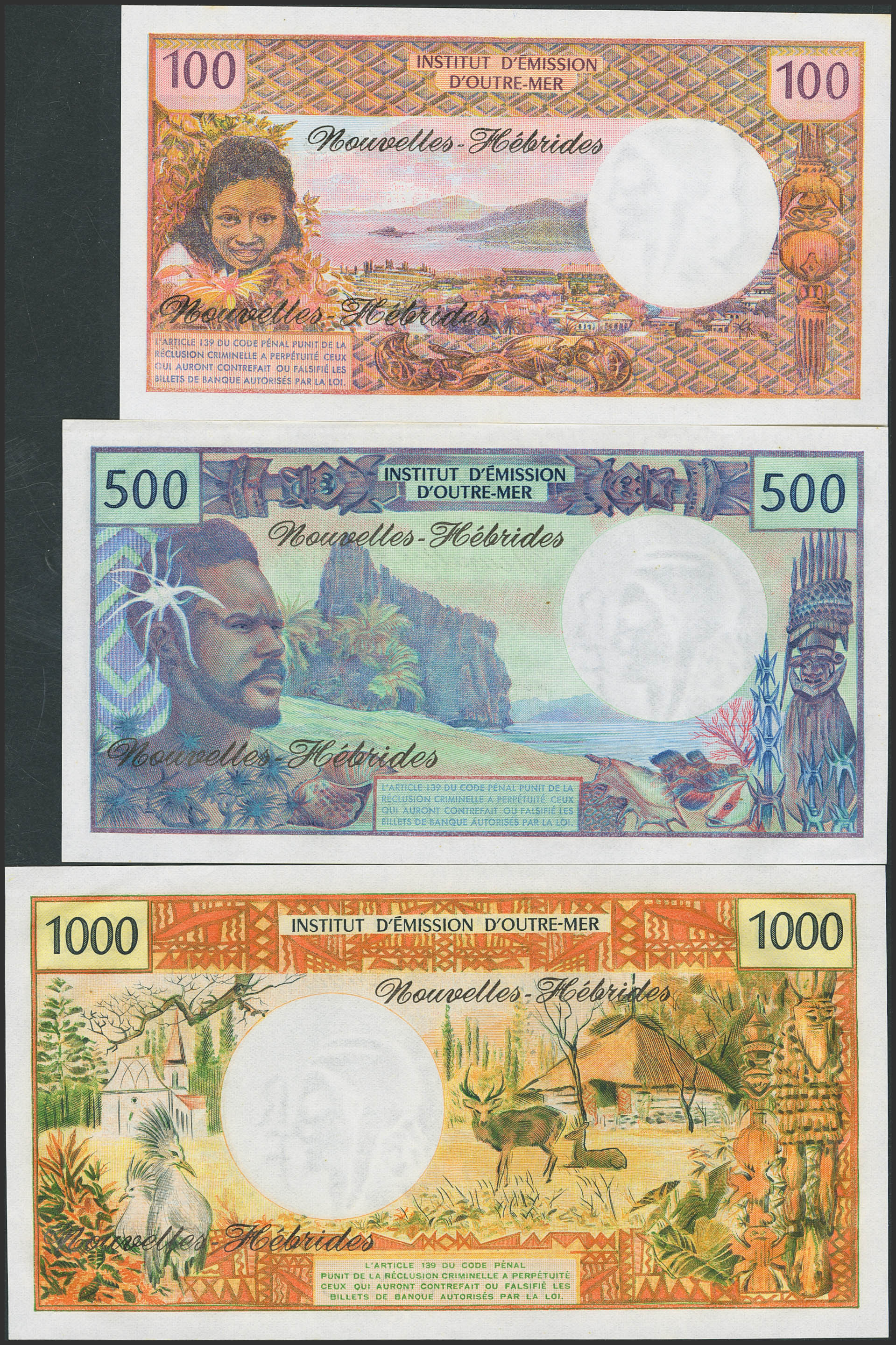 Set of 3 banknotes of New Hebrides of 100 Francs, 500 Francs and 1000 Francs. (1970ca). (Pick: 18, 19, 20). Less than Uncirculated / Uncirculated.