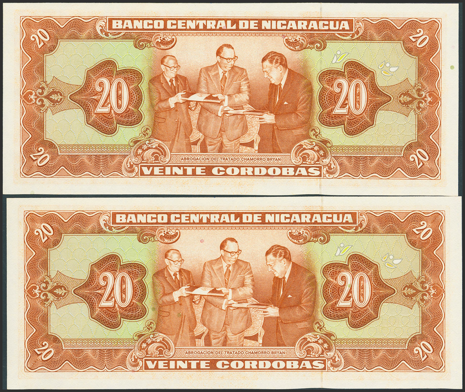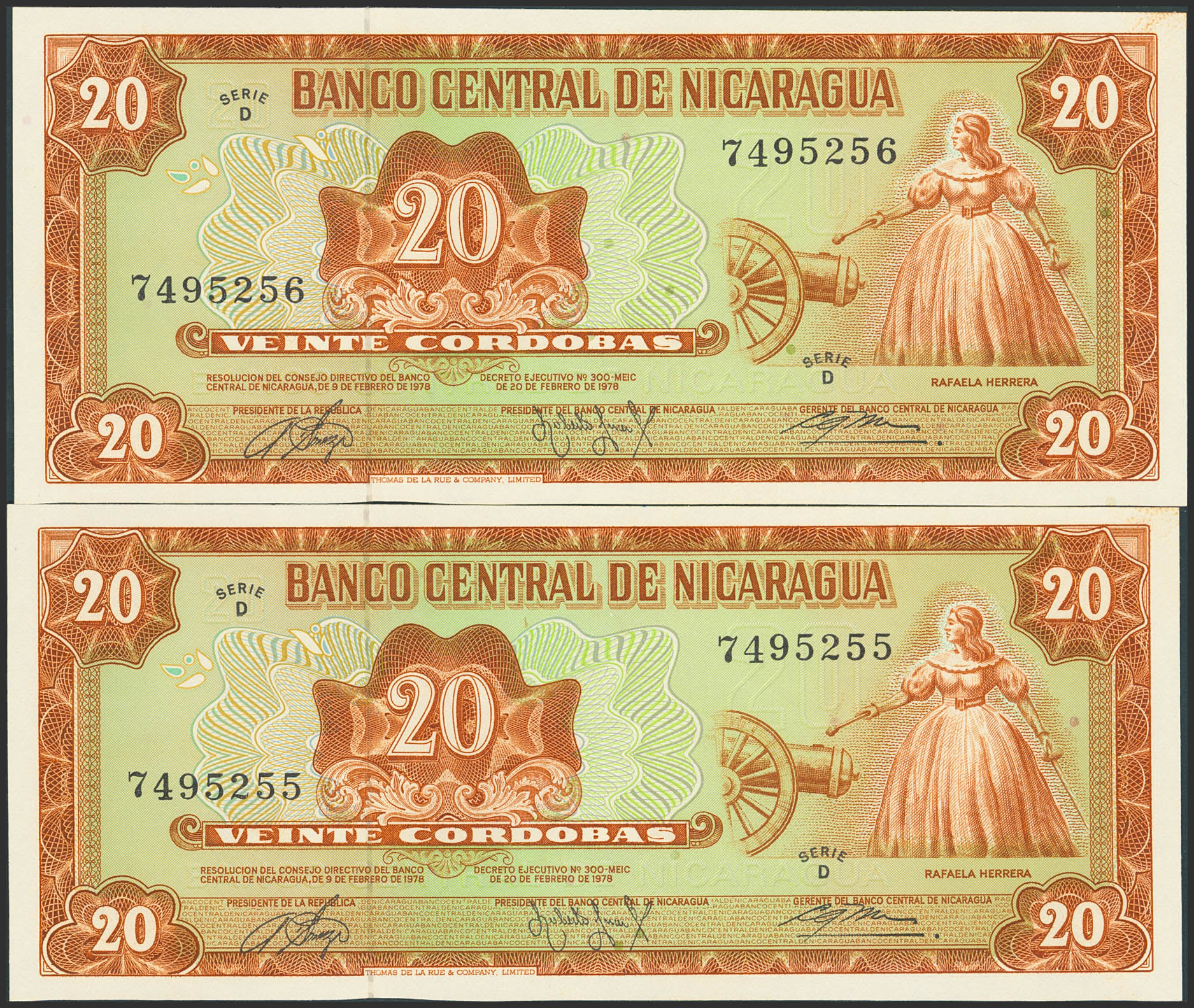 Set of 2 banknotes of Nicaragua of 20 Cordobas. Pair correlative. (1978ca). (Pick: 129). Uncirculated.