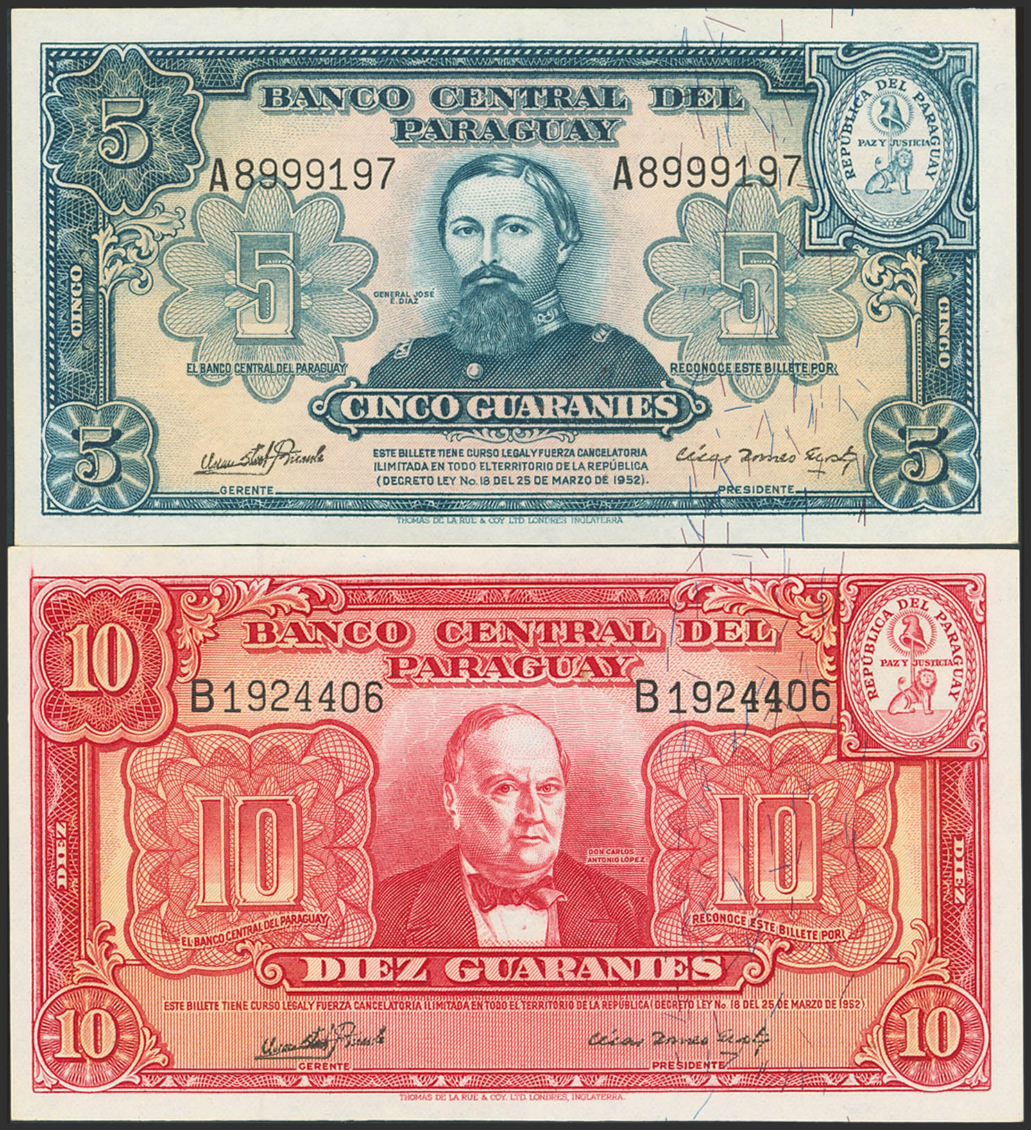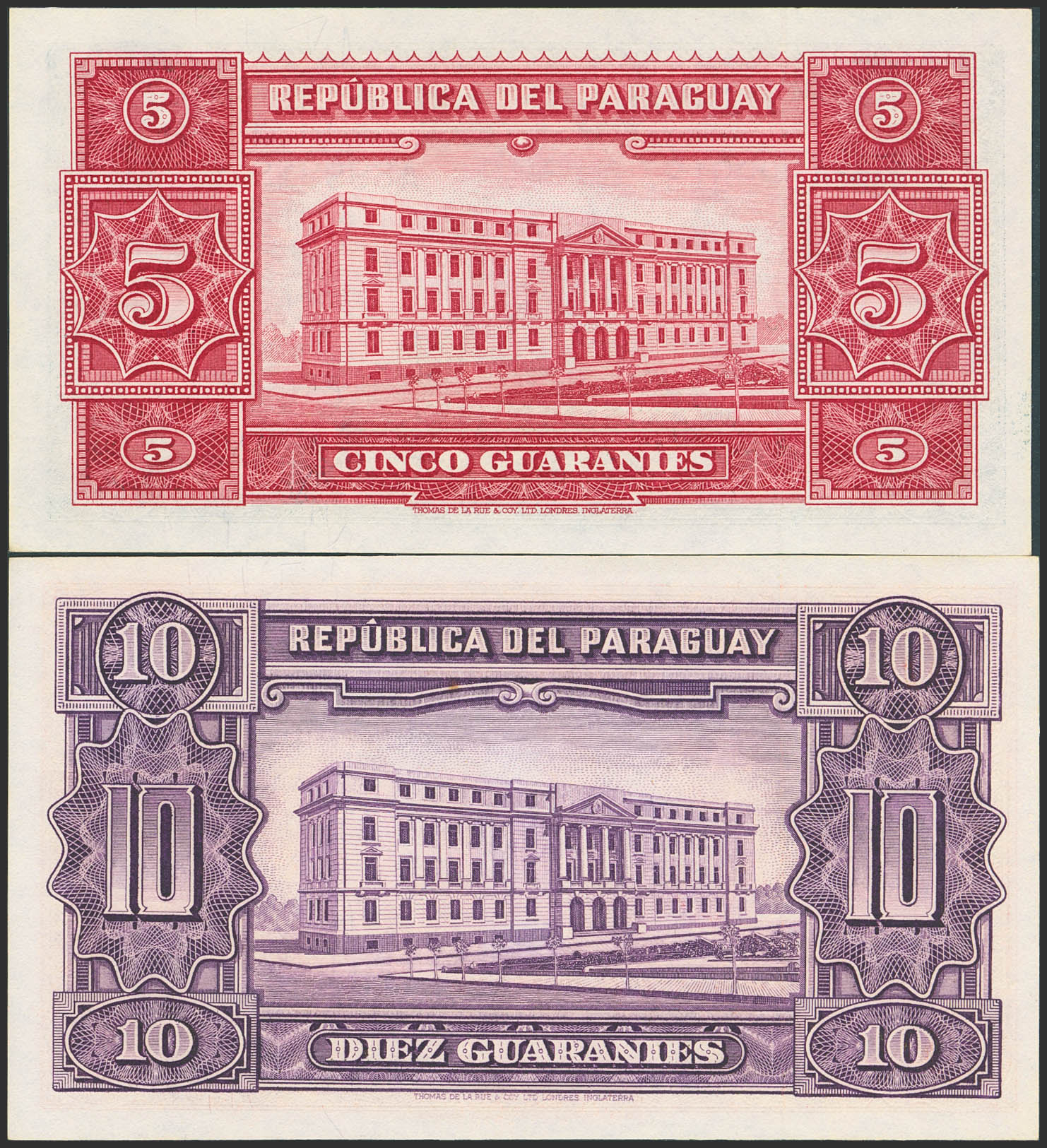 Set of 2 banknotes of Paraguay of 5 Guaranies and 10 Guaranies. 1952. (Pick: 186c, 187c). Less than Uncirculated.