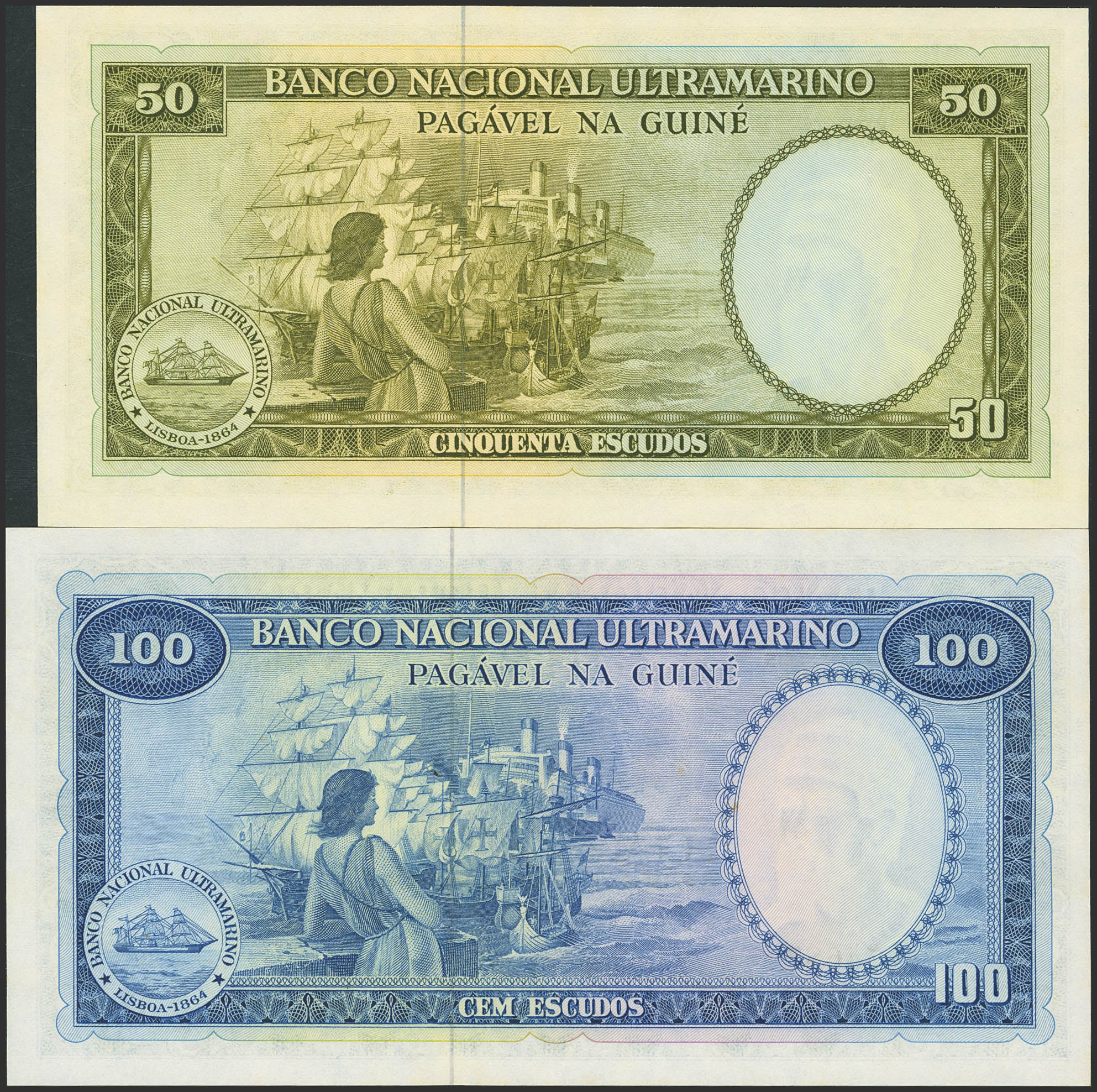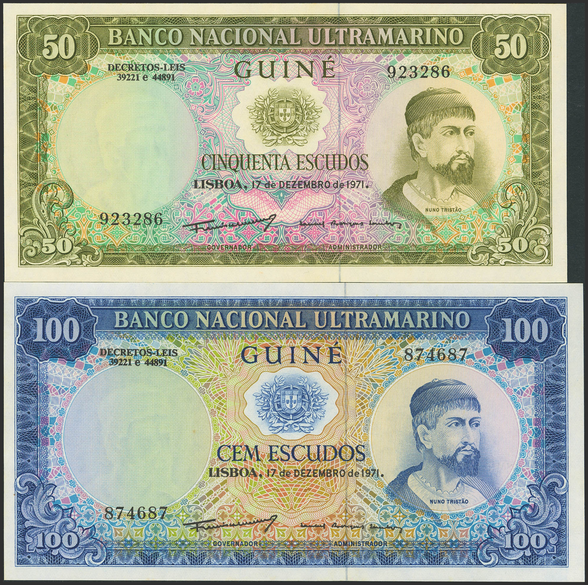 Set of 2 banknotes of Portuguese Guinea of 50 Escudos and 100 Escudos. 17 December 1971. (Pick: 44, 45). Uncirculated.