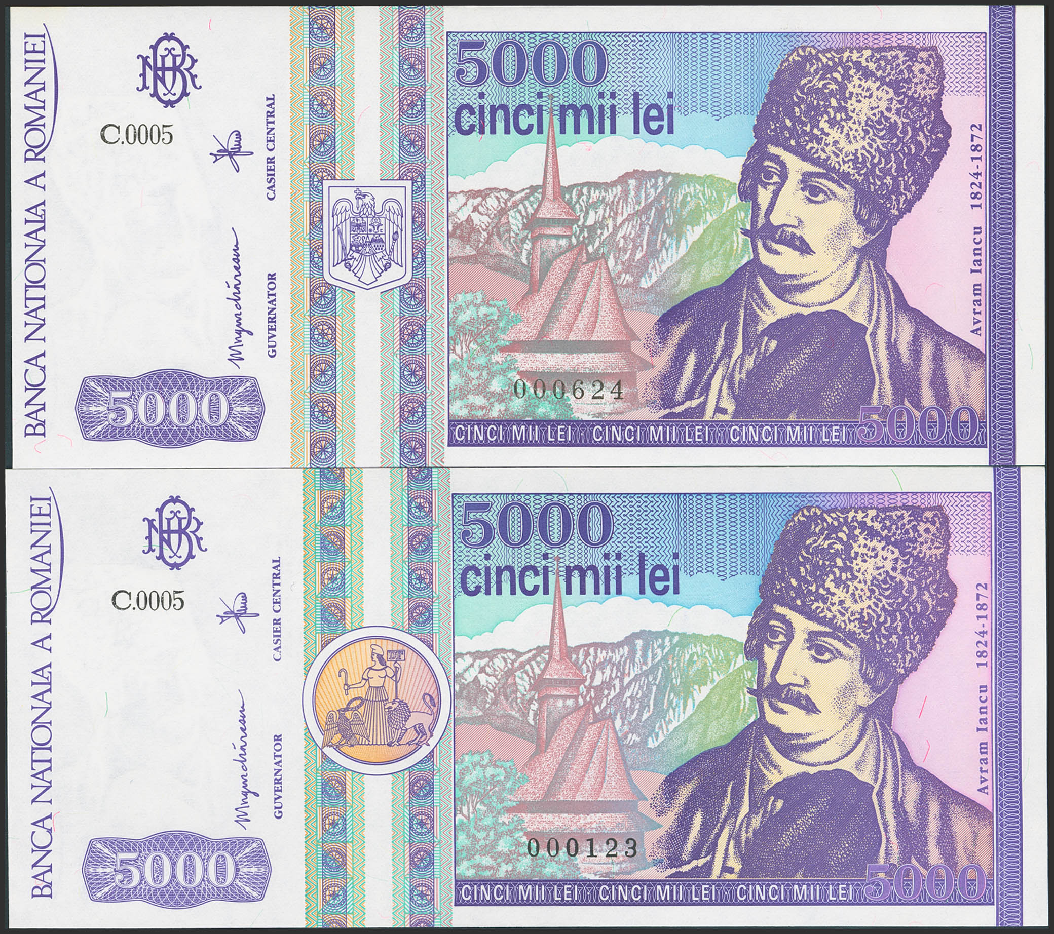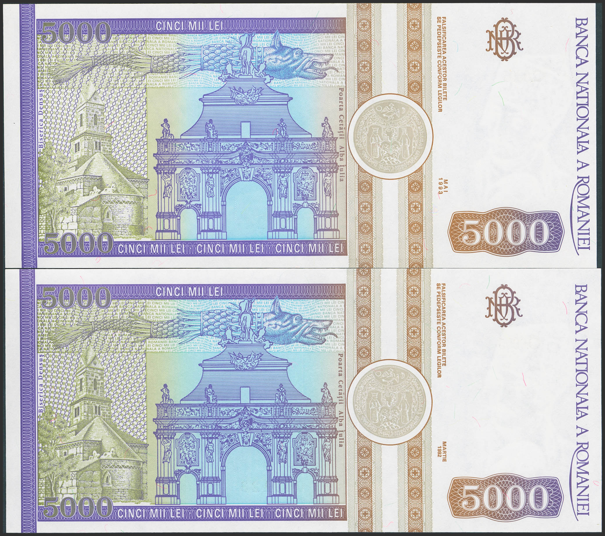 Set of 2 banknotes of Romania of 5000 Lei. (1992ca). Low numeration. (Pick: 103(2)). Less than Uncirculated.