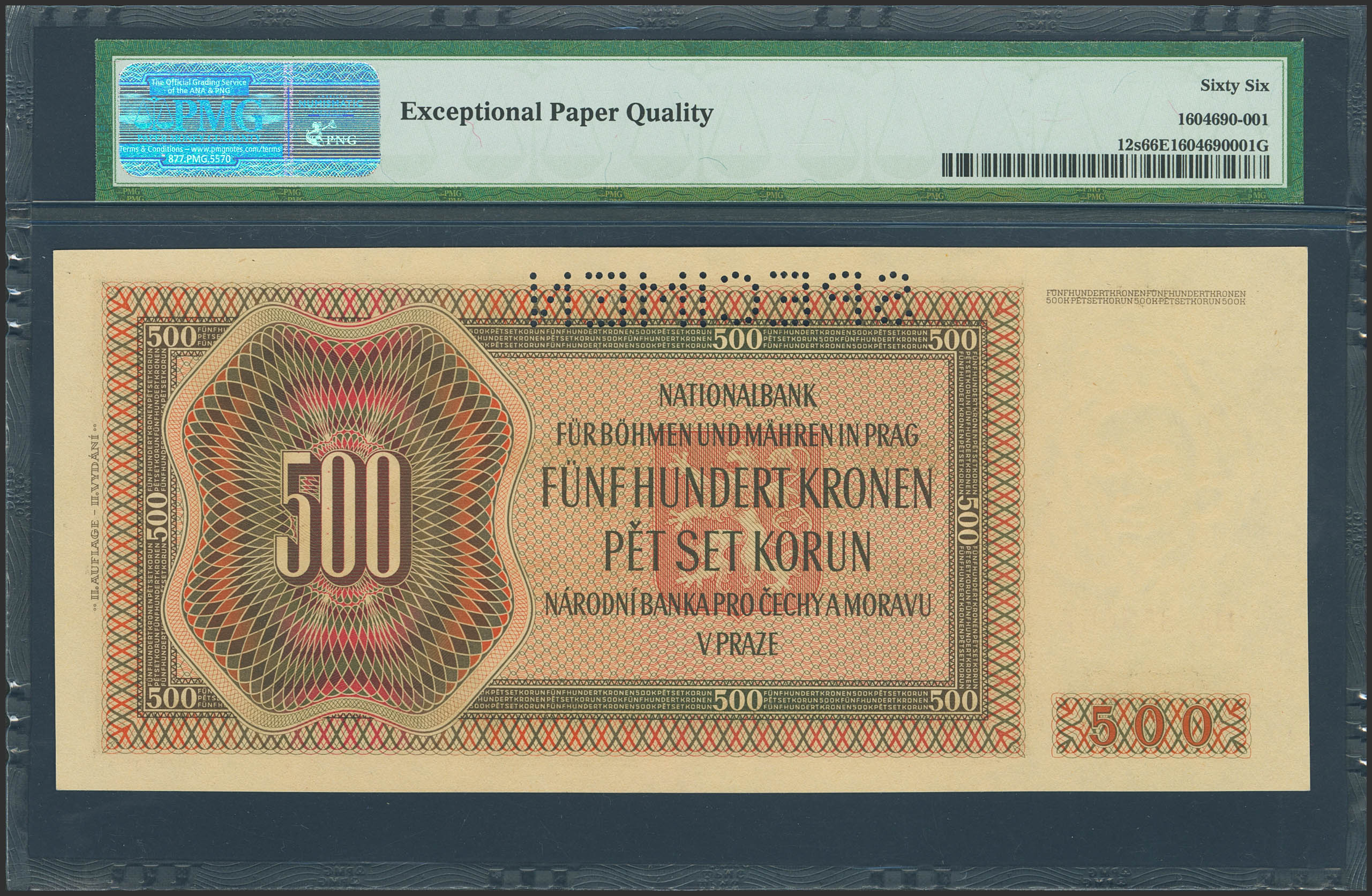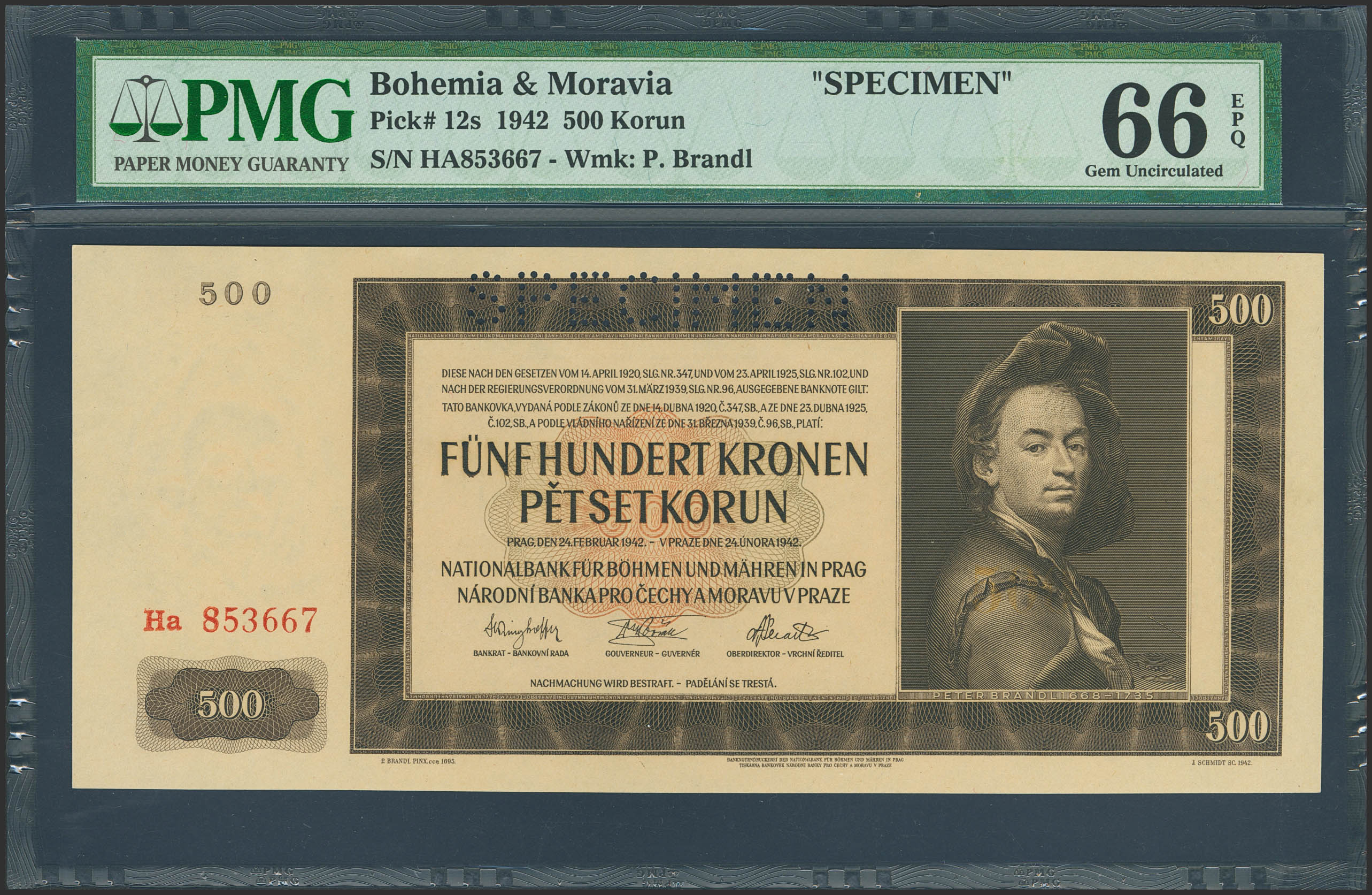 BOHEMIA AND MORAVIA. 500 Korun. 24 Febraury 1942. SPECIMEN. (Pick: 12s). PMG66EPQ.