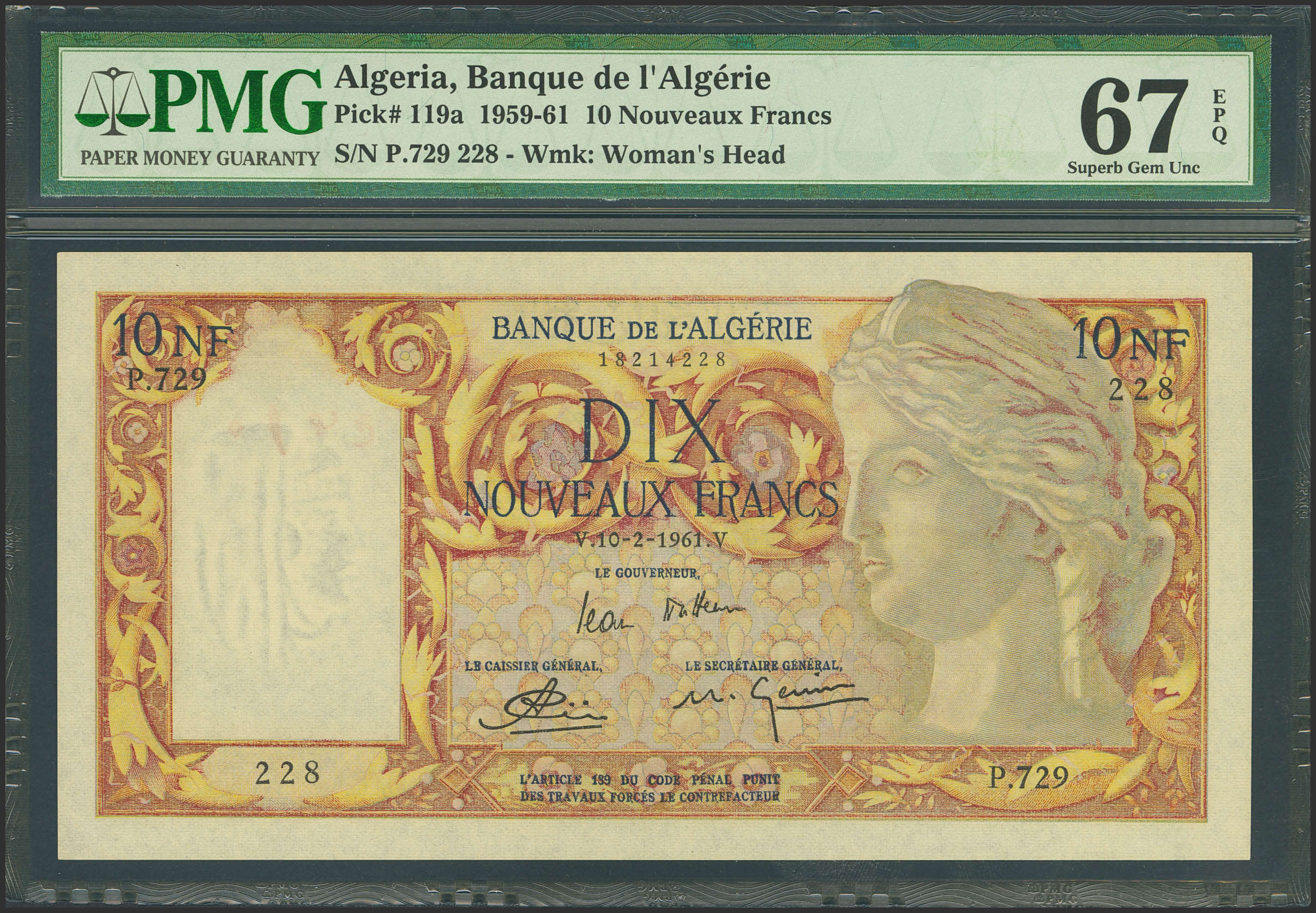ALGERIA. 10 Nouveaux francs. 10 February 1961. (Pick: 119a). Very rare especially in this exceptional quality. PMG67EPQ.