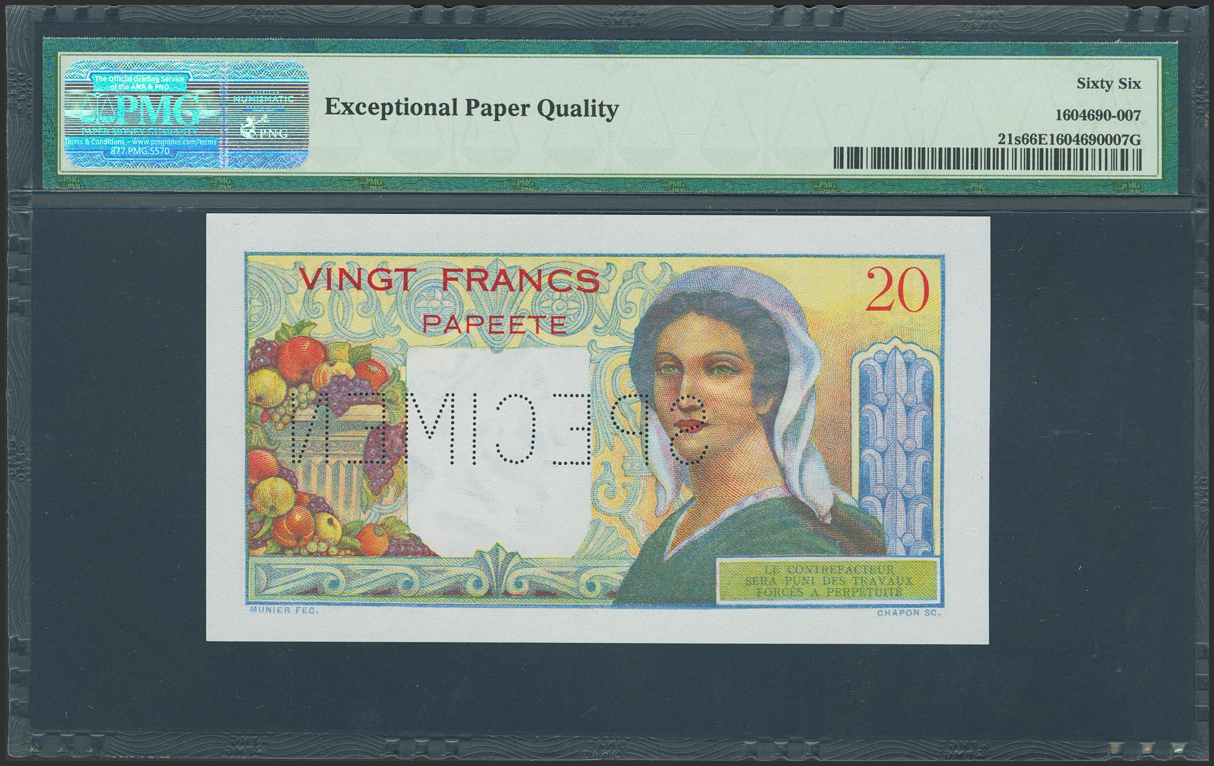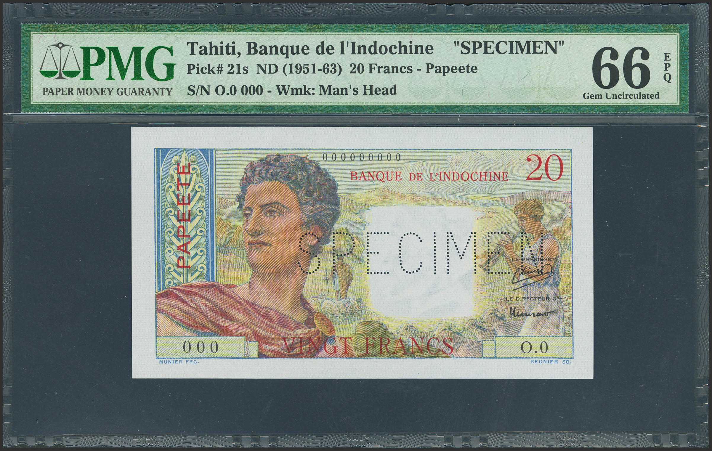 TAHITI. 20 Francs. (1951ca). SPECIMEN and numeration 00000. (Pick: 21s). Rare. PMG66EPQ.
