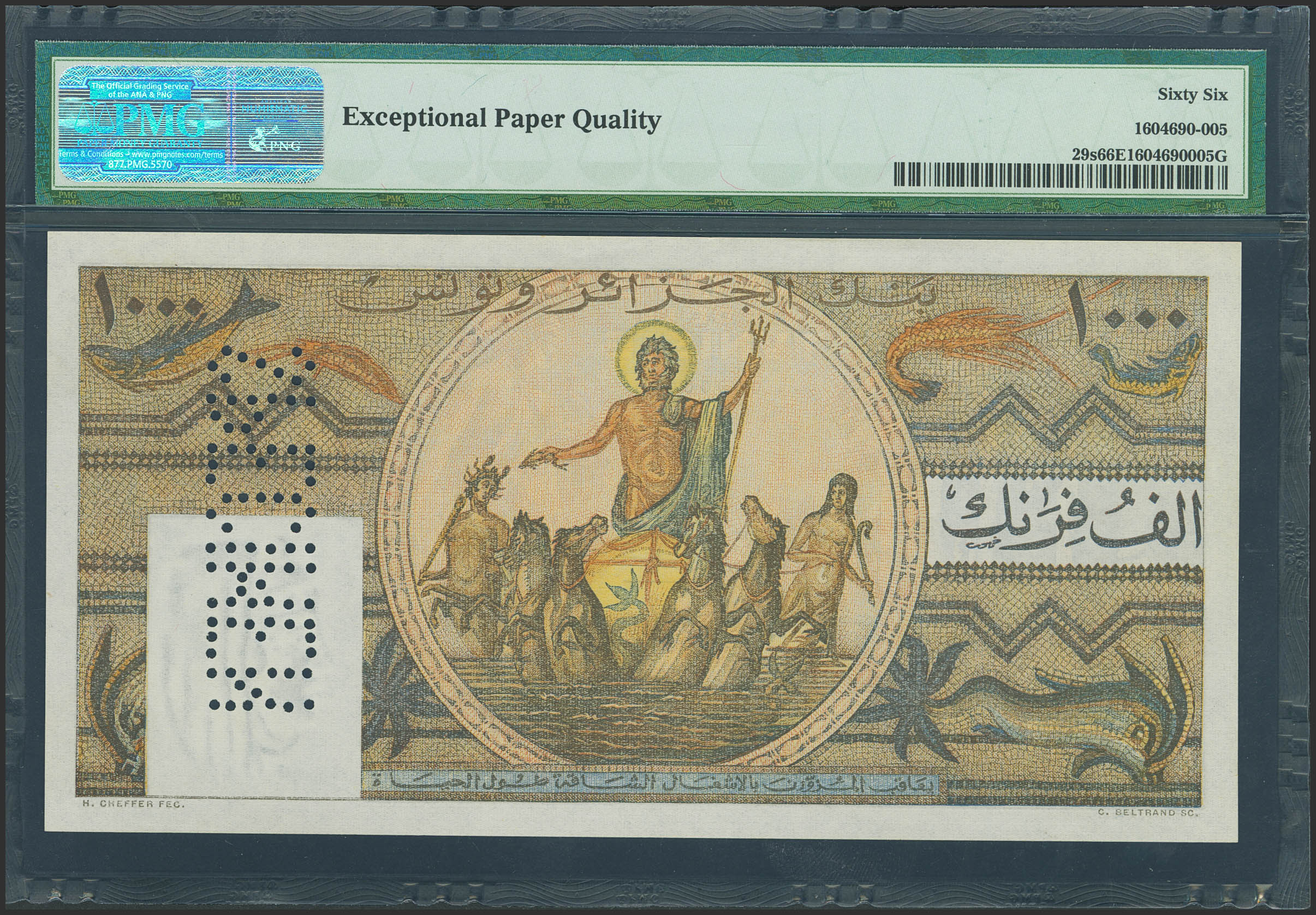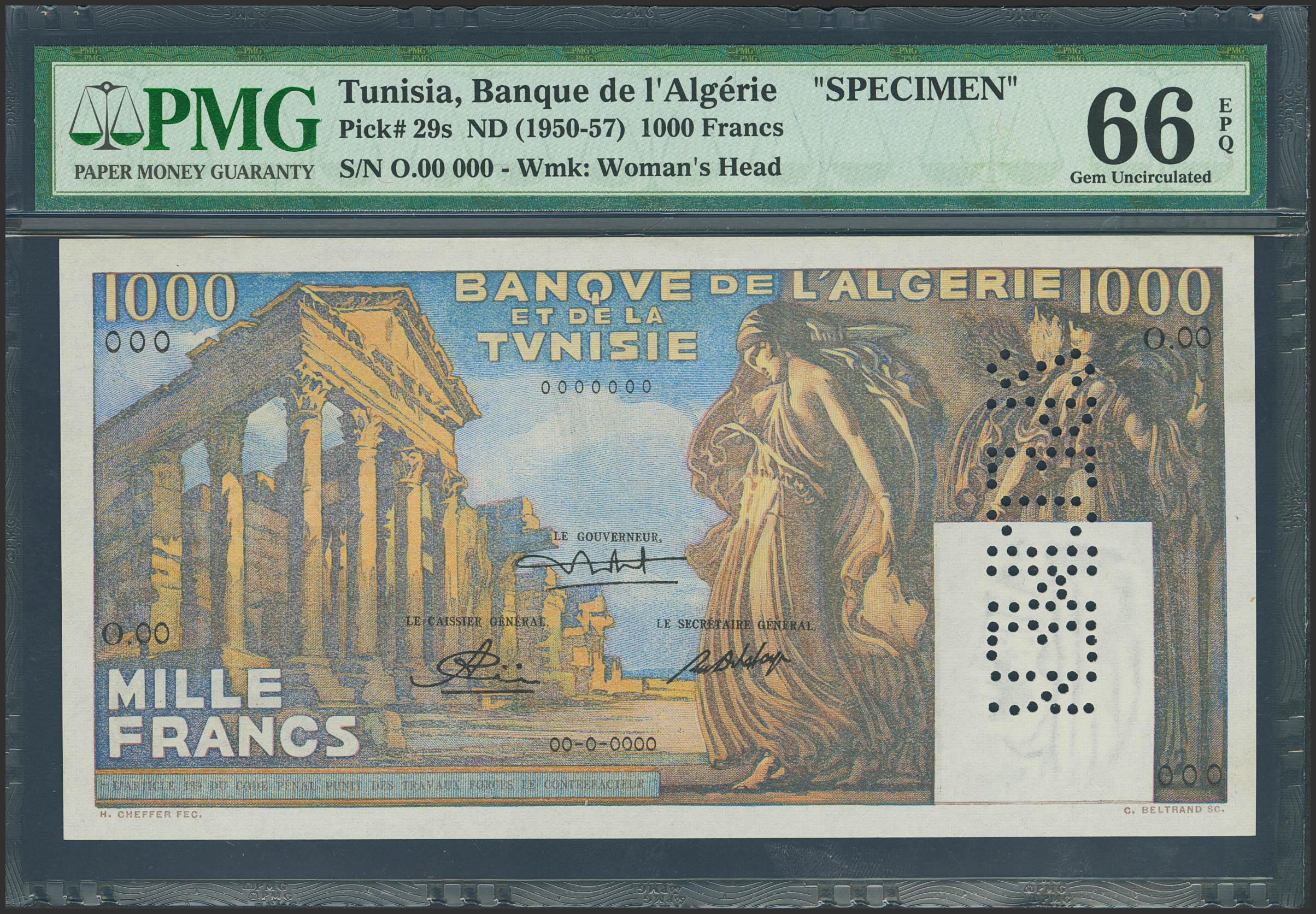 TUNISIA. 1000 Francs. (1950ca). SPECIMEN and numeration 00000. (Pick: 29s). Extremely rare, especially in this exceptional quality. PMG66EPQ.