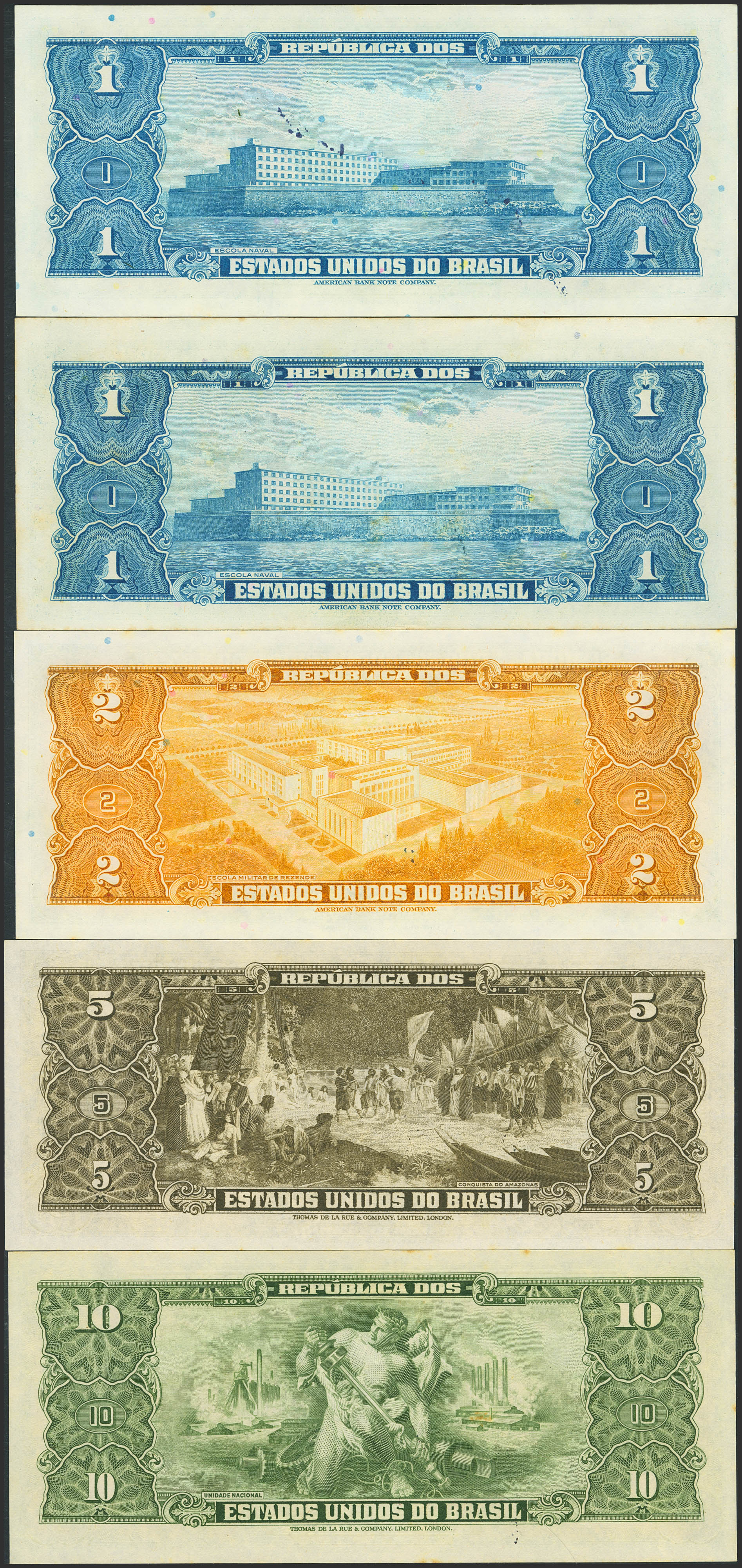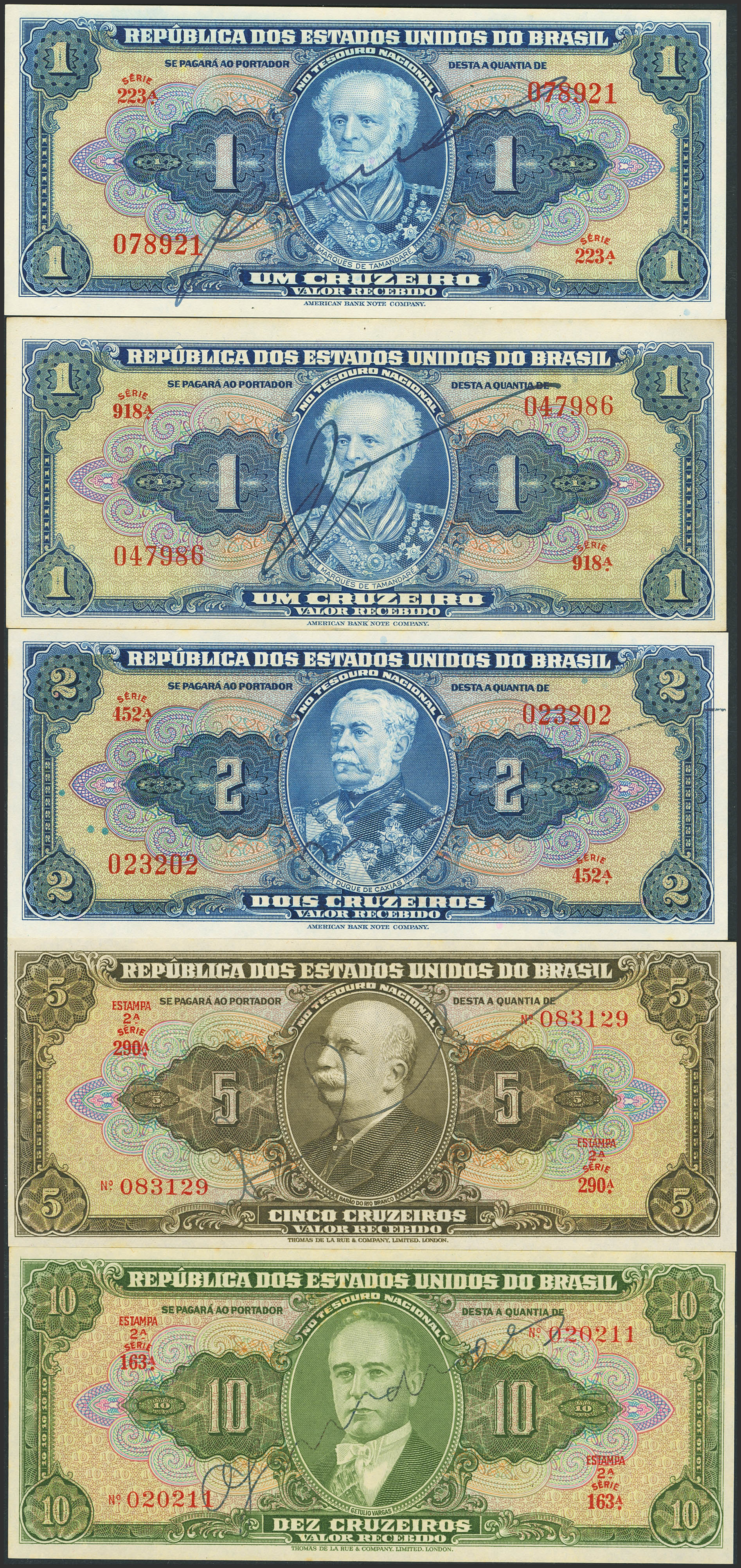 Set of 5 banknotes of Brazil of 1 Cruzeiros (2), 2 Cruzeiros, 5 Cruzeiros and 10 Cruzeiros. (1950ca). (Pick: 132(2), 133, 142, 143). Uncirculated.