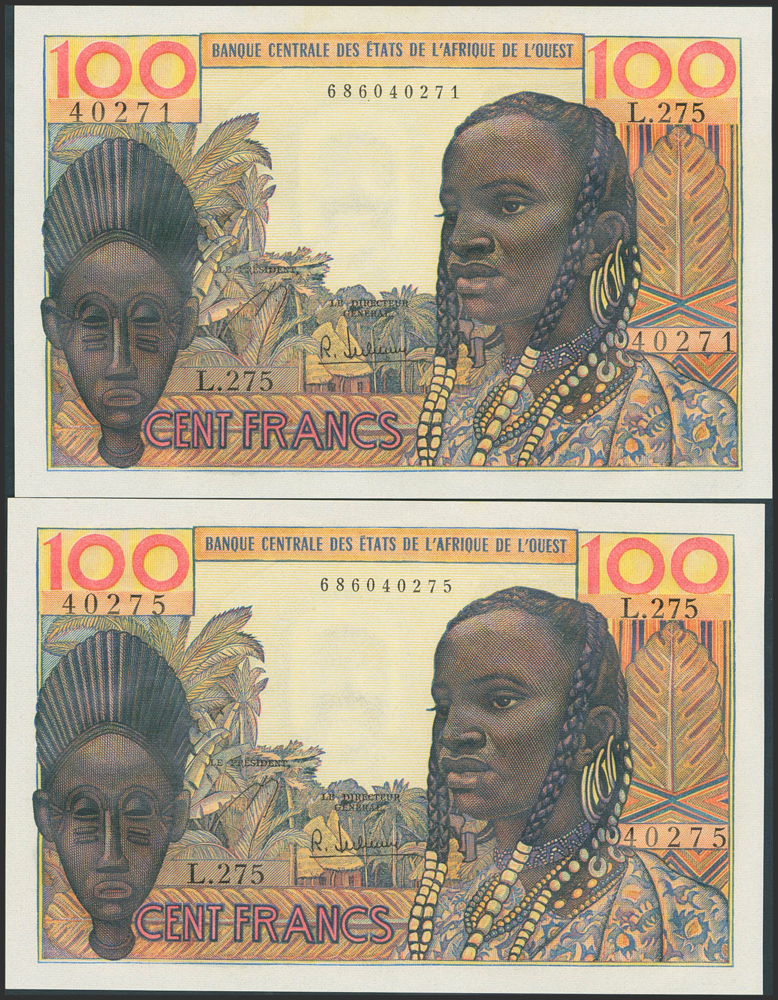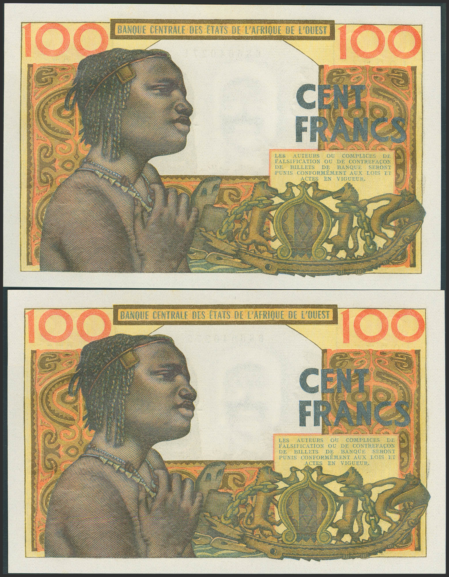 Set of 2 banknotes of West African States of 100 Francs. (1965ca). (Pick: 2(2)). Uncirculated.