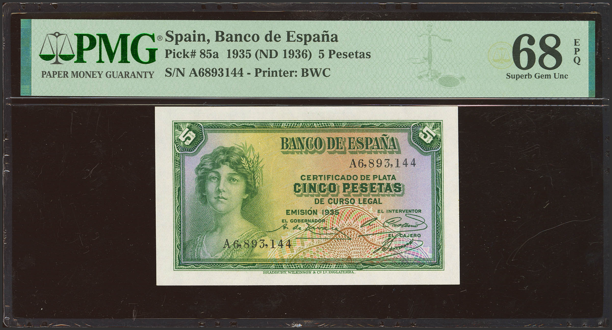 5 Pesetas. 1935. Certificado de Plata. Serie A. (Edifil 2023: 363a, Pick: 85a). Inusual en esta excepcional calidad, apresto original. SC. Encapsulado PMG68EPQ.