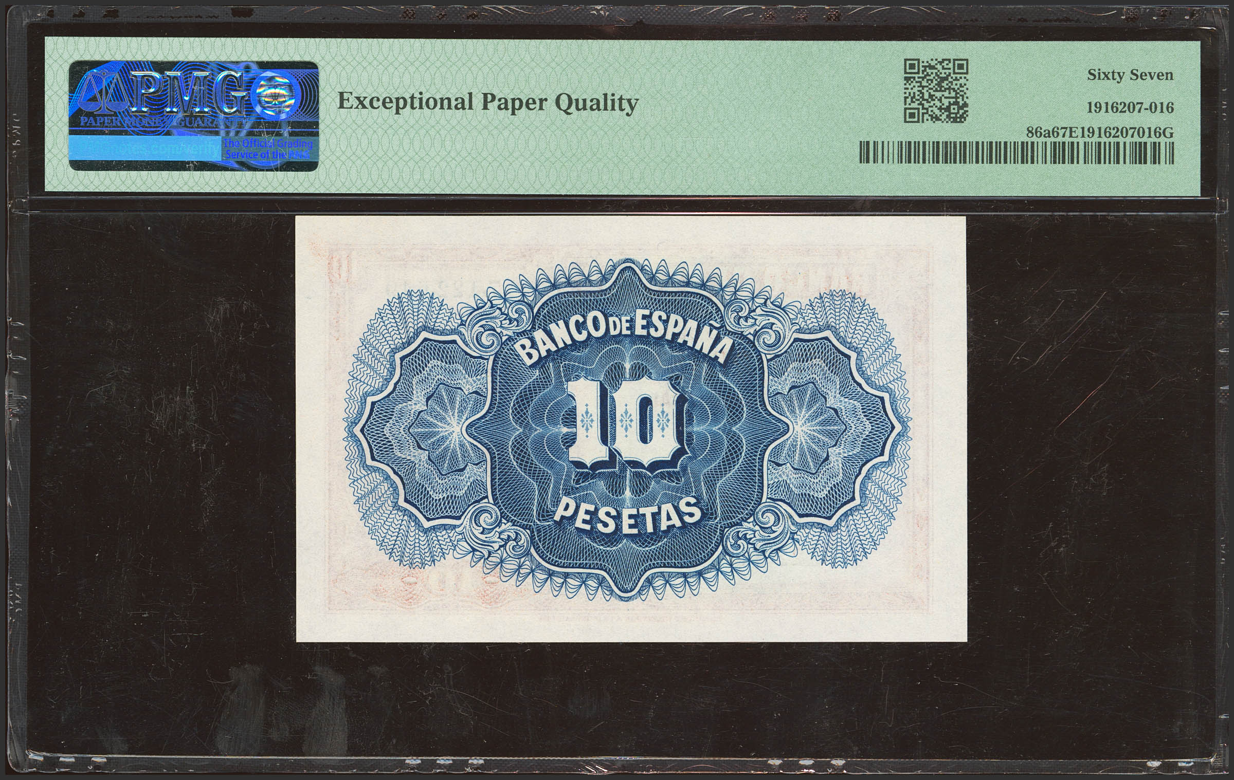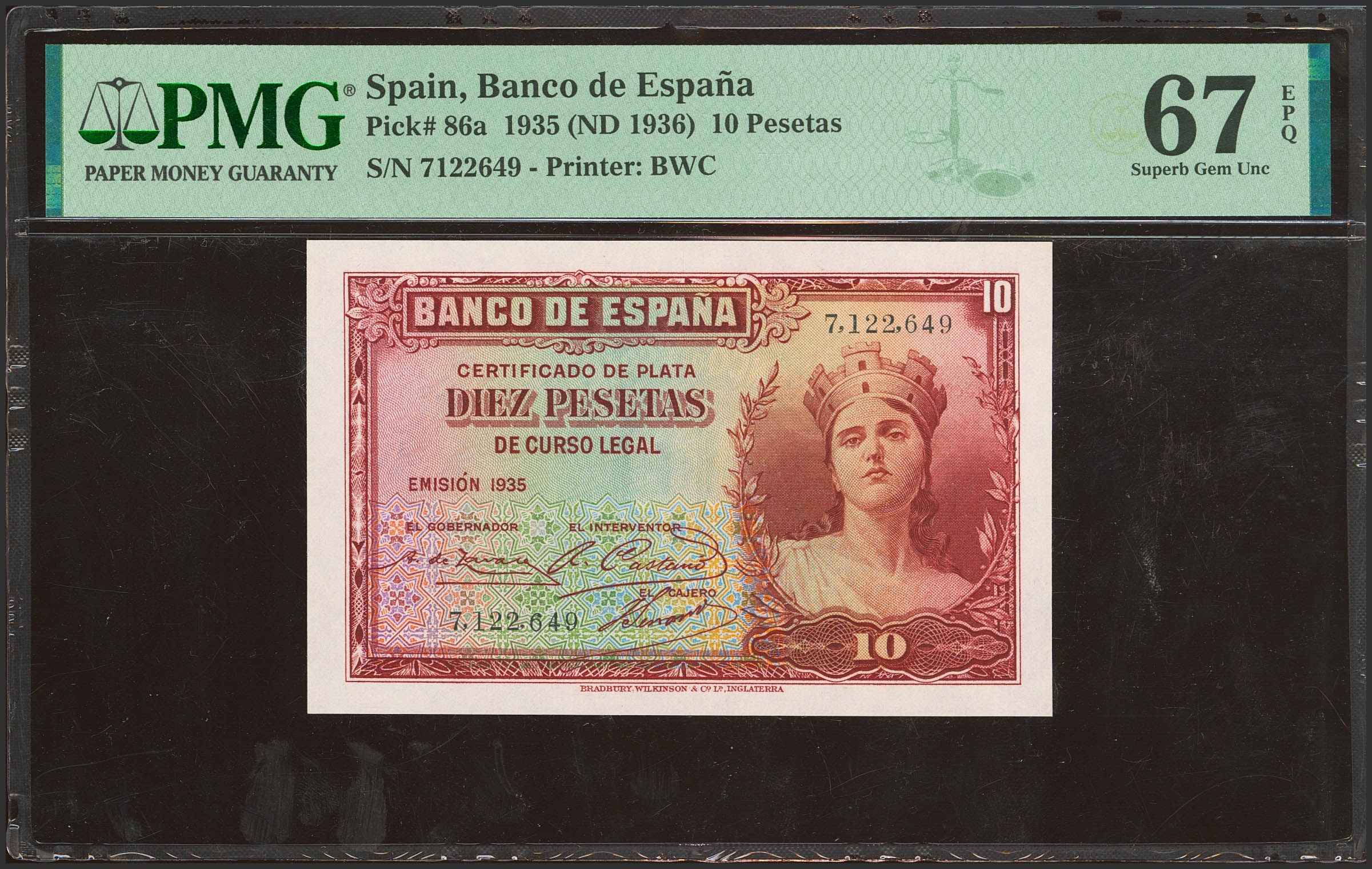 10 Pesetas. 1935. Certificado de Plata. Sin serie. (Edifil 2023: 364, 86a). Raro en esta excepcional calidad, apresto original. SC. Encapsulado PMG67EPQ.