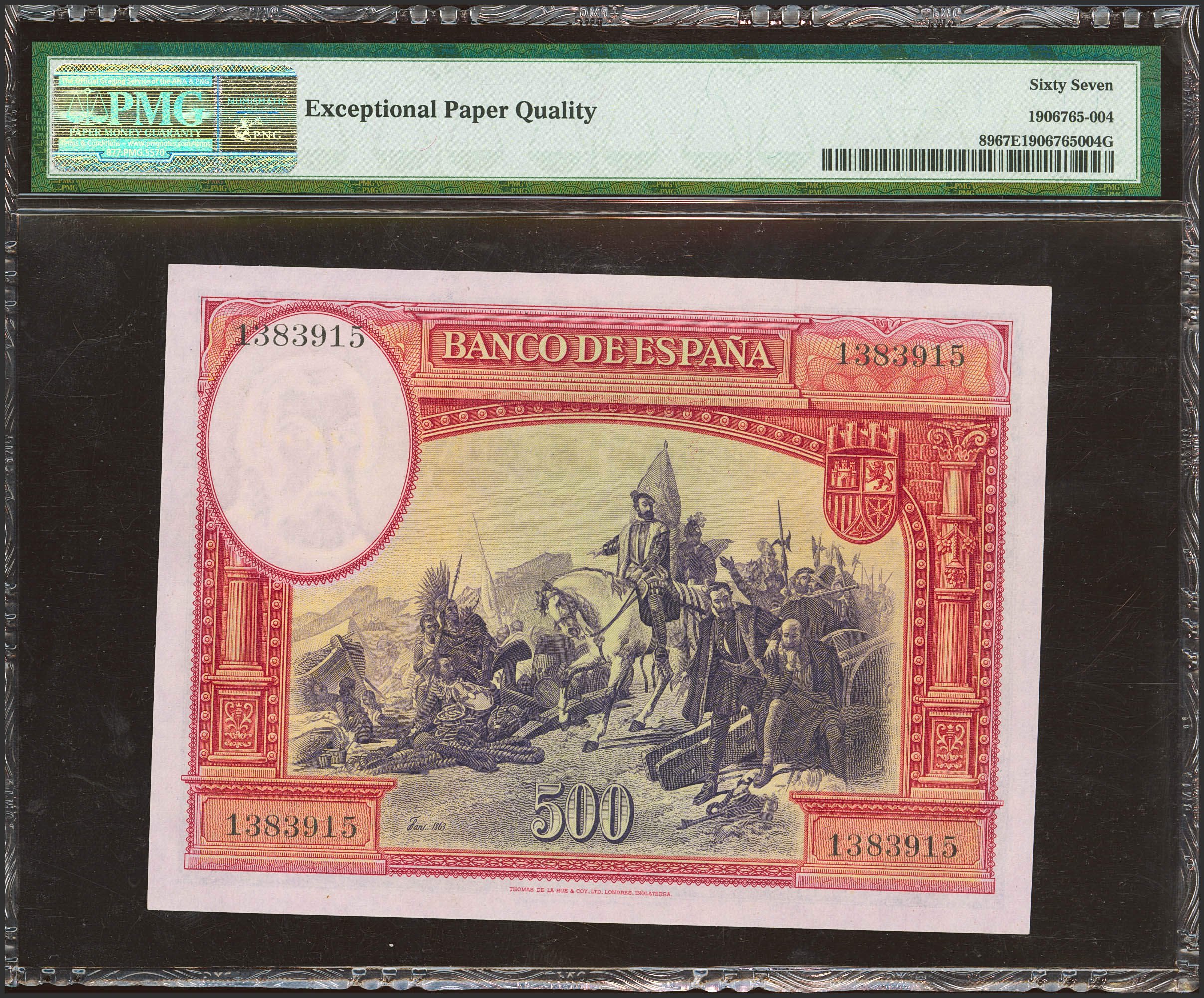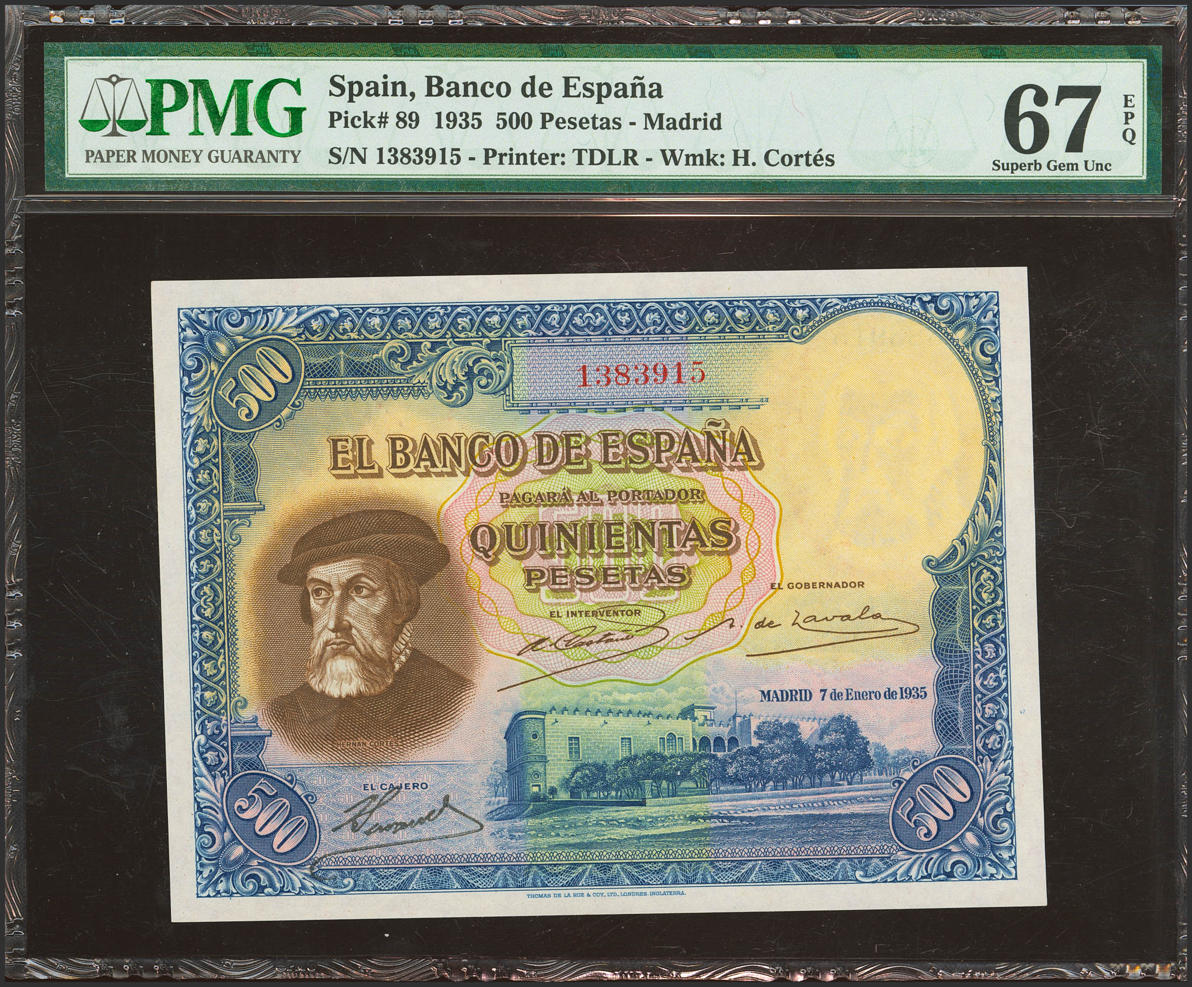 500 Pesetas. 7 de Enero de 1935. Sin serie. (Edifil 2017: 365). Extraordinariamente raro en esta calidad, apresto original. Encapsulado PMG67EPQ. SC.