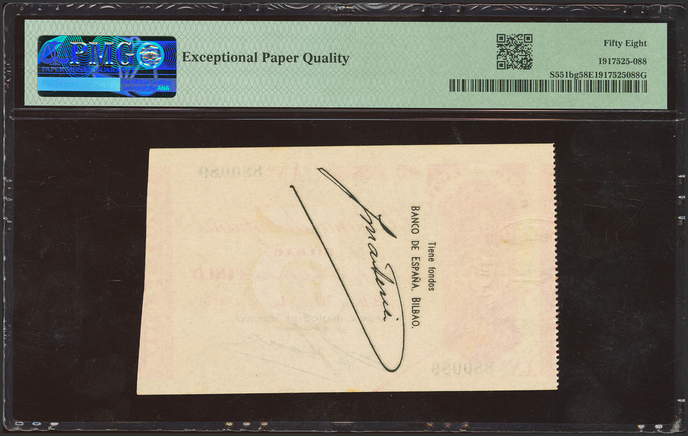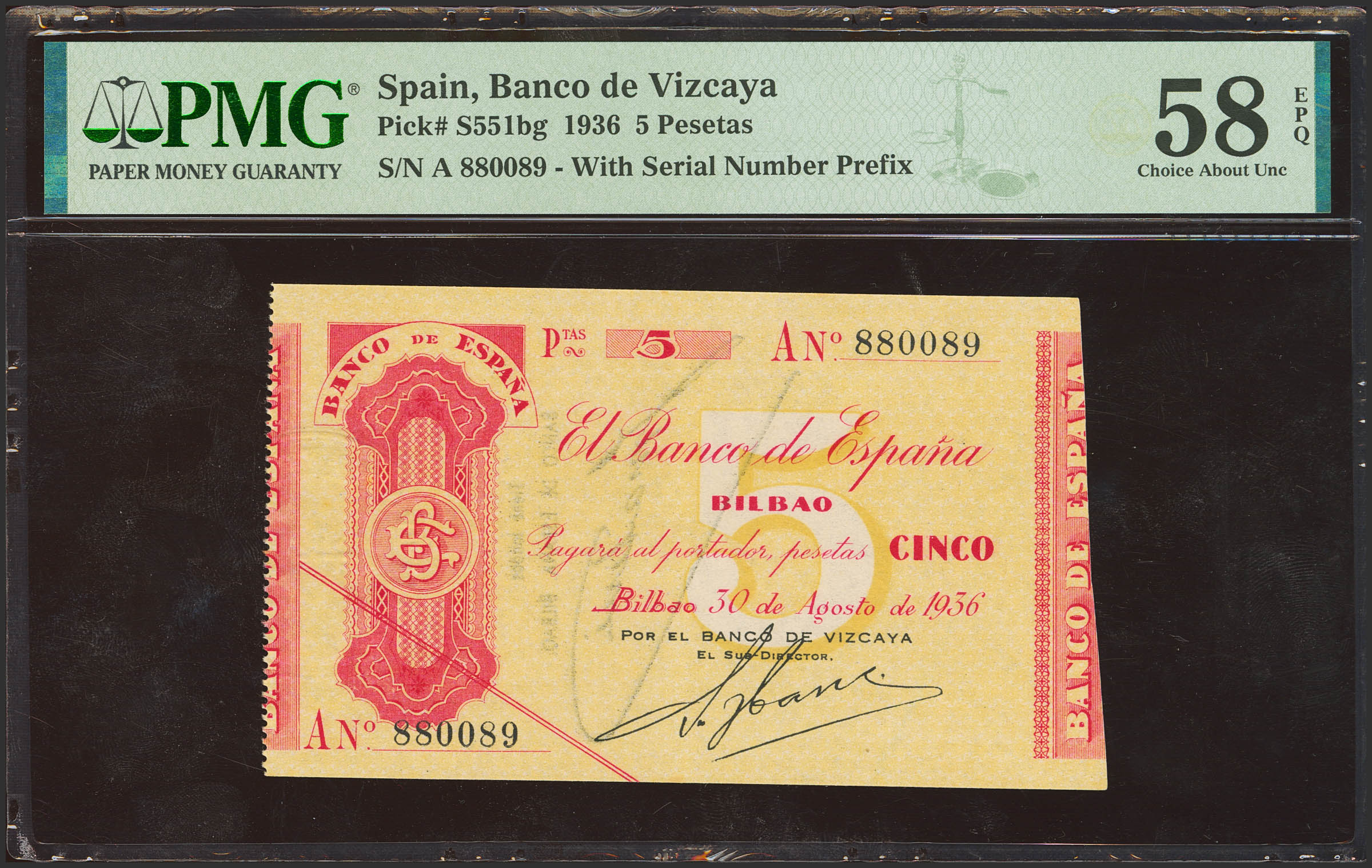 5 Pesetas. 30 de Agosto de 1936. Sucursal de Bilbao, antefirma del Banco de Vizcaya. Serie A. (Edifil 2023: 368Aa, Pick: S551bg). Inusual en esta excepcional calidad, especialmente con apresto original, ondulación que no llega a romper fibra. EBC+++. Encapsulado PMG58EPQ.