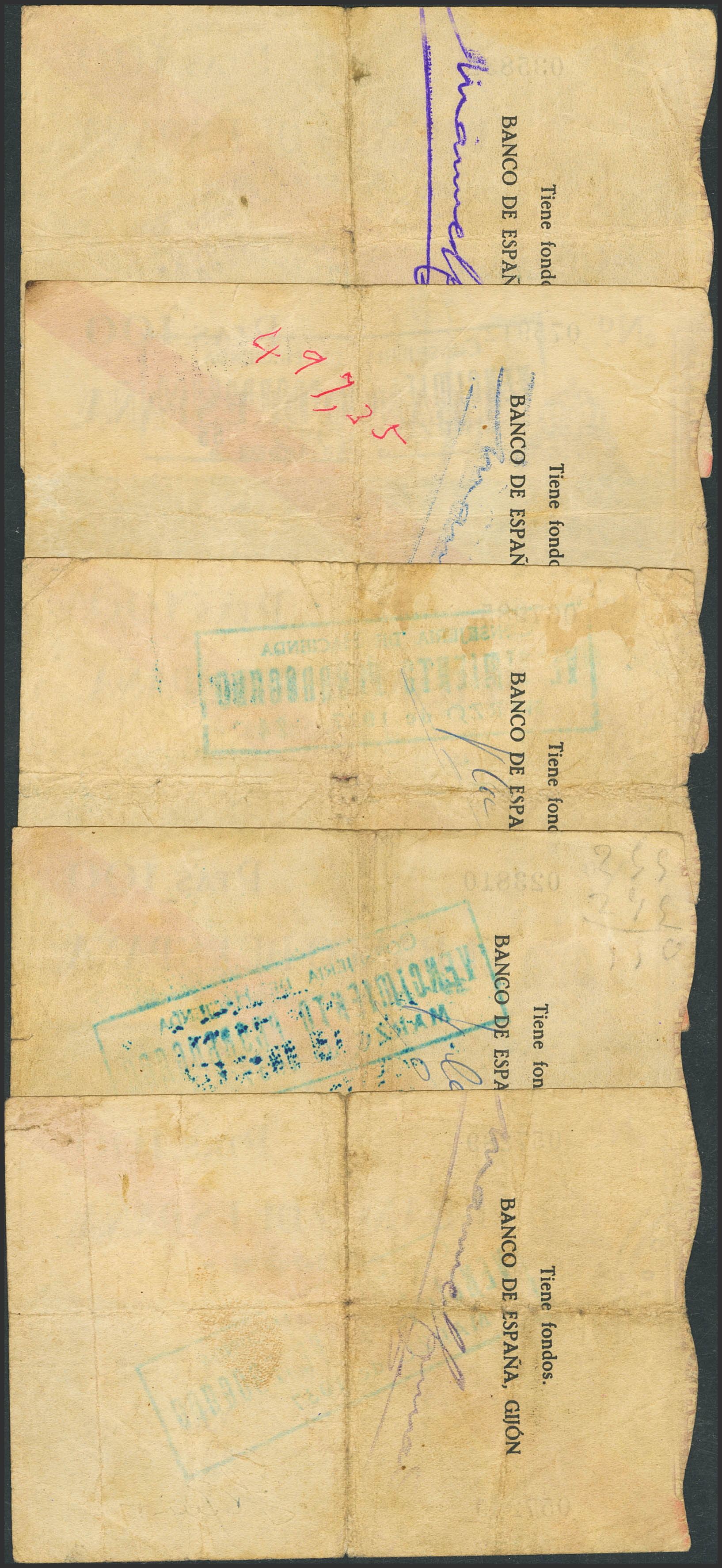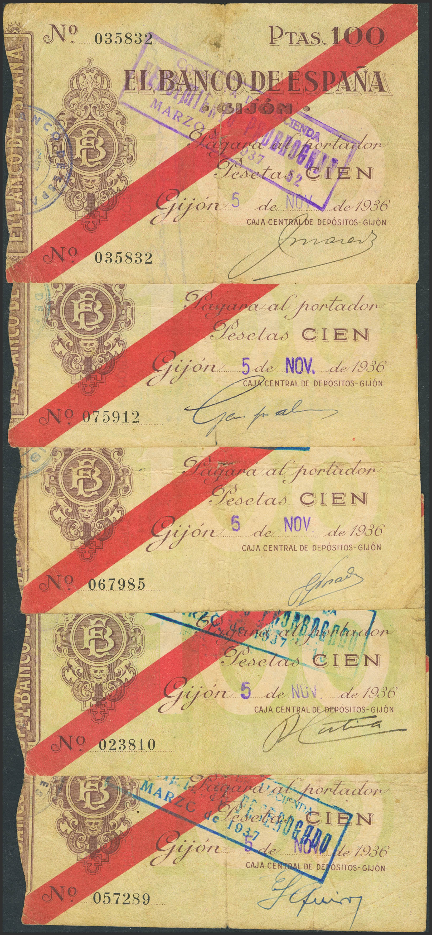 Conjunto de 5 billetes de 100 pesetas, emitidos el 5 Noviembre de 1936 de la sucursal de Gijón. (Edifil 2023: 384). MBC/MBC-.