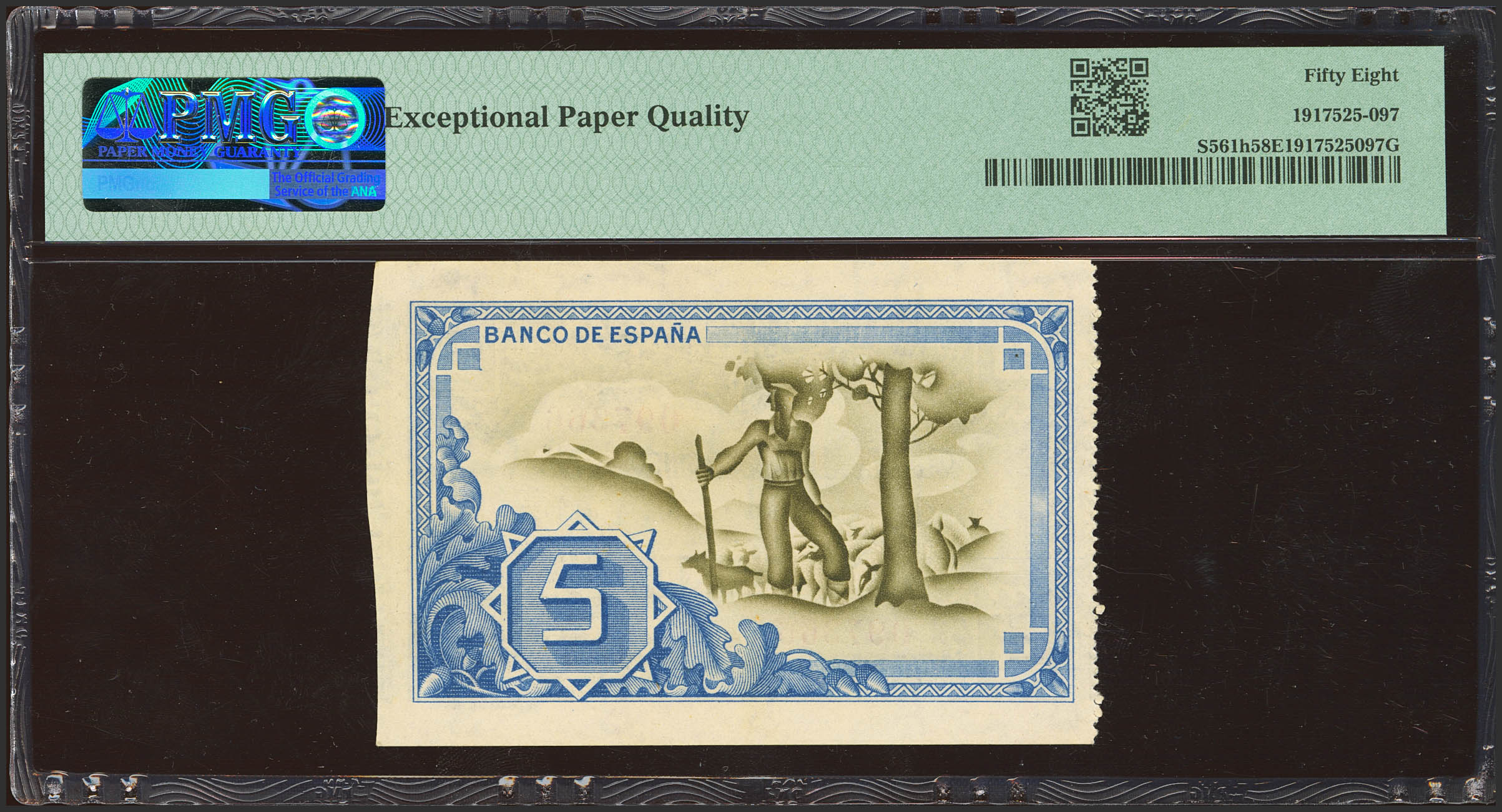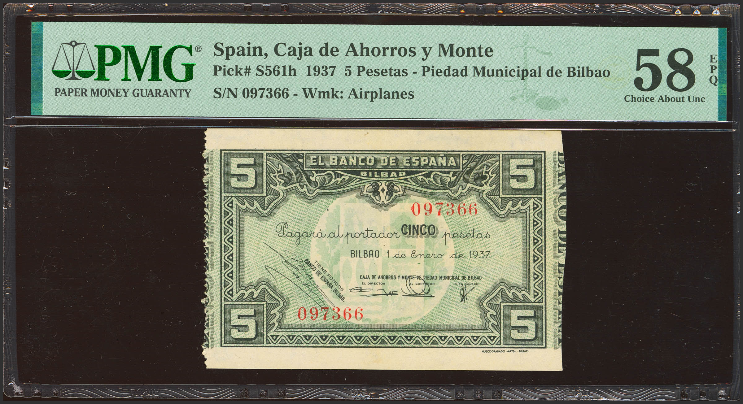 5 Pesetas. 1 de Enero de 1937. Sucursal de Bilbao, antefirma Caja de Ahorros y Monte de Piedad Municipal de Bilbao. Sin serie, con numeración y sin matrices. (Edifil 2023: 385a, Pick: S561h). Apresto original. SC. Encapsulado PMG58EPQ.