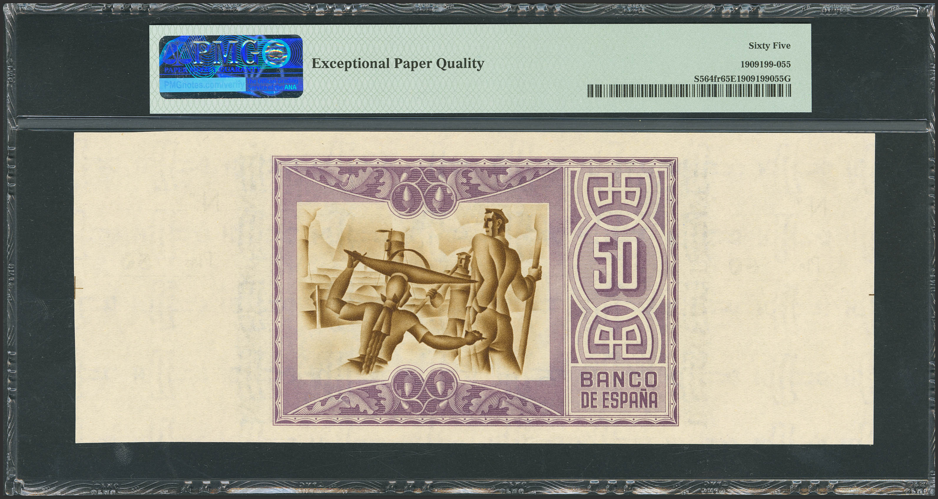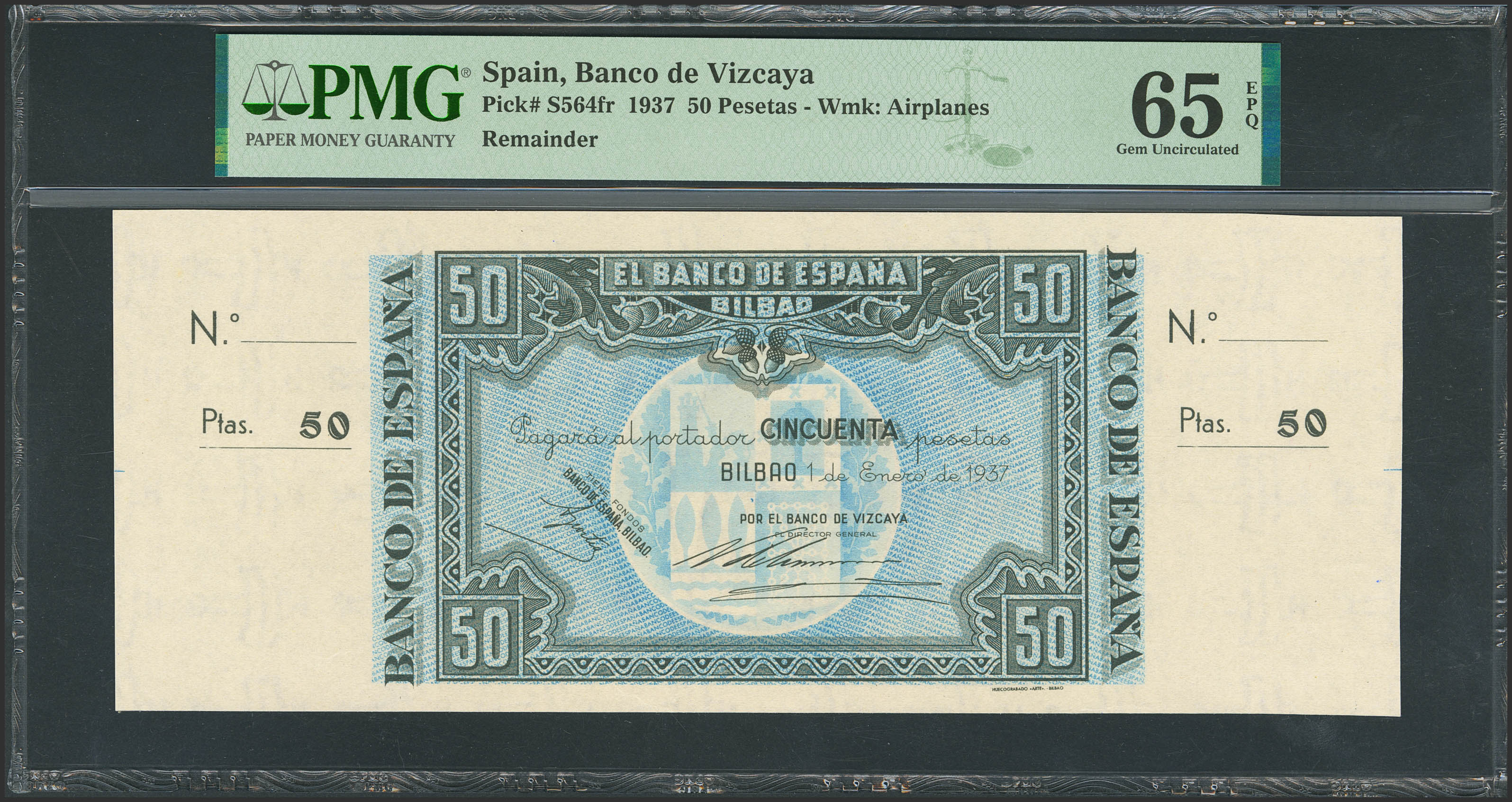 50 Pesetas. 1 de Enero de 1937. Sucursal de Bilbao, antefirma Banco de Vizcaya. Sin serie y sin numeración, con ambas matrices. (Edifil 2023: 389b, Pick: S564fr). Apresto original. SC. Encapsulado PMG65EPQ.