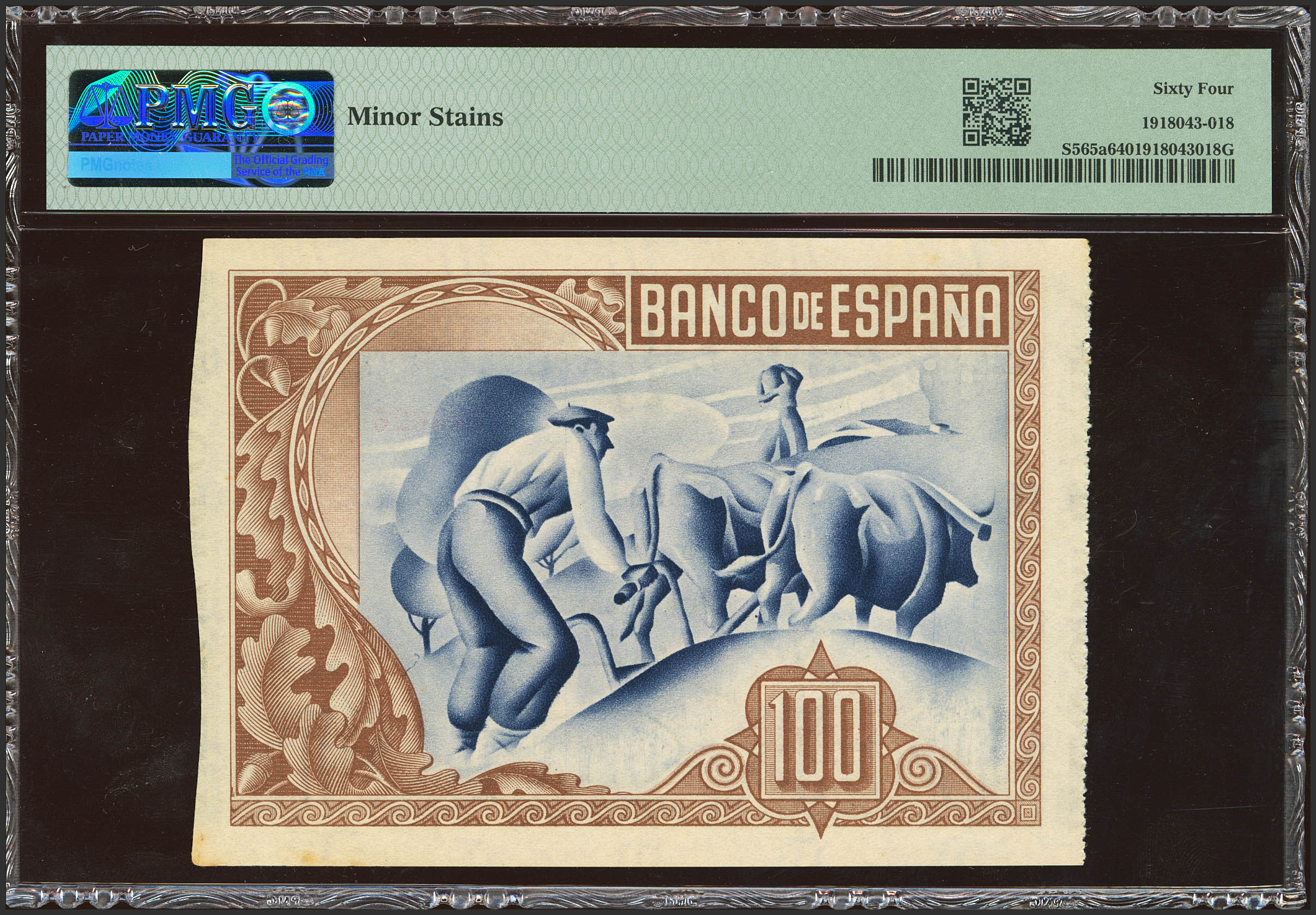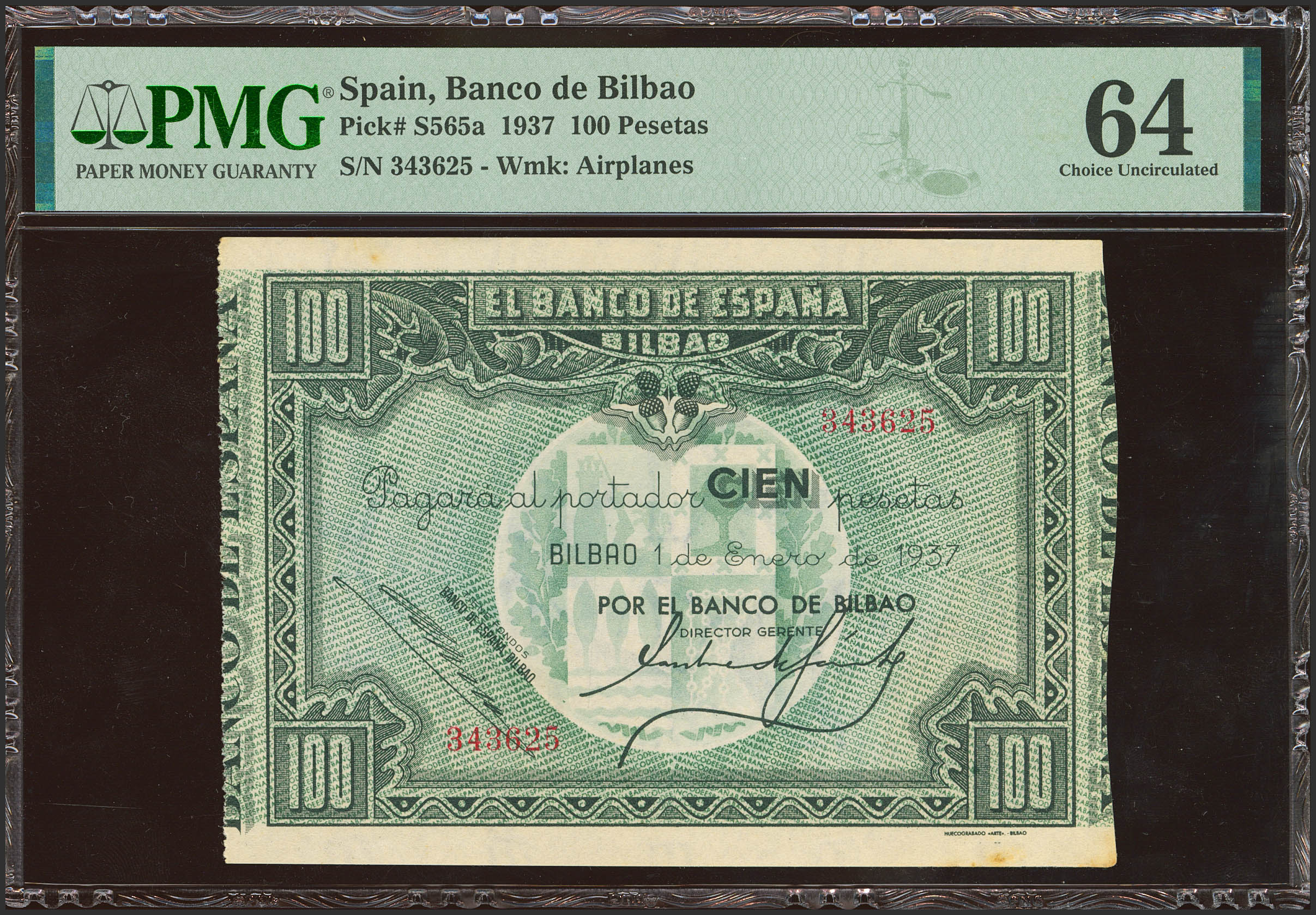 100 Pesetas. 1 de Enero de 1937. Sucursal de Bilbao, antefirma Banco de Bilbao. (Edifil 2023: 390a, Pick: S565a). Rarísimo en esta excepcional calidad, manchitas del tiempo habituales. SC-. Encapsulado PMG64 (minor stains)(para hacernos idea de la rareza, a fecha 1 de Junio de 2024, este billete es el séptimo mejor calificado junto a otros cuatro billetes en PMG)