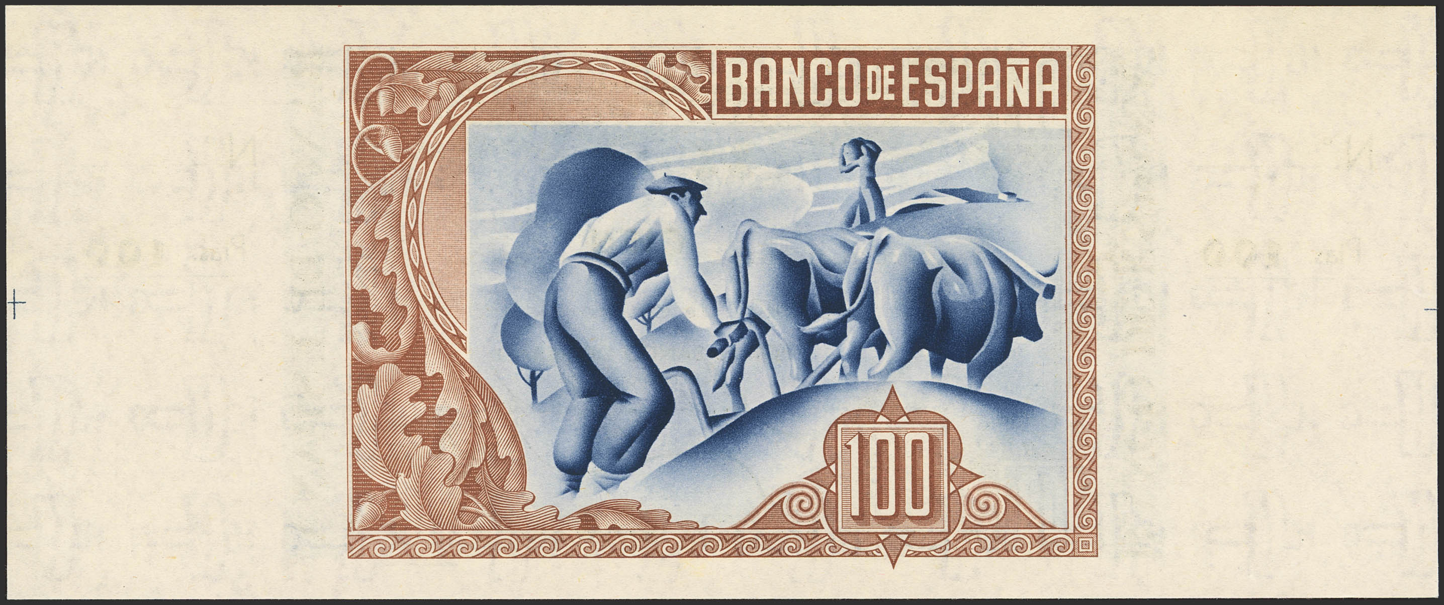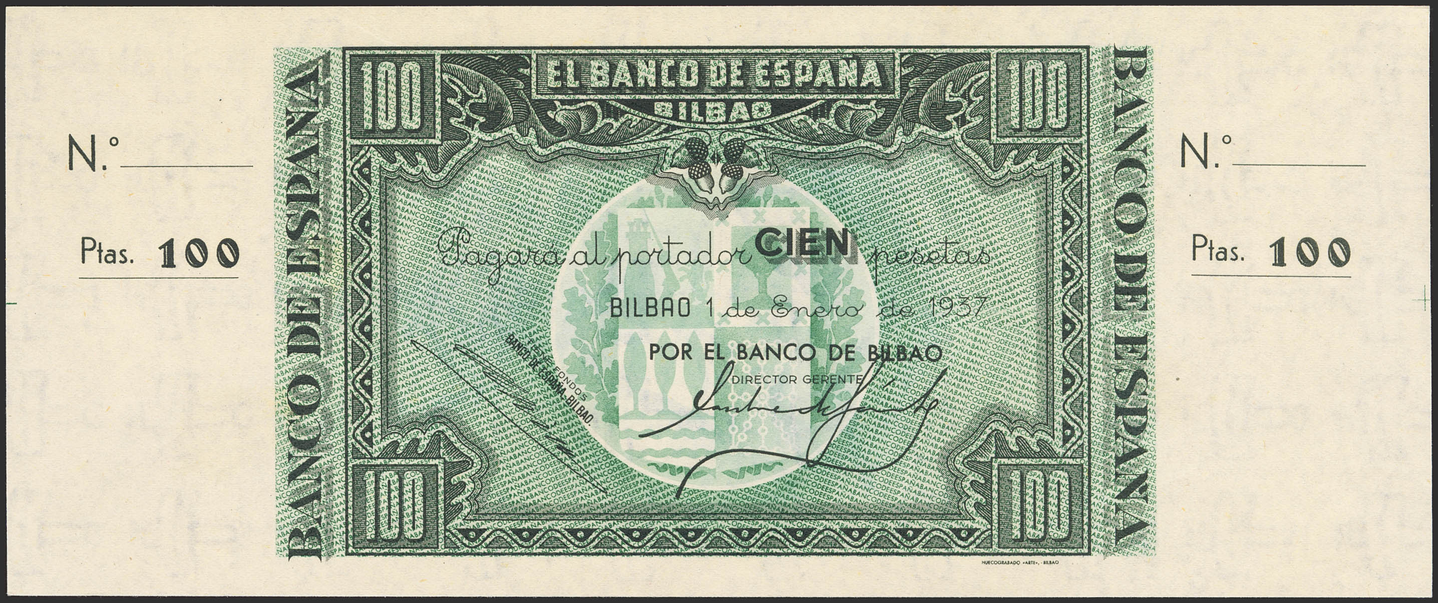 100 Pesetas. 1 de Enero de 1937. Sucursal de Bilbao, antefirma Banco de Bilbao. Sin serie y sin numeración, con ambas matrices. (Edifil 2023: 390a). Apresto original. SC.
