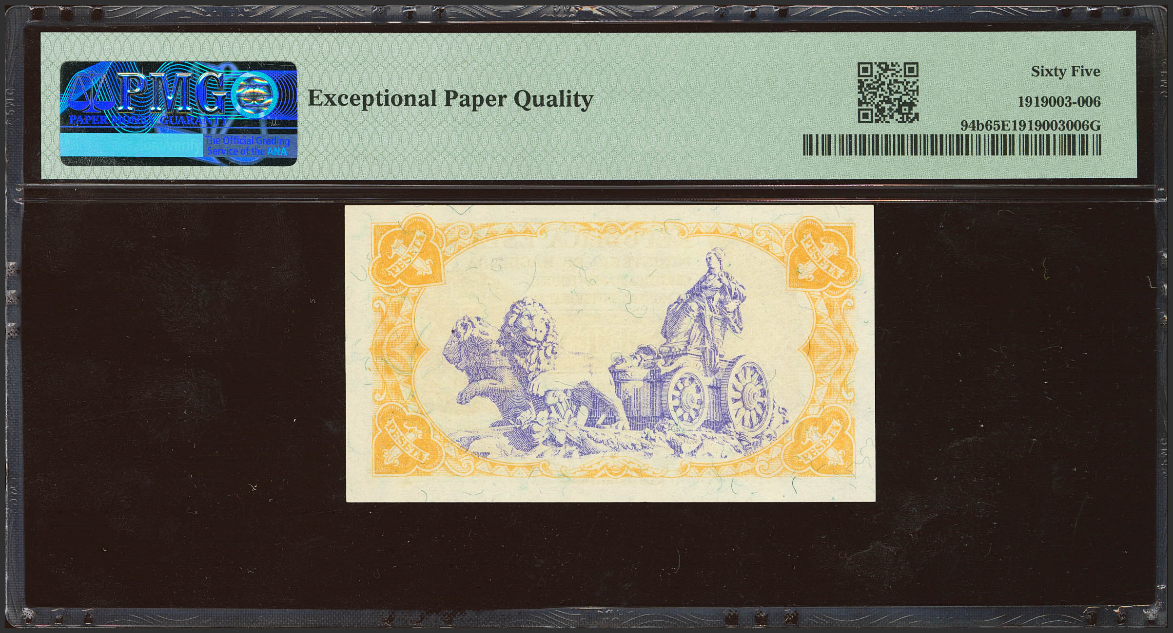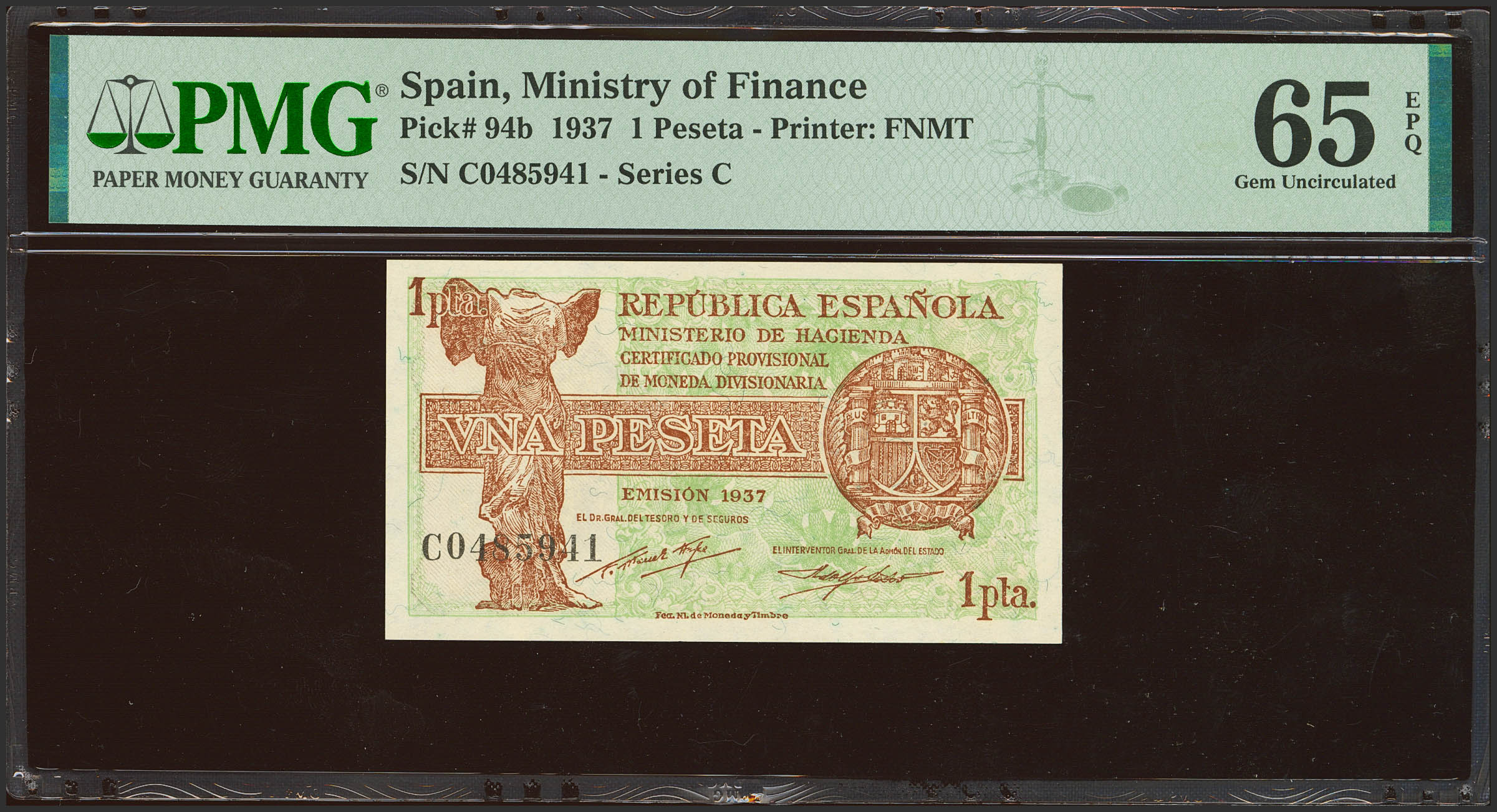 1 Peseta. 1937. Ministerio de Hacienda. Serie C, última serie emitida. (Edifil 2023: 392a, Pick: 94b). Rara serie sin circular, especialmente en esta excepcional calidad, apresto original. SC. Encapsulado PMG65EPQ.