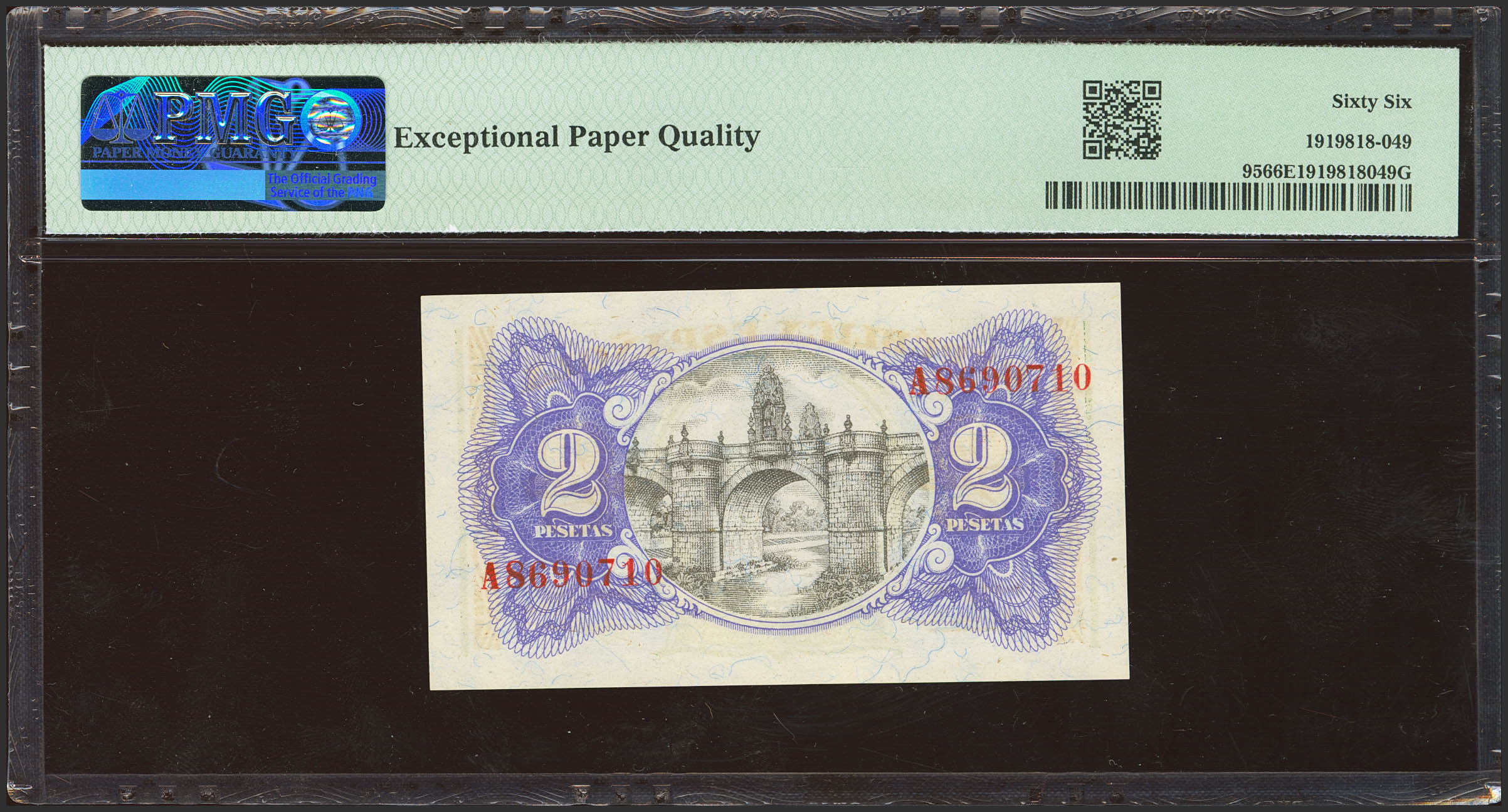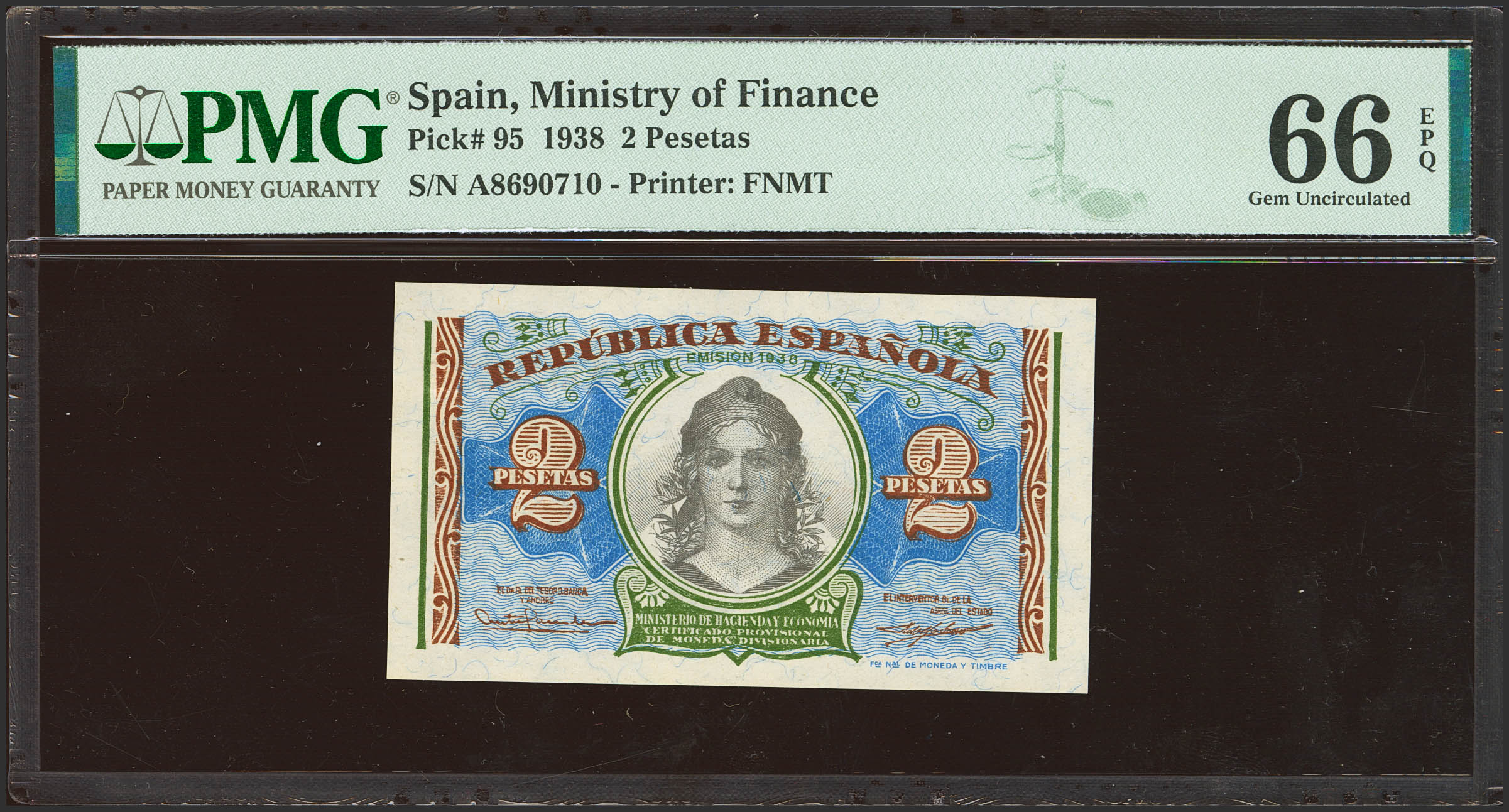 2 Pesetas. 1938. Ministerio de Hacienda. Serie A. (Edifil 2023: 393, Pick: 95). Apresto original. SC. Encapsulado PMG66EPQ.