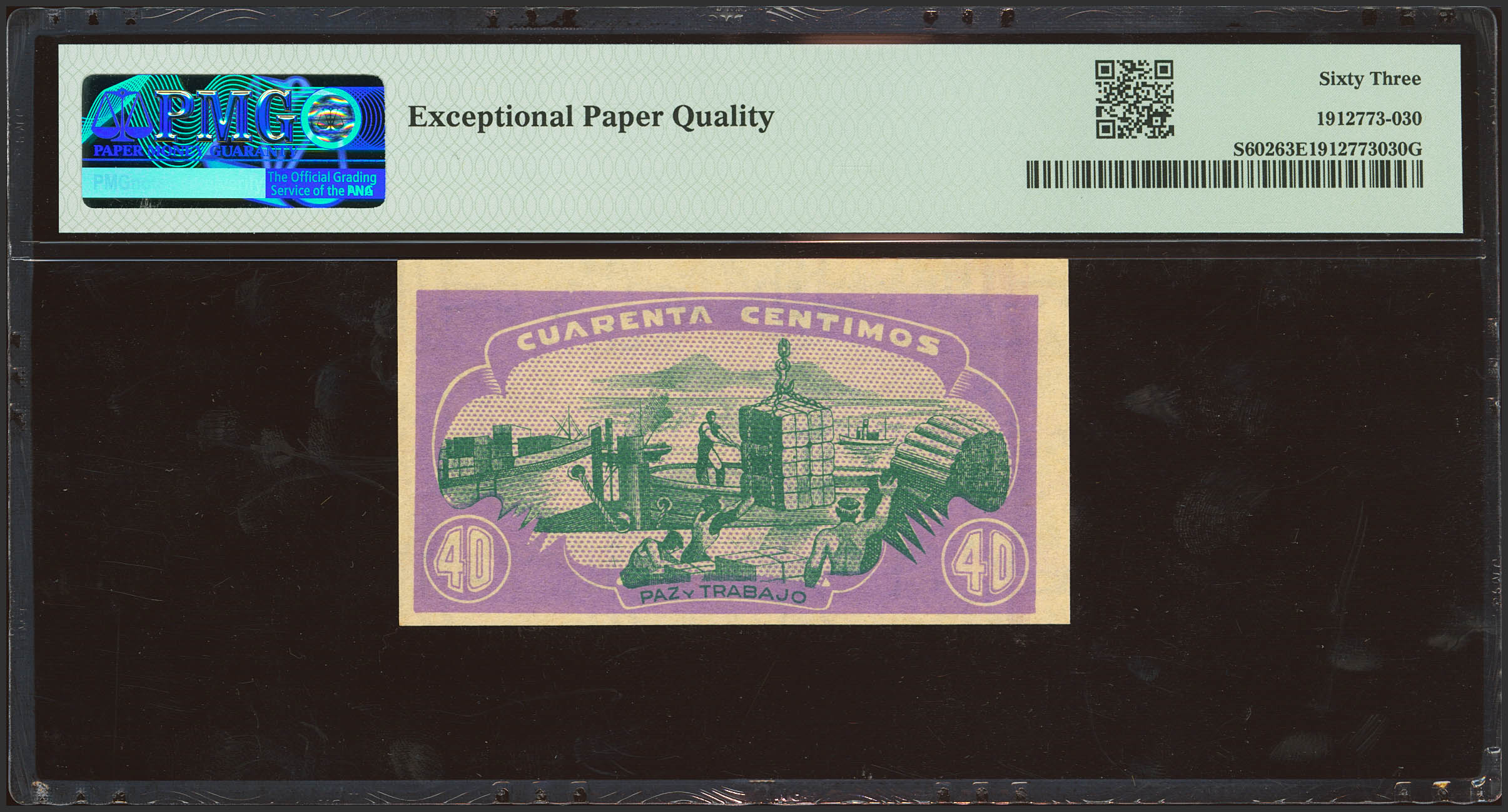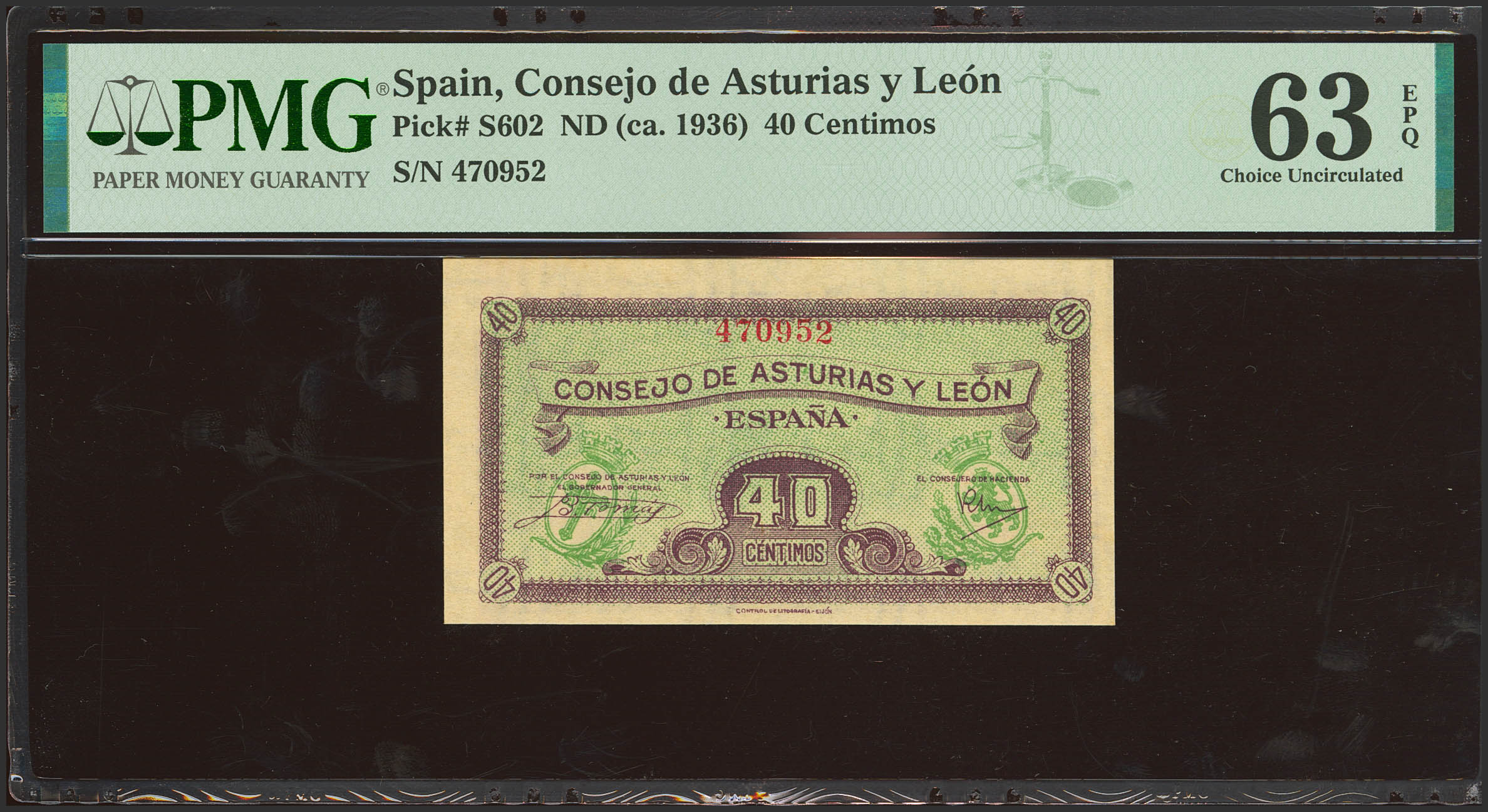 40 Céntimos. 1937. Asturias y León. Sin serie. (Edifil 2021: 395, Pick: S602). Raro en esta excepcional calidad, apresto original. SC. Encapsulado PMG63EPQ.