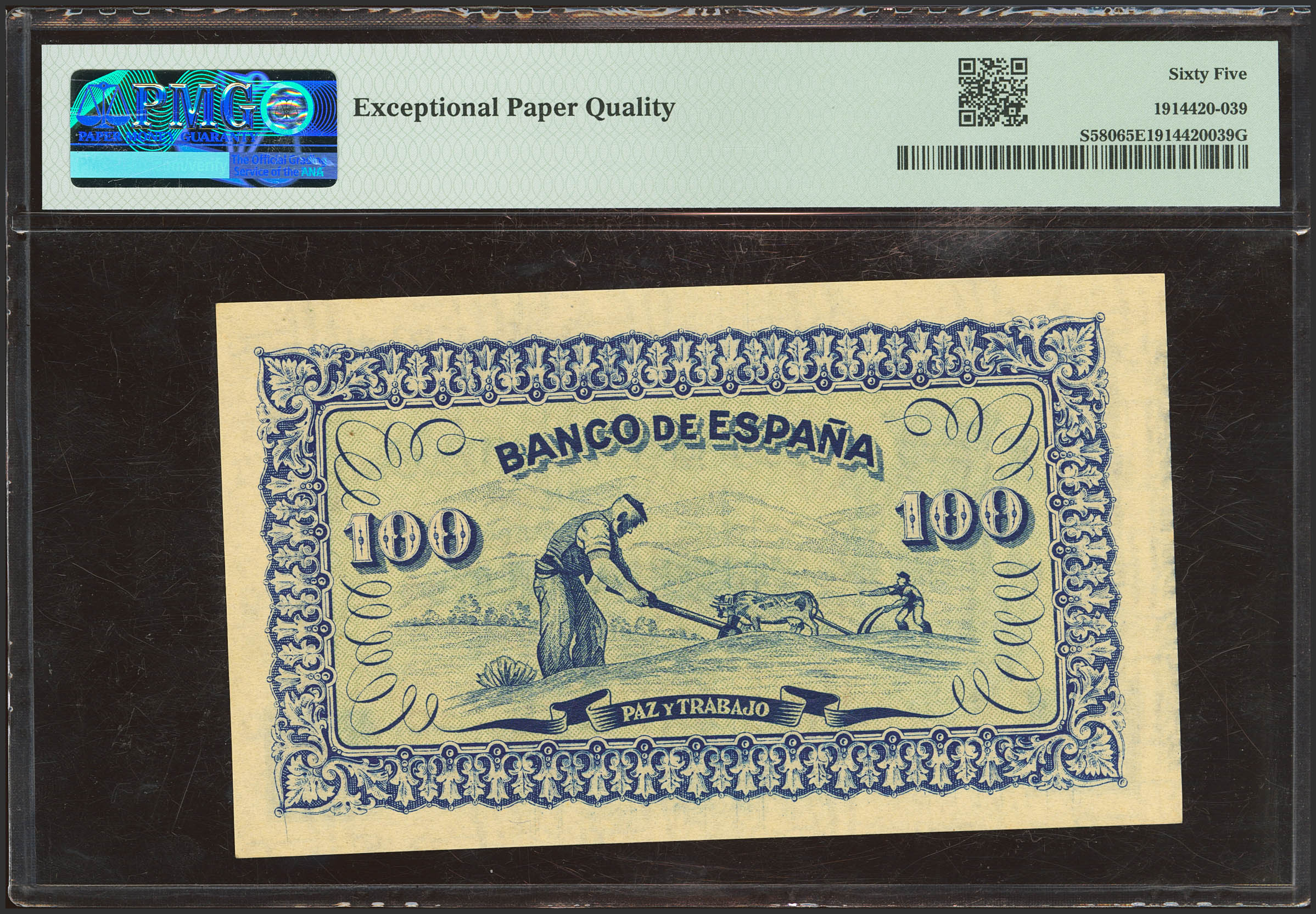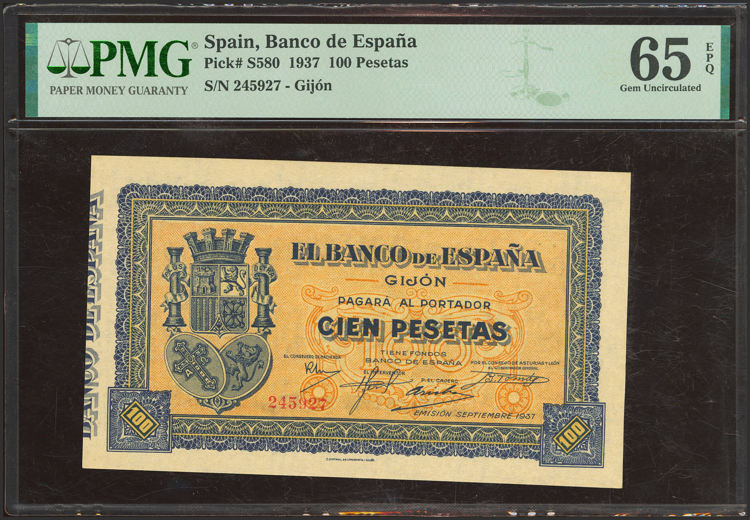 100 Pesetas. Septiembre 1937. Sucursal de Gijón. Sin serie. (Edifil 2021: 399, Pick: S580). Inusual en esta calidad, apresto original. SC. Encapsulado PMG65EPQ.