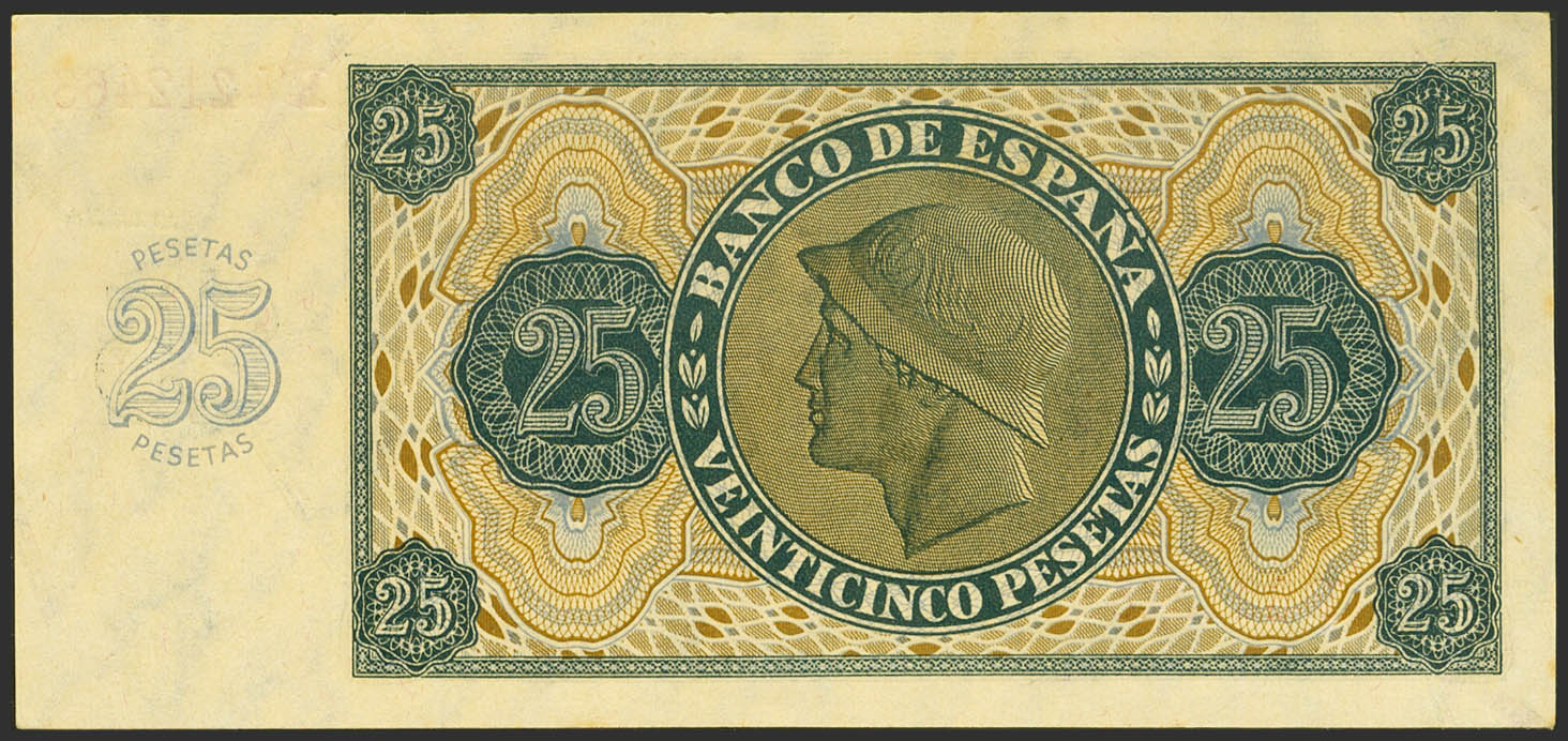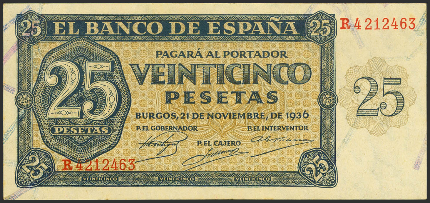 25 Pesetas. 21 de Noviembre de 1936. Serie R. (Edifil 2017: 419a). Conserva parte de su apresto original. SC-.