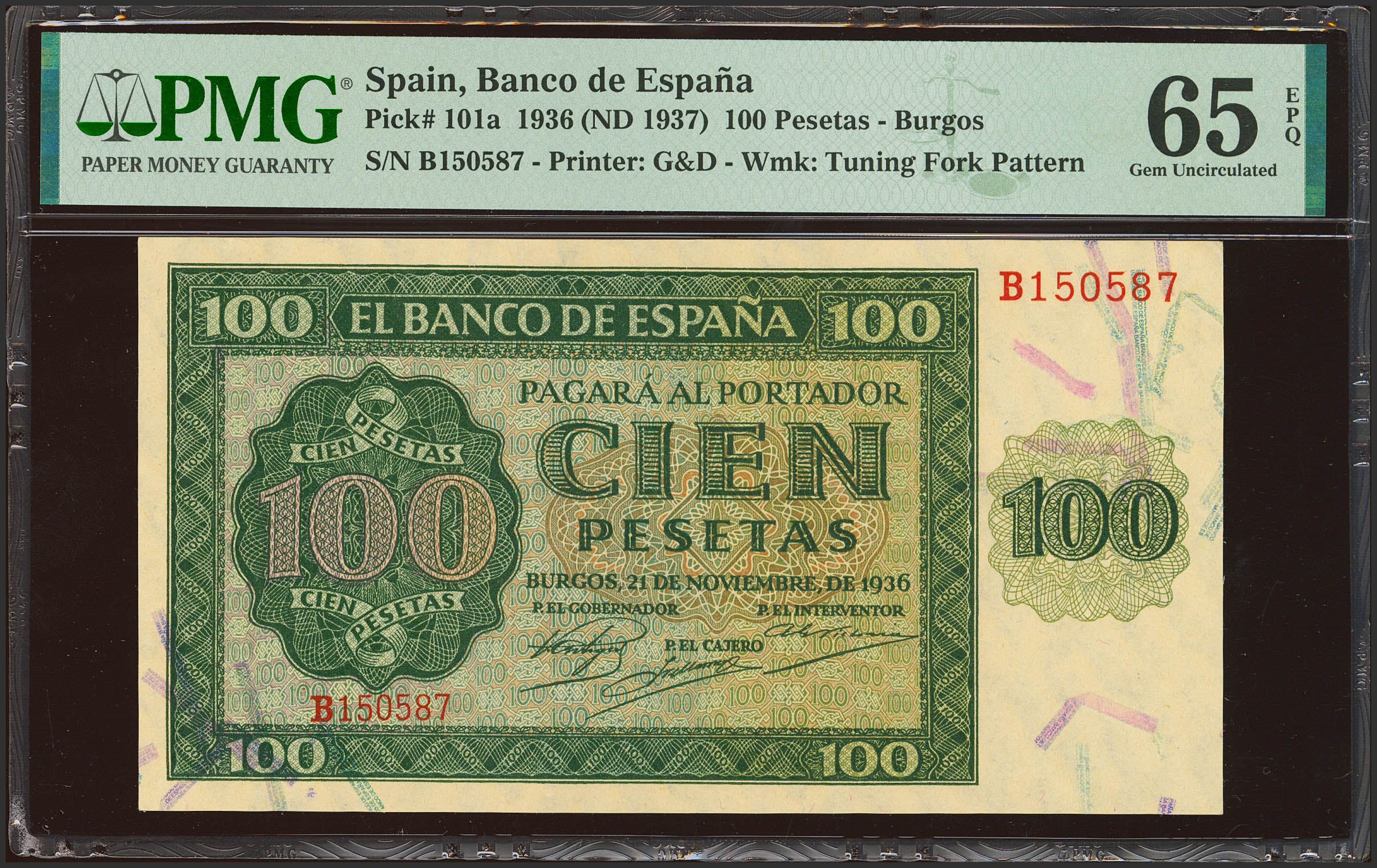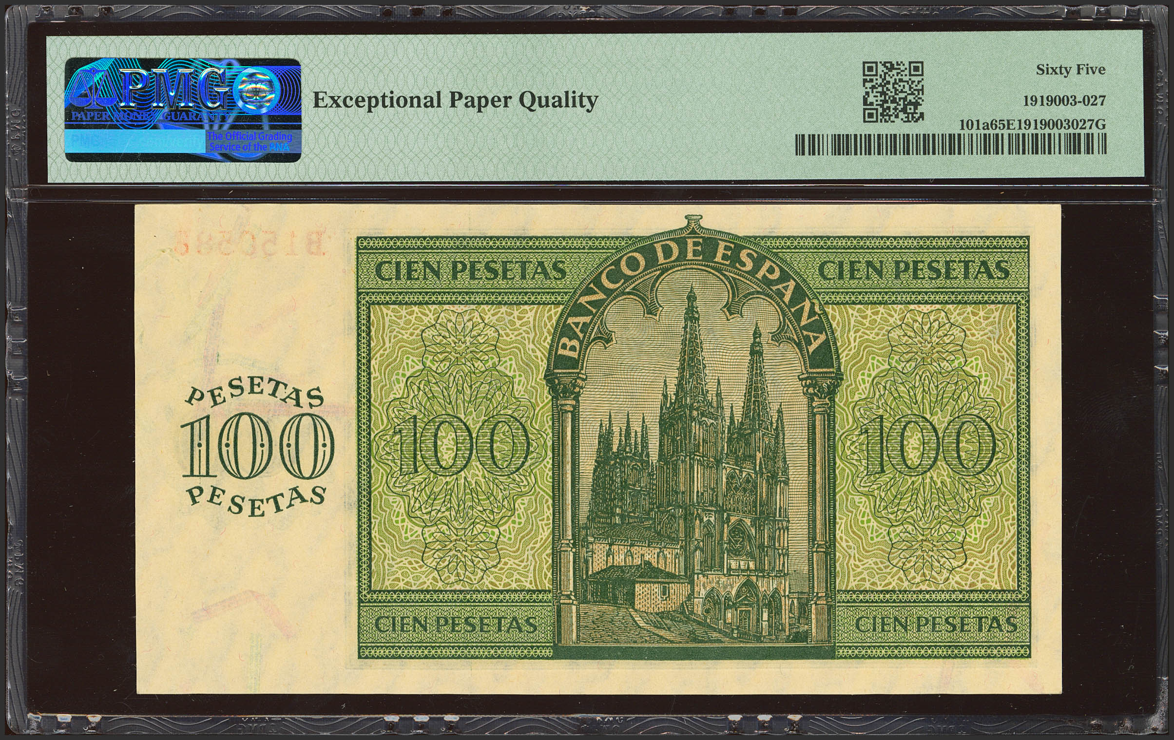 100 Pesetas. 21 de Noviembre de 1936. Serie B. (Edifil 2023: 421a, Pick: 101a). Raro en esta excepcional calidad, apresto original. SC. Encapsulado PMG65EPQ.
