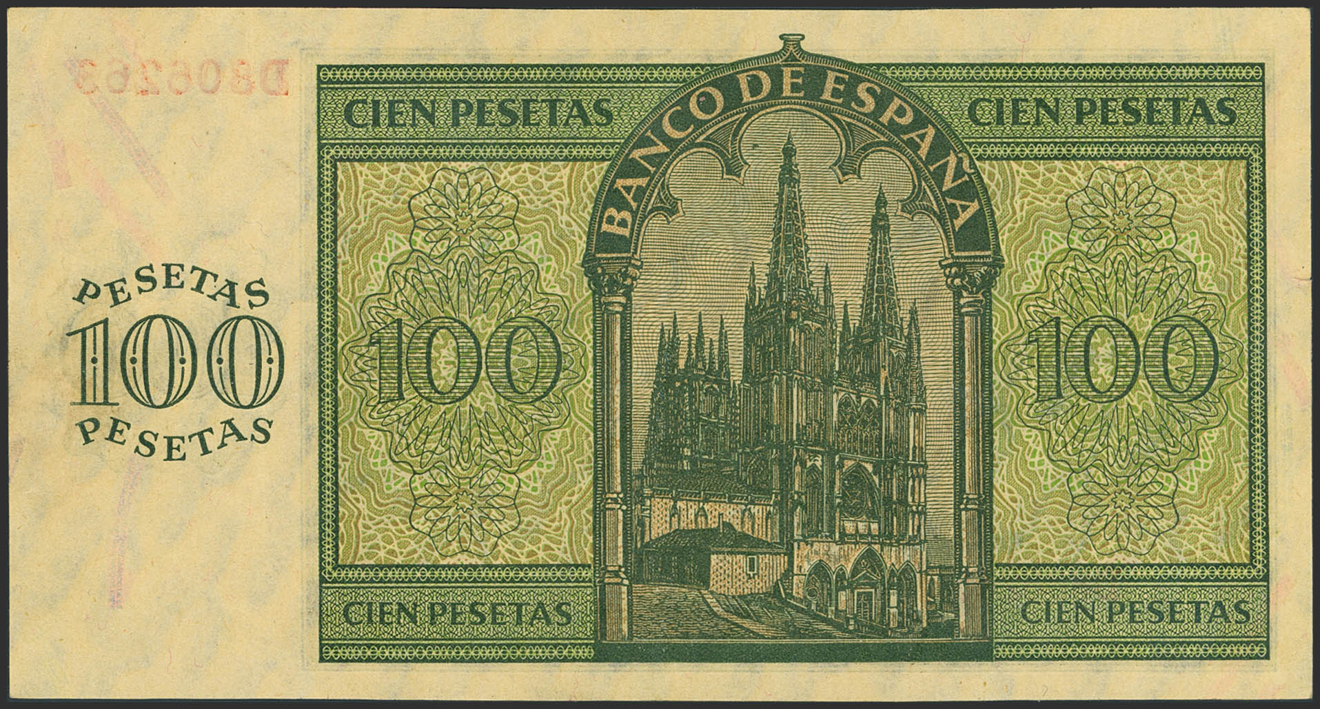 100 Pesetas. 21 de Noviembre de 1936. Serie D. (Edifil 2023: 421a). Conserva parte de su apresto original. EBC.