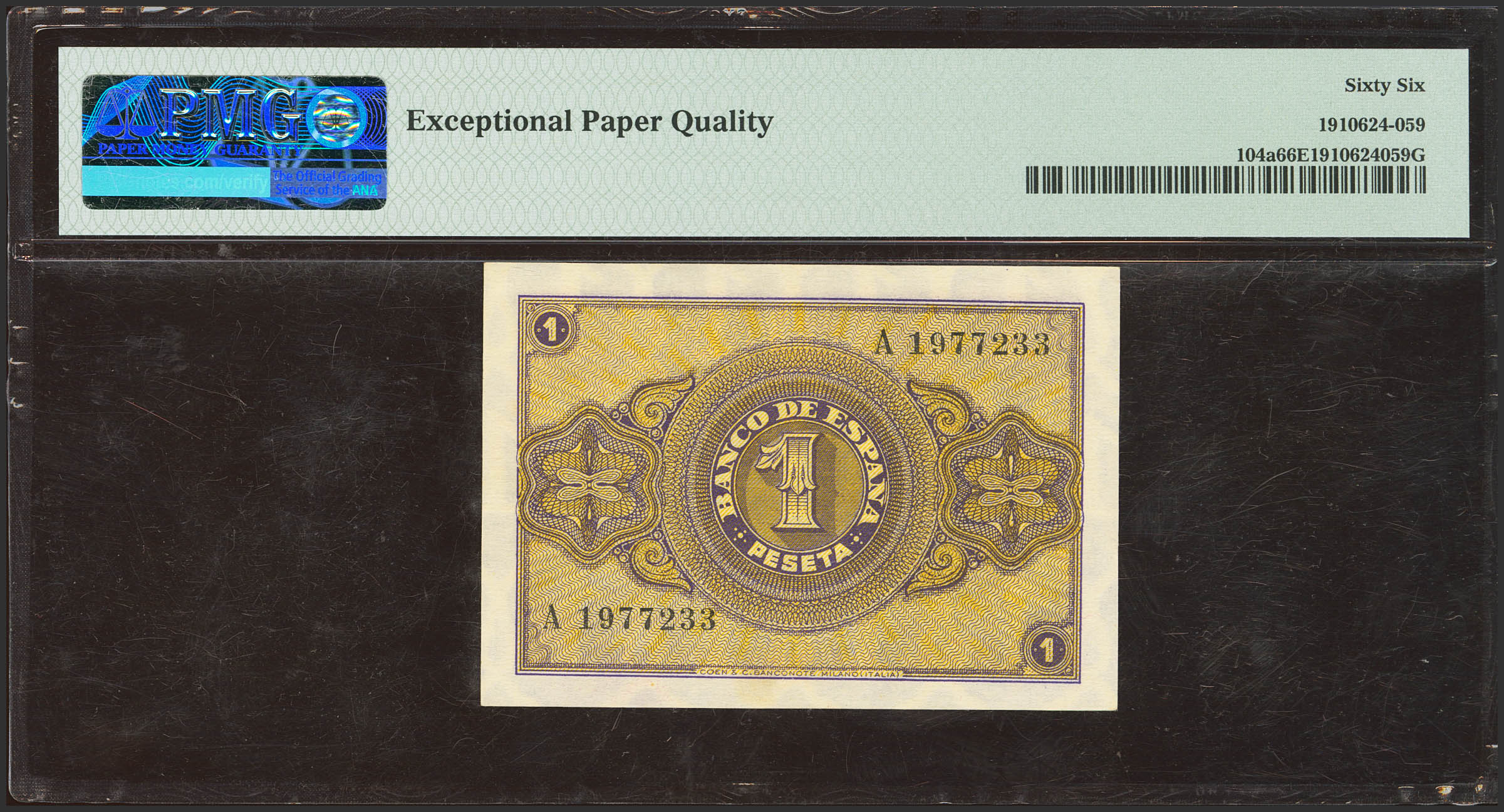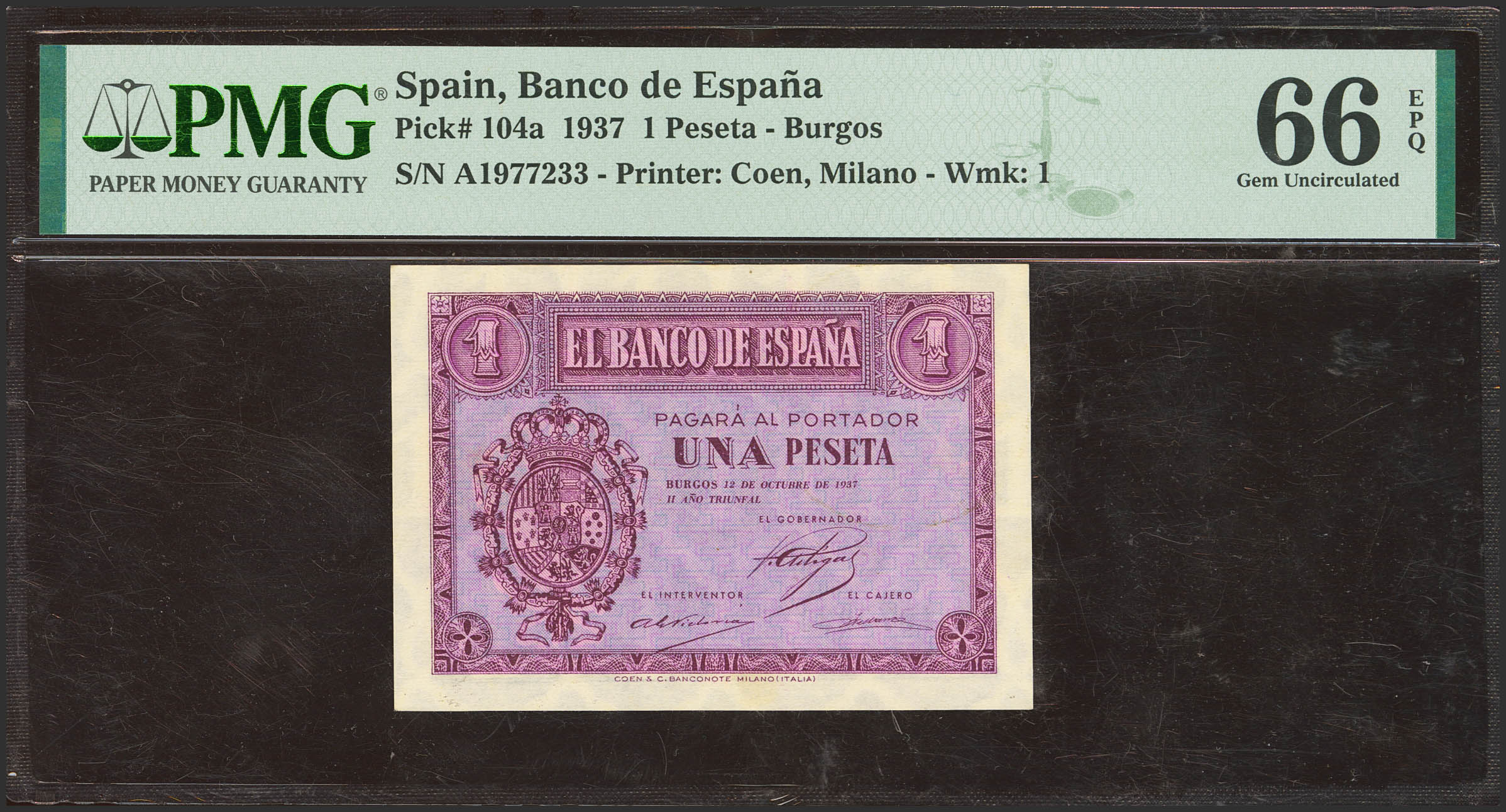 1 Peseta. 12 de Octubre de 1937. Serie A. (Edifil 2023: 425, Pick: 104a). Inusual en esta excepcional calidad, apresto original. SC. Encapsulado PMG66EPQ.