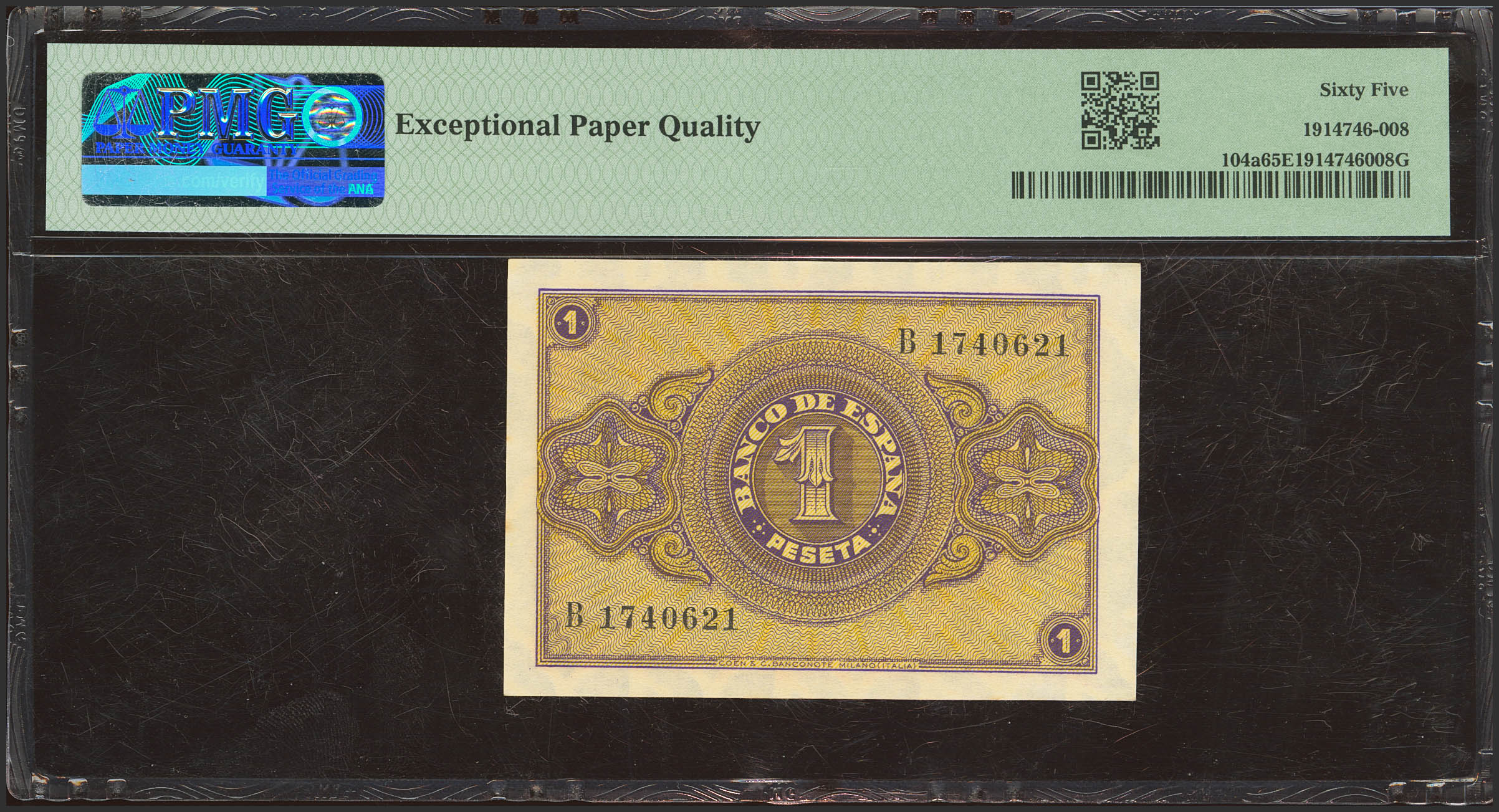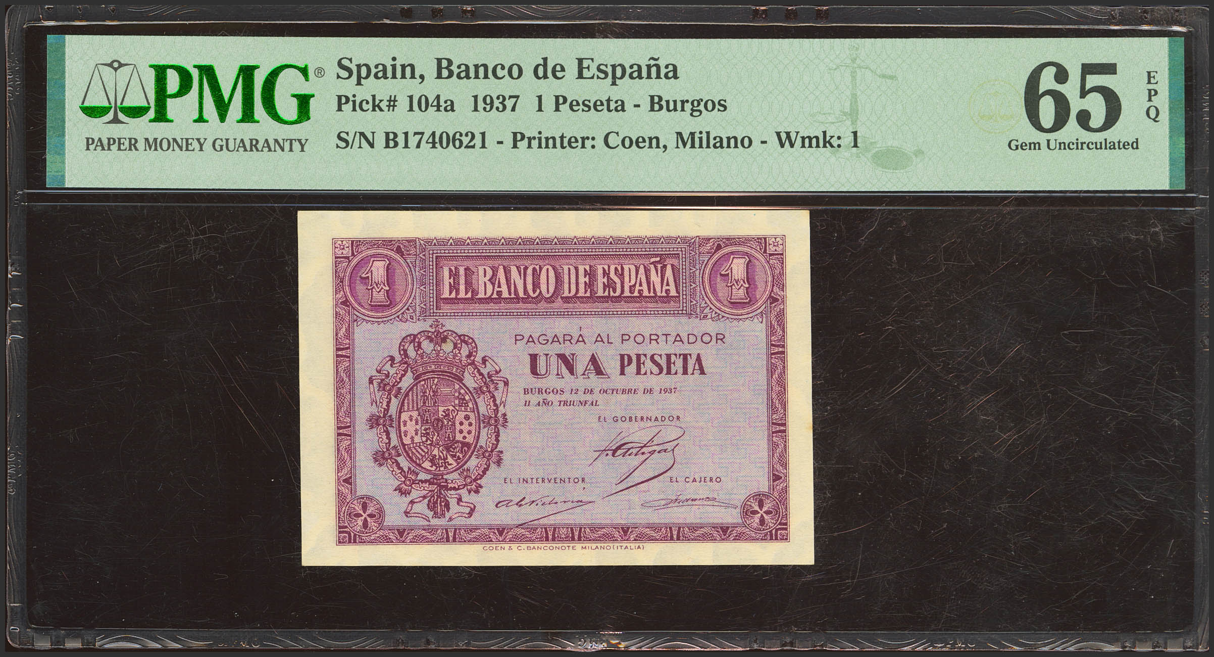 1 Peseta. 12 de Octubre de 1937. Serie B. (Edifil 2021: 425a, Pick: 104a). Apresto original. SC. Encapsulado PMG65EPQ.