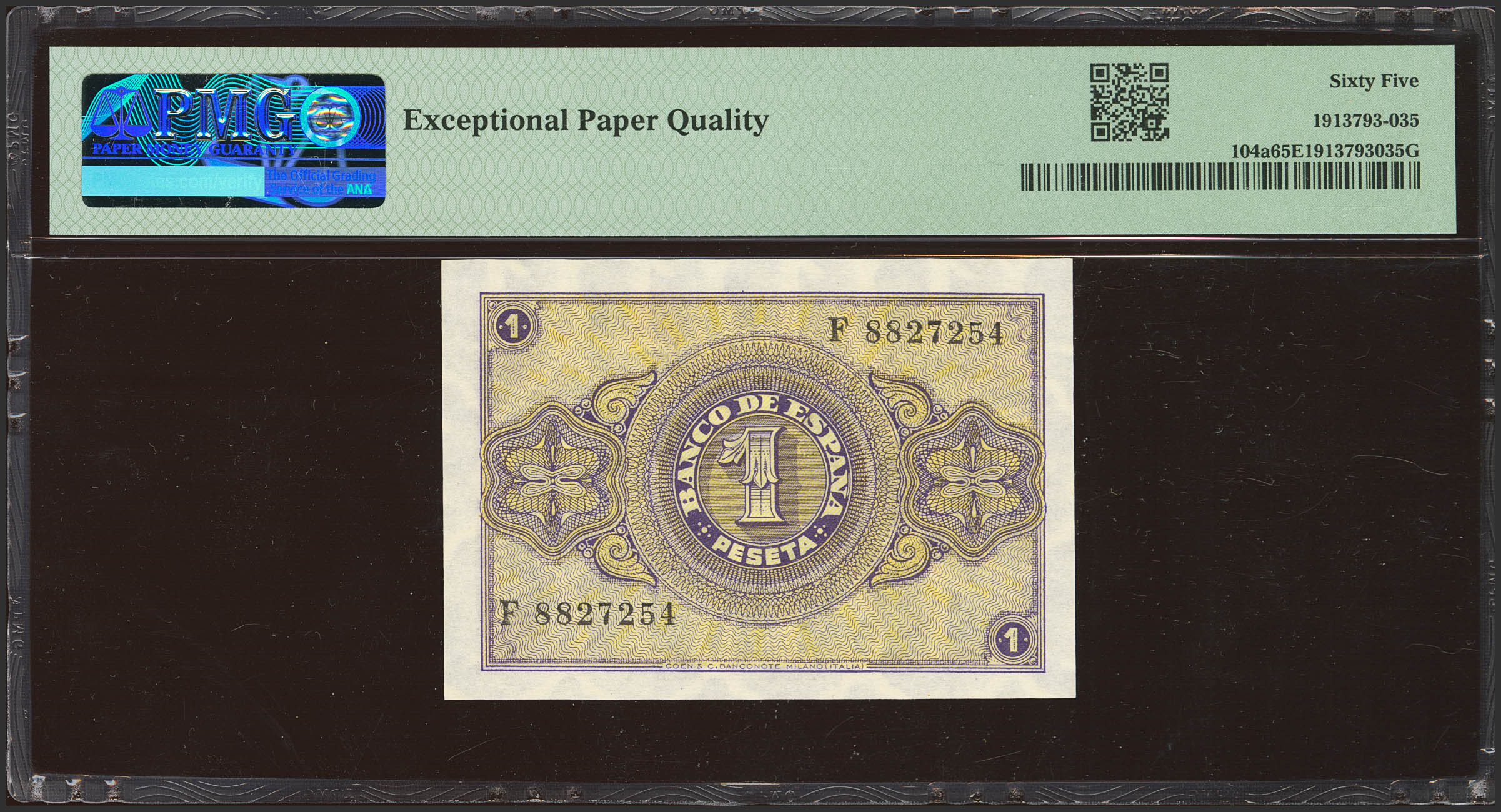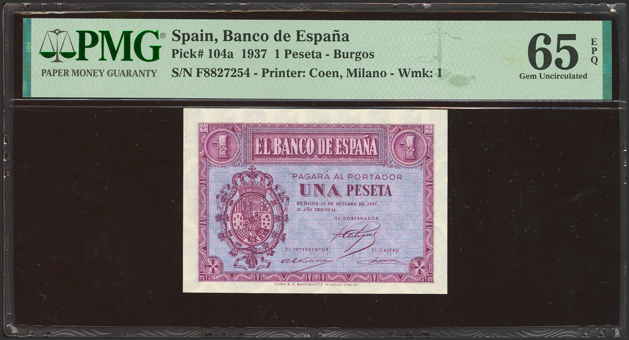 1 Peseta. 12 de Octubre de 1937. Serie F, última serie emitida. (Edifil 2023: 425b, Pick: 104a). Apresto original. SC. Encapsulado PMG65EPQ.