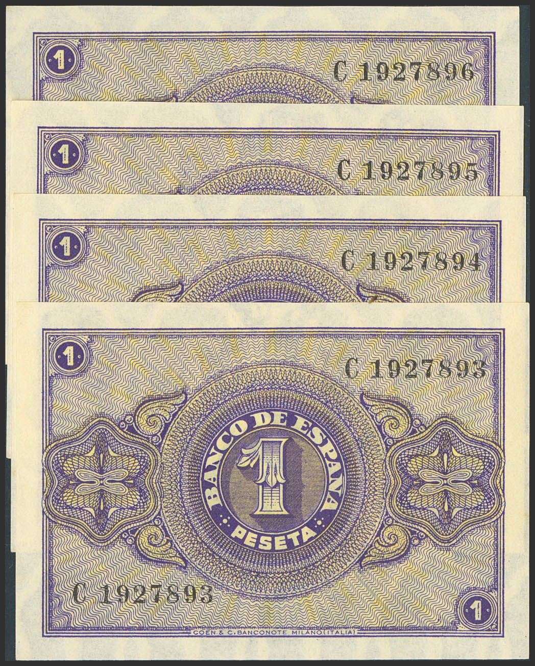 Conjunto de 4 billetes correlativos de 1 Peseta emitidos el 28 de Febrero de 1938, todos ellos con la serie C (Edifil 2023: 427a), apresto orginal. SC.
