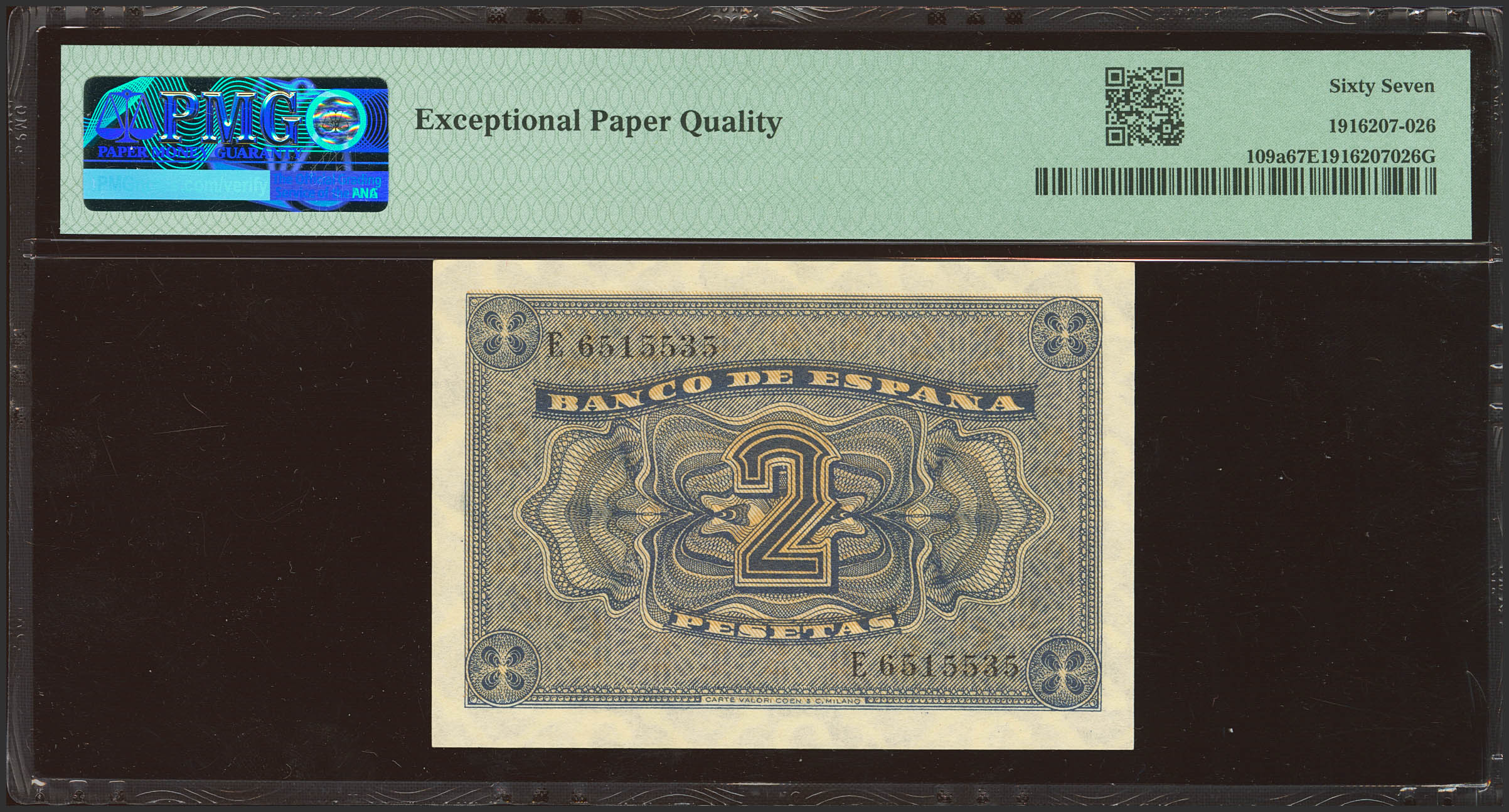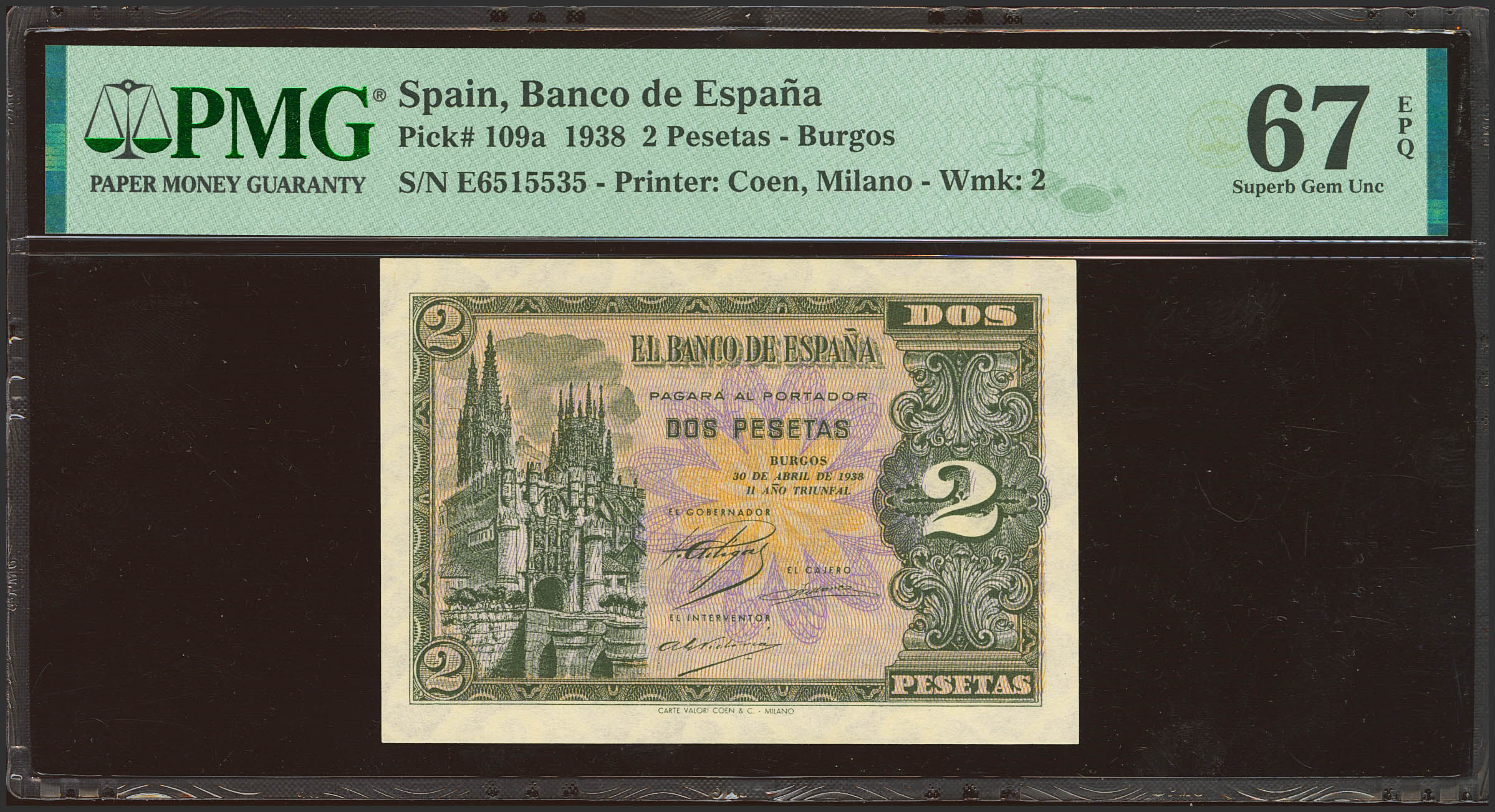 2 Pesetas. 30 de Abril de 1938. Serie E. (Edifil 2023: 429a, Pick: 109a). Apresto original. SC. Encapsulado PMG67EPQ.