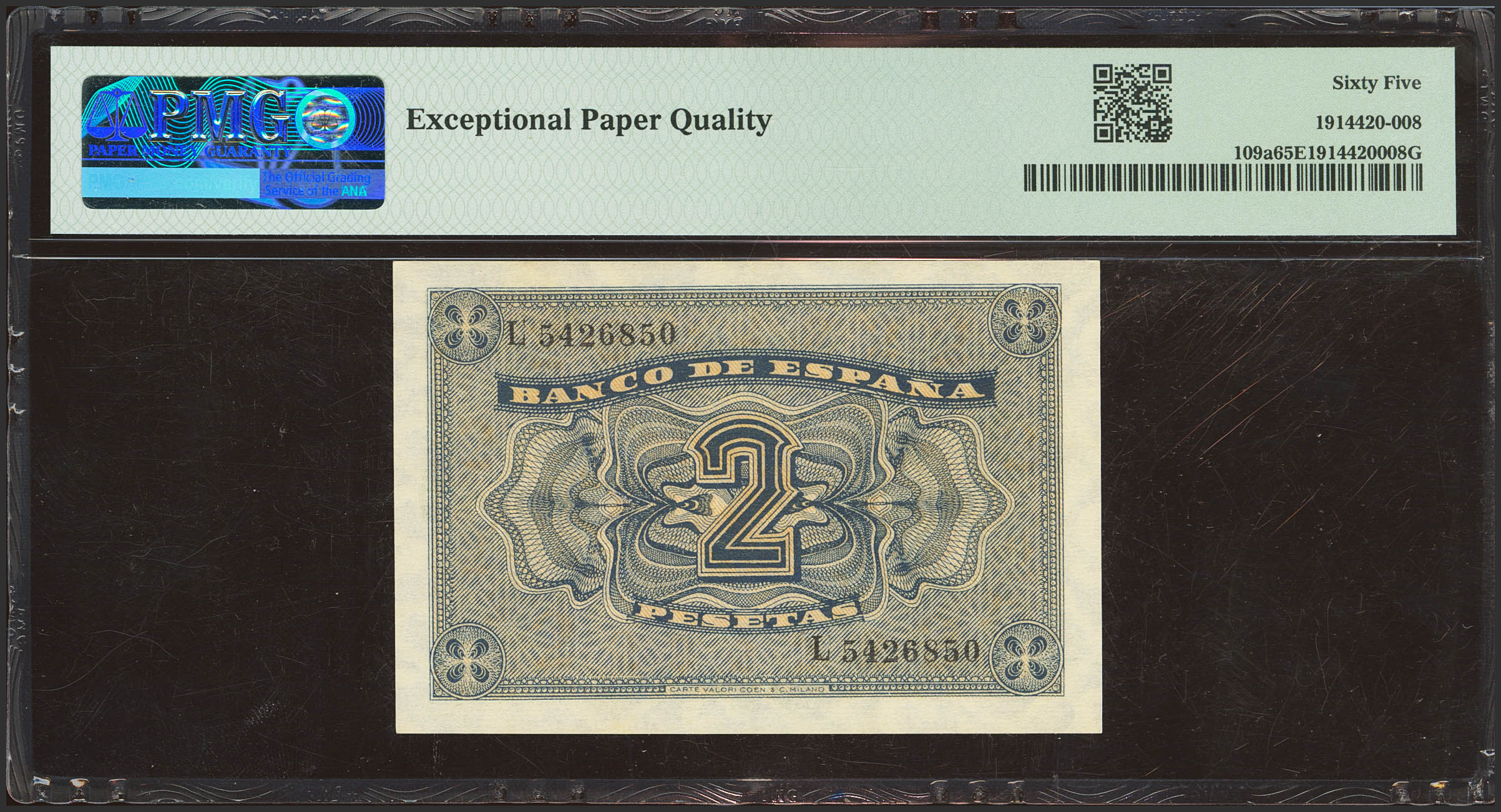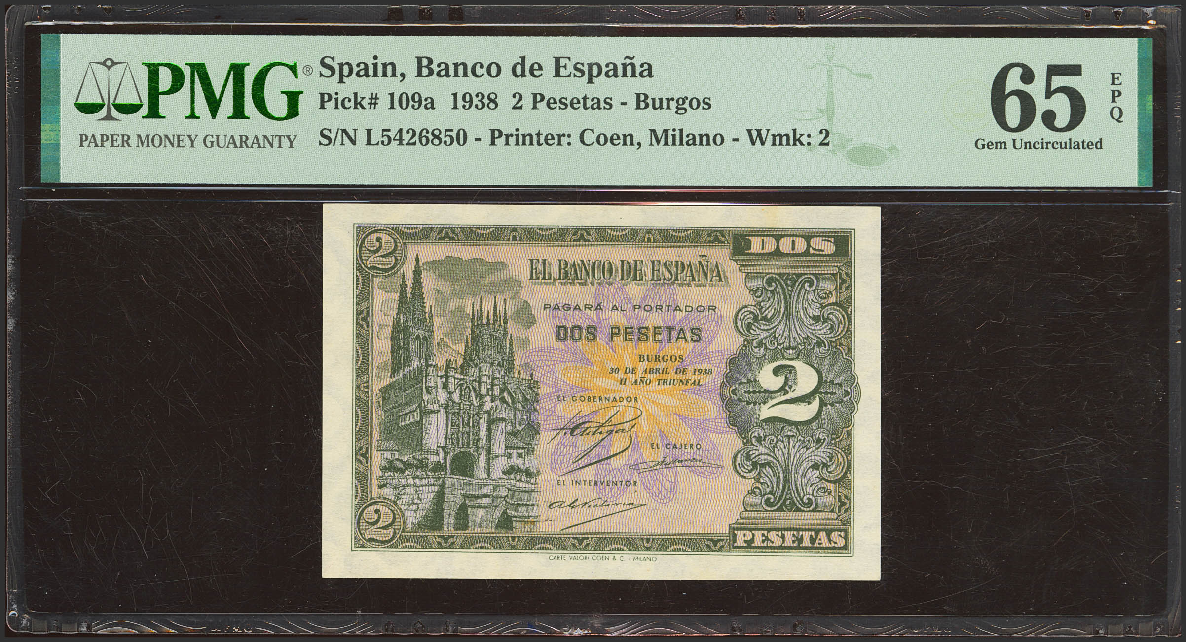 2 Pesetas. 30 de Abril de 1938. Serie L. (Edifil 2017: 429a). Apresto original. SC. Encapsulado PMG65EPQ.