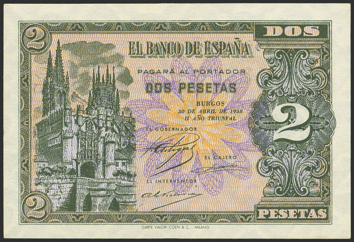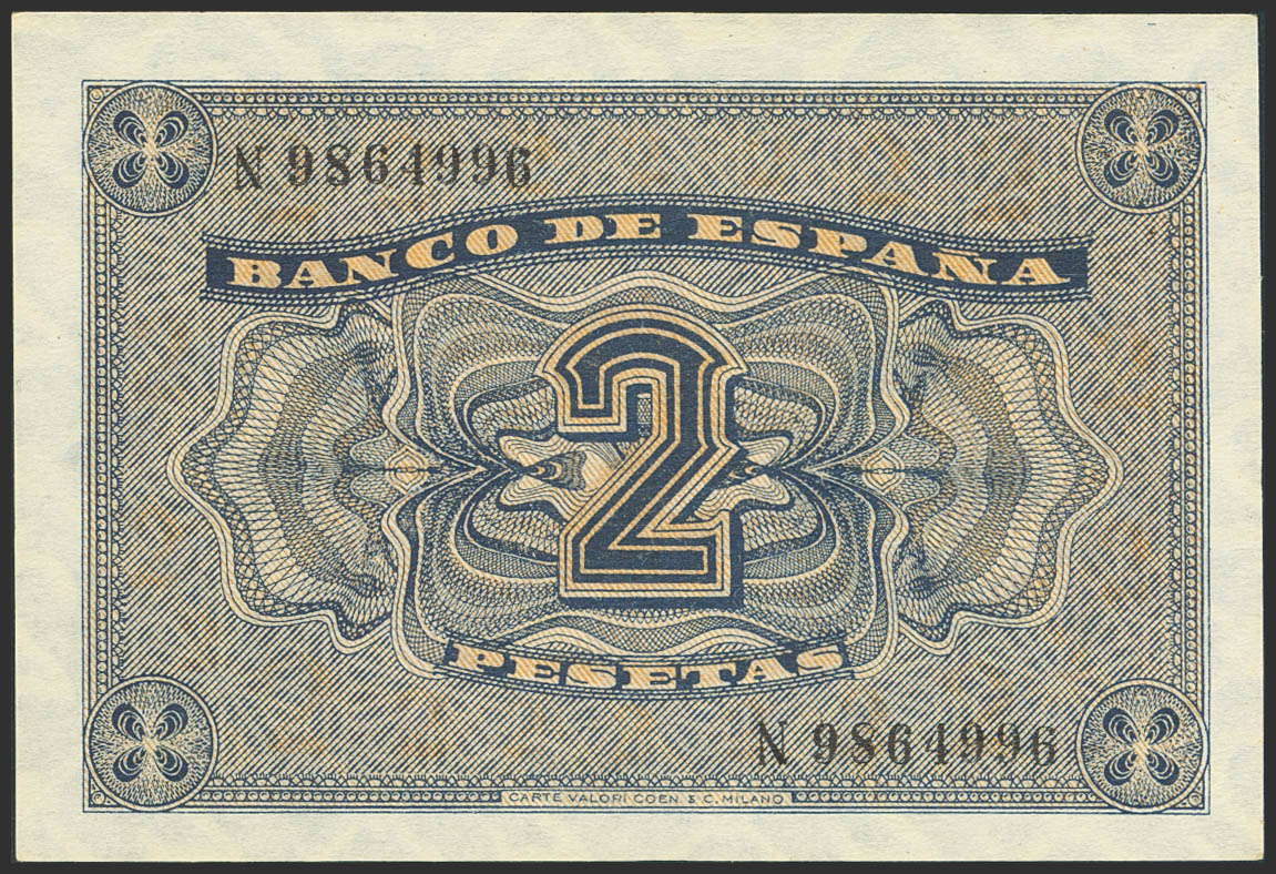 2 Pesetas. 30 de Abril de 1938. Serie N, última serie emitida. (Edifil 2023: 429b). EBC.