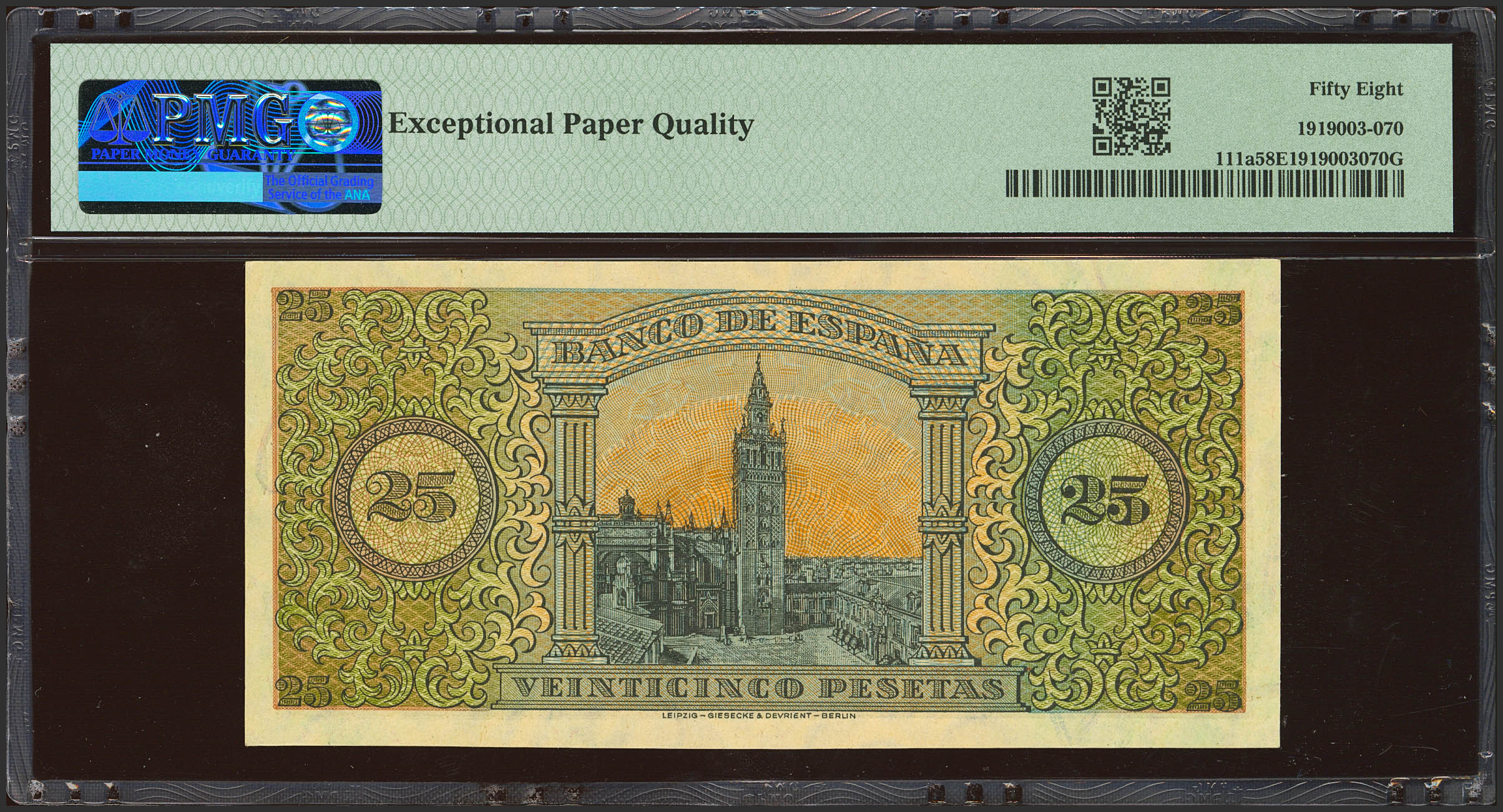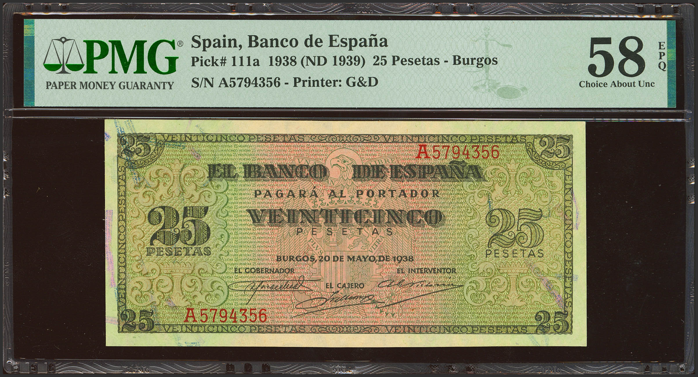 25 Pesetas. 20 de Mayo de 1938. Serie A. (Edifil 2023: 430, Pick: 111a). Apresto original. EBC+++. Encapsulado PMG58EPQ.