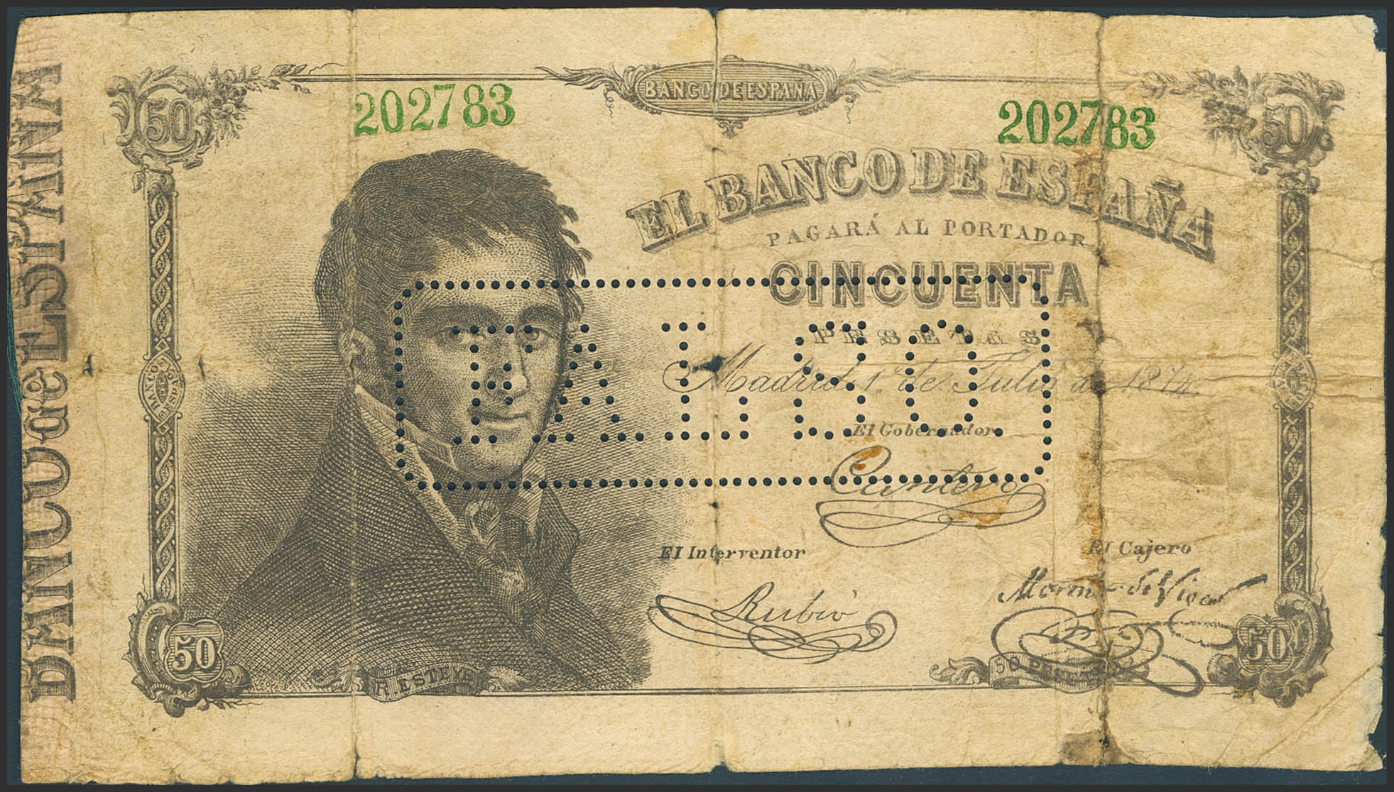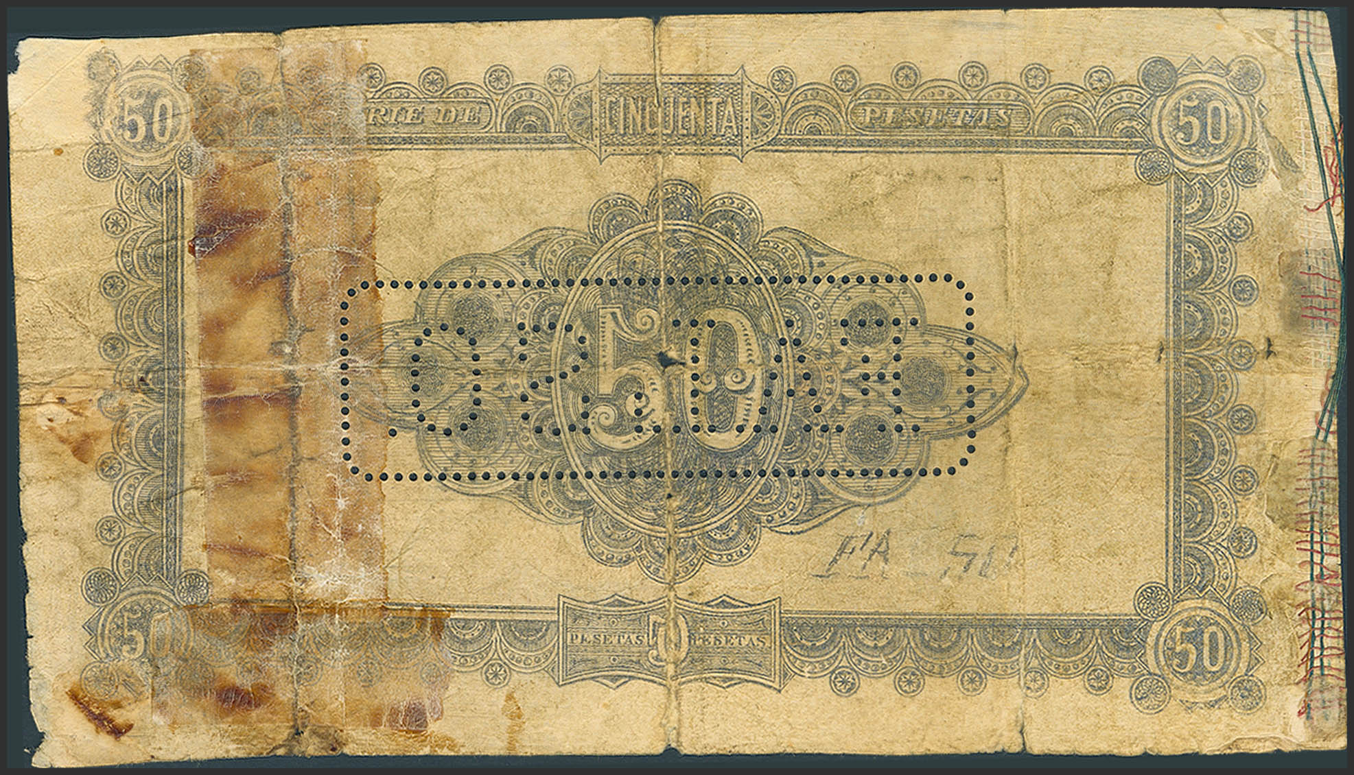 50 Pesetas. 1 de Julio de 1874. Falso de Epoca. Sin serie, taladrado "FALSO". (Edifil 2023: 260F). Muy raro. BC+.