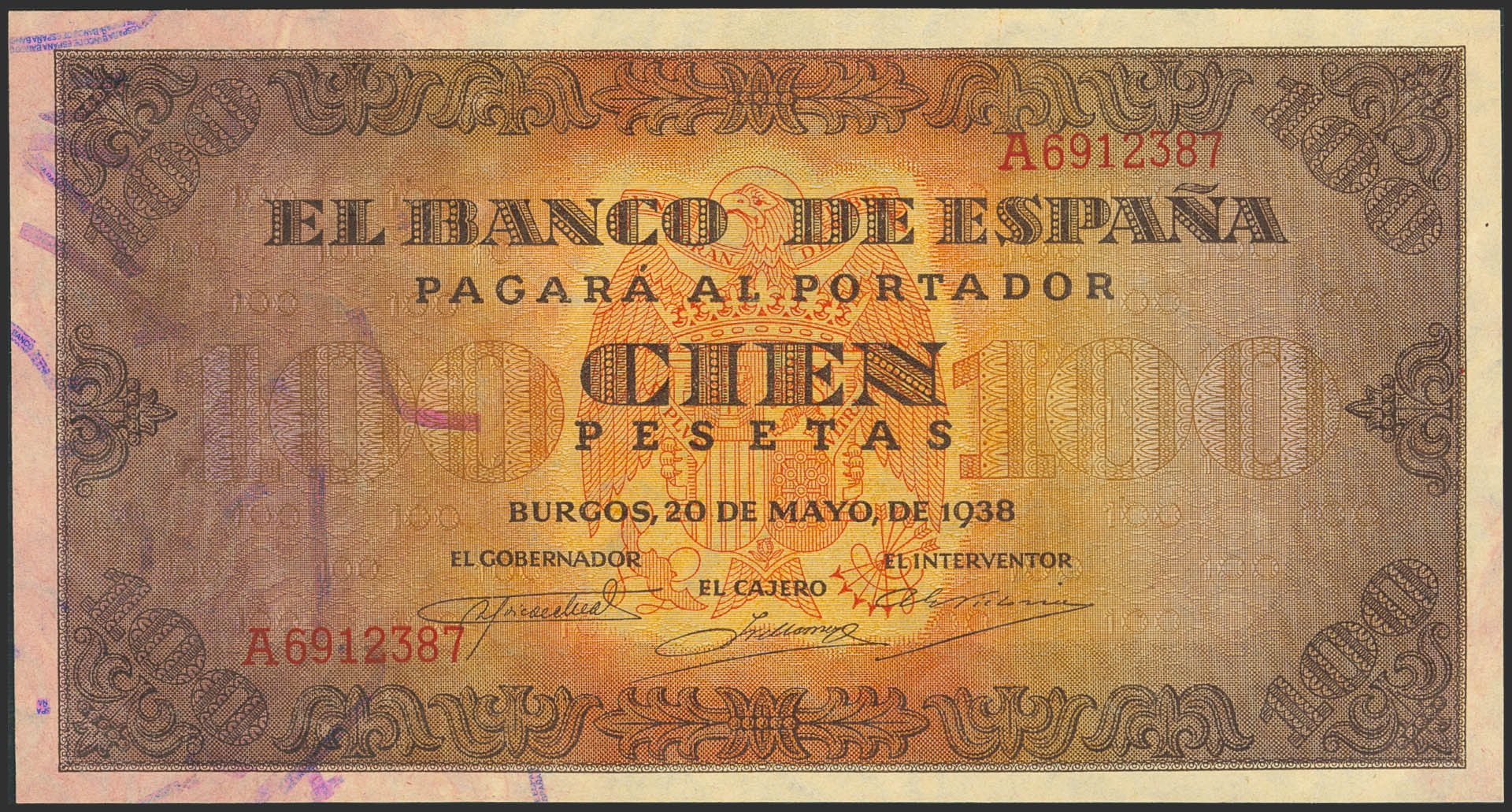 100 Pesetas. 20 de Mayo de 1938. Serie A. (Edifil 2023: 432). Conserva gran parte de su apresto original. EBC++.