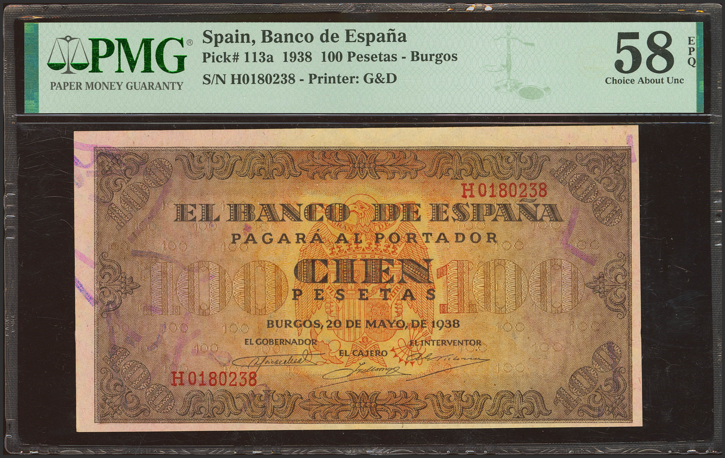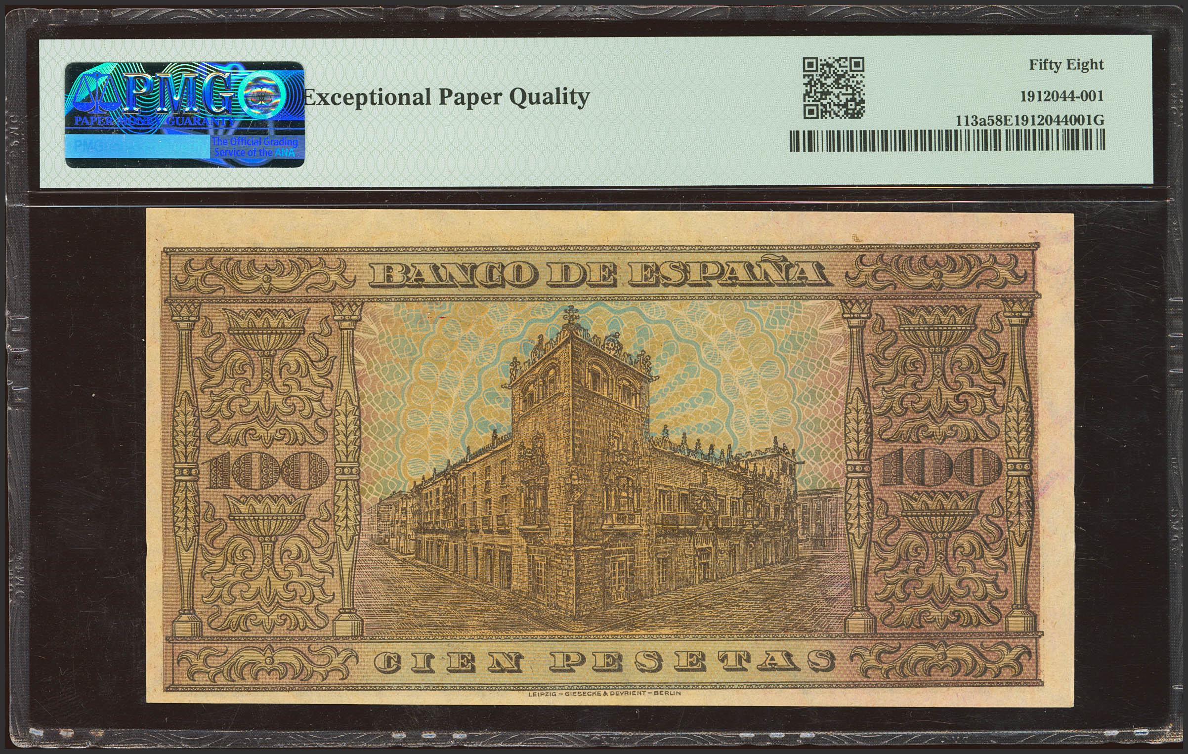 100 Pesetas. 20 de Mayo de 1938. Serie H, última serie emitida. (Edifil 2023: 432b, Pick: 113a). Apresto original. EBC+++. Encapsulado PMG58EPQ.