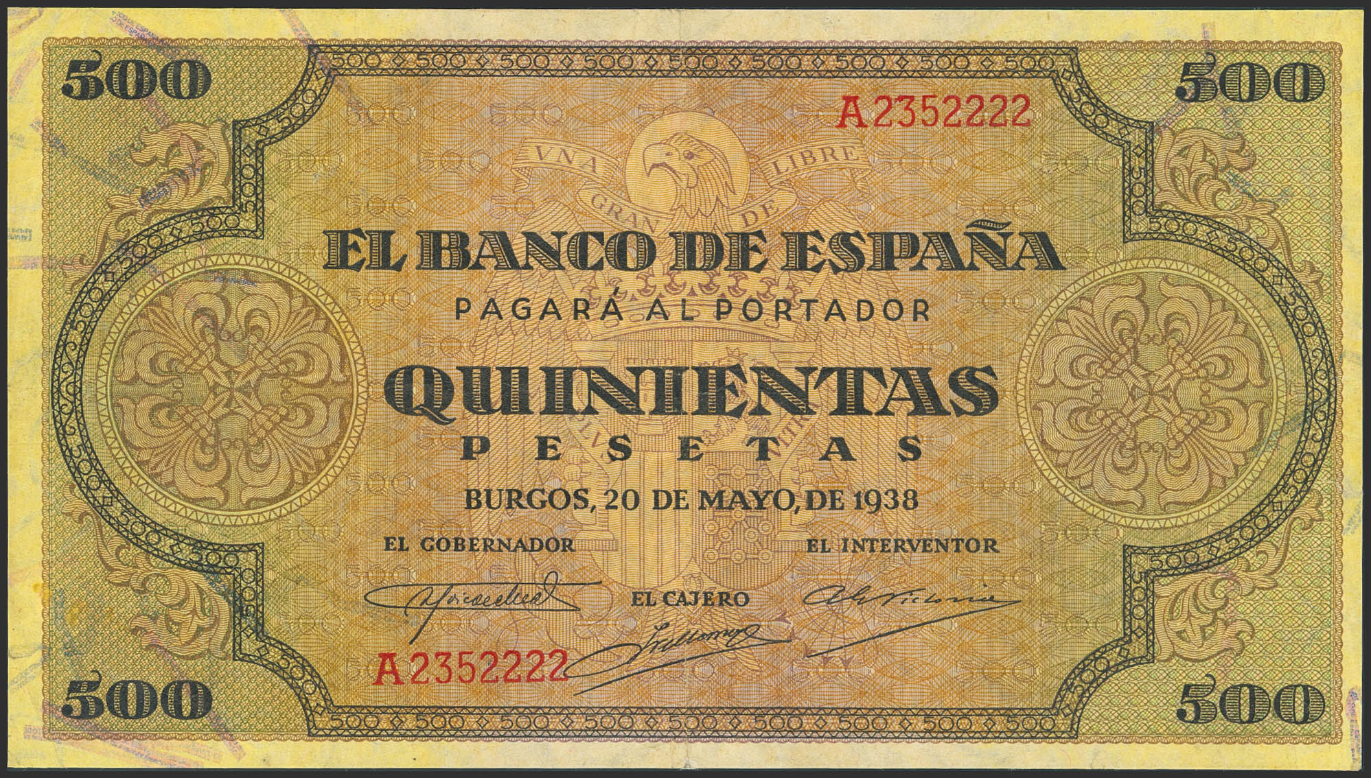 500 Pesetas. 20 de Mayo de 1938. Serie A. (Edifil 2023: 433). MBC+.