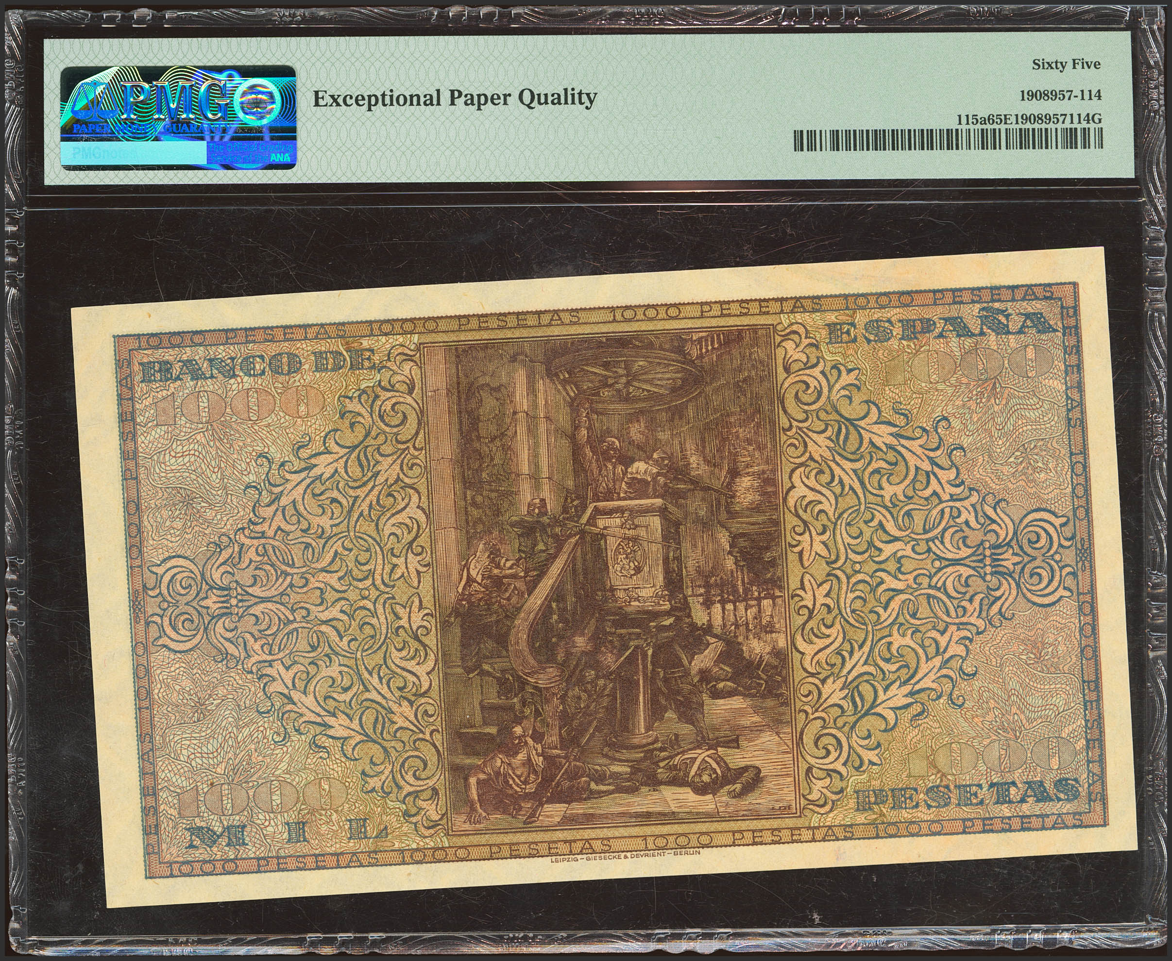 1000 Pesetas. 20 de Mayo de 1938. Serie A. (Edifil 2021: 434, Pick: 115a). Rarísimo en esta excepcional calidad, apresto original. SC. Encapsulado PMG65EPQ.