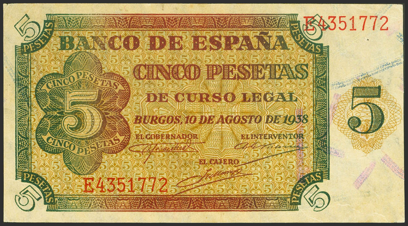 5 Pesetas. 10 de Agosto de 1938. Serie E. (Edifil 2023: 435a). Apresto original. SC-.