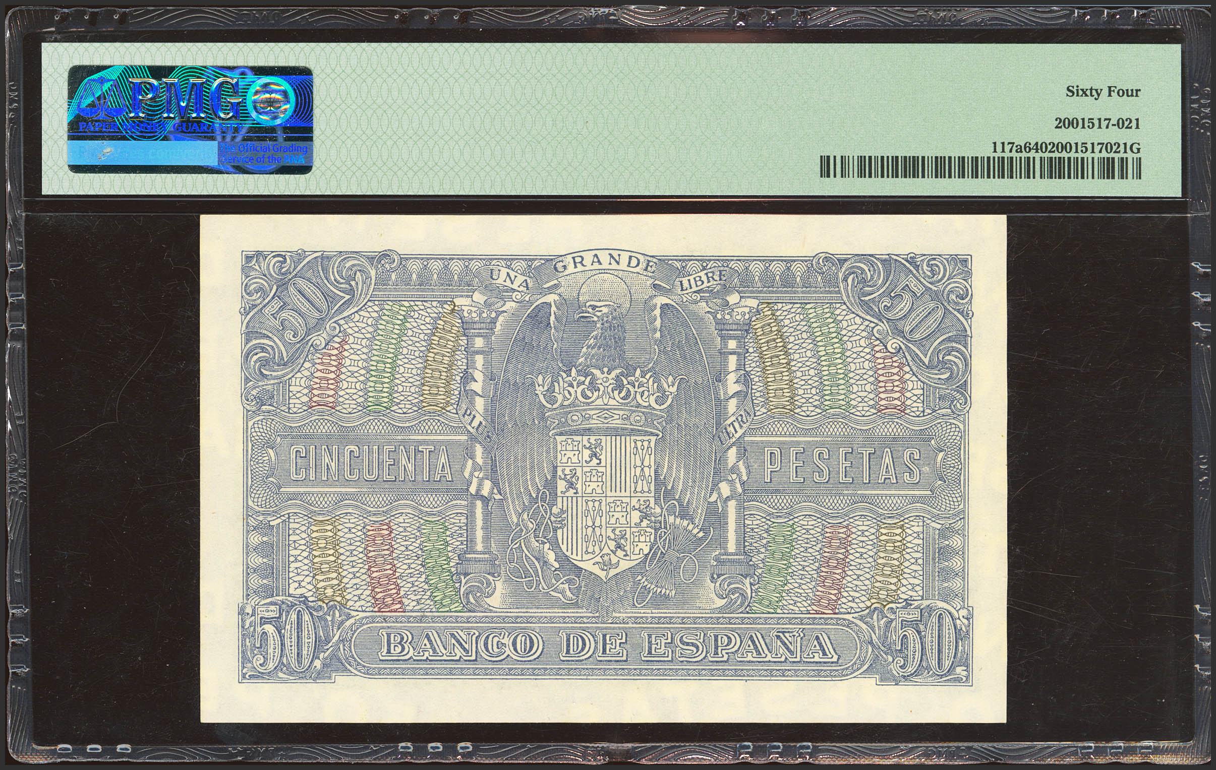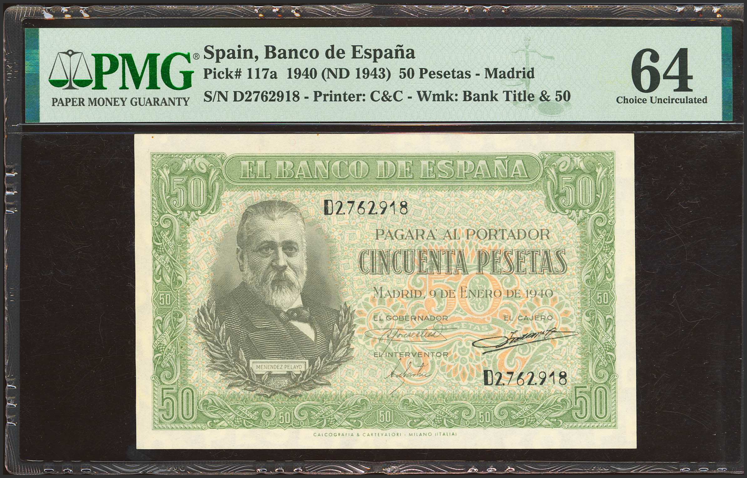 50 Pesetas. 9 de Enero de 1940. Serie D. (Edifil 2023: 437a, Pick: 117a). Inusual en esta calidad. SC. Encapsulado PMG64.