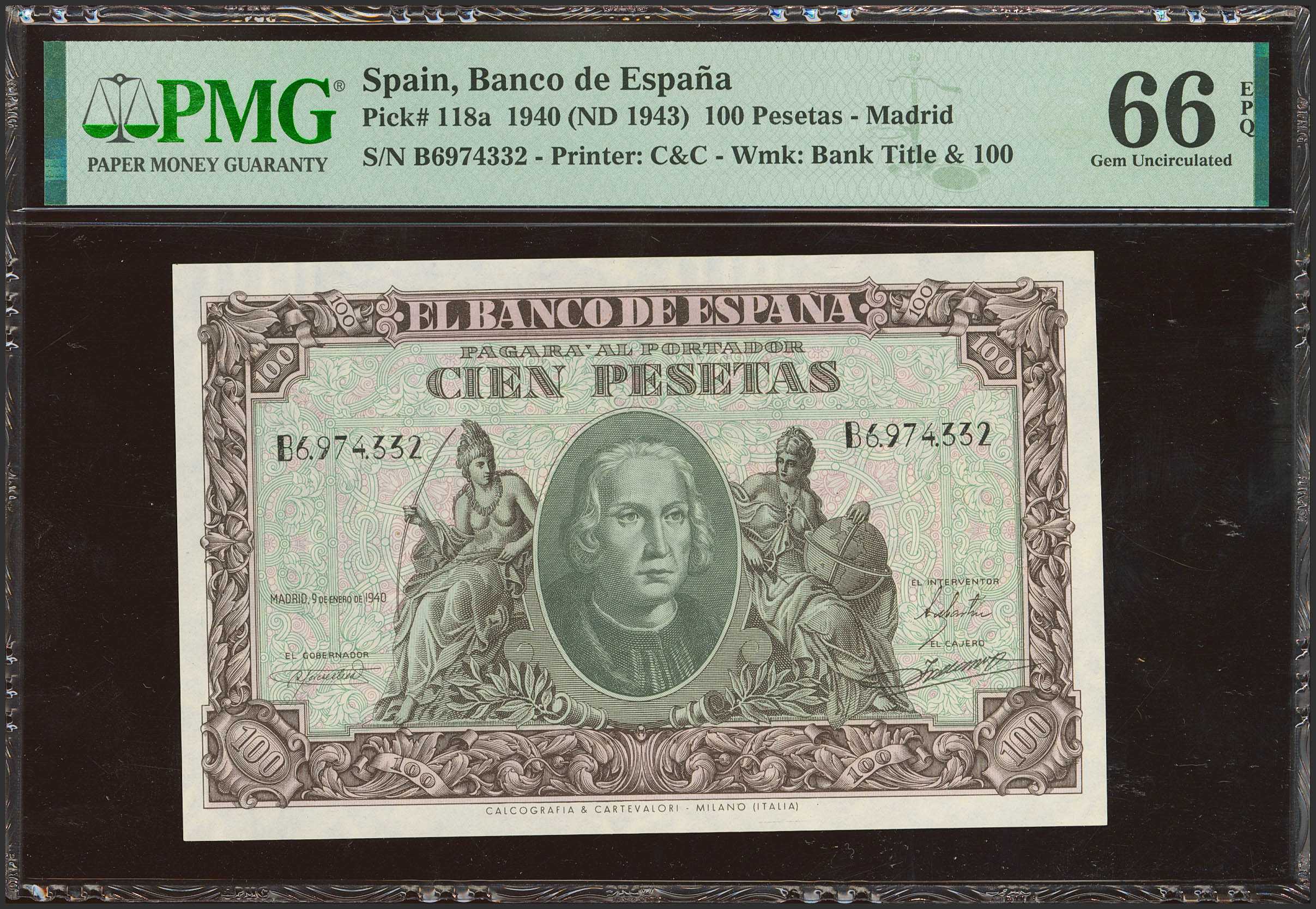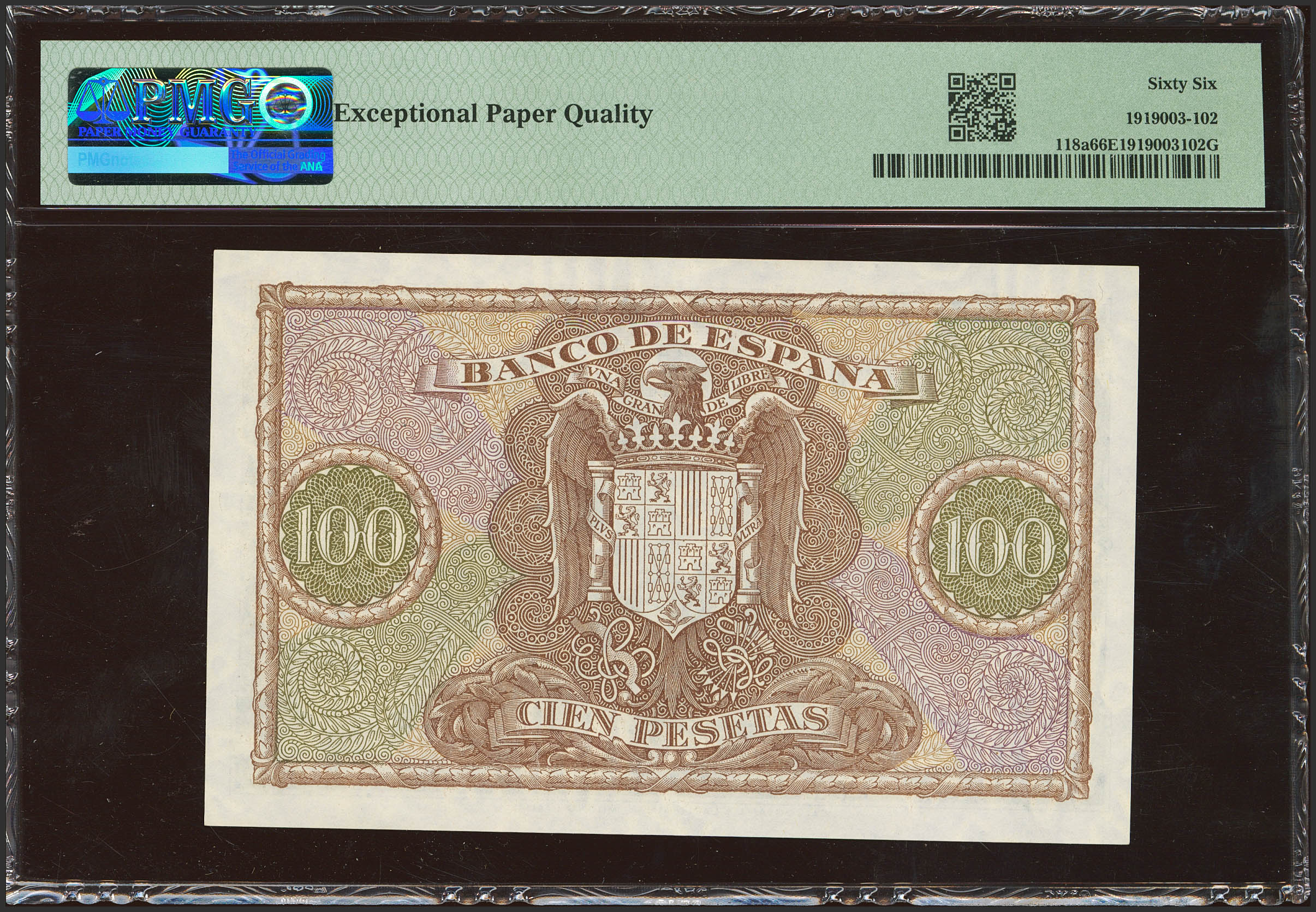 100 Pesetas. 9 de Enero de 1940. Serie B. (Edifil 2023: 438a, Pick: 118a). Muy raro en esta excepcional calidad, apresto original. SC. Encapsulado PMG66EPQ.