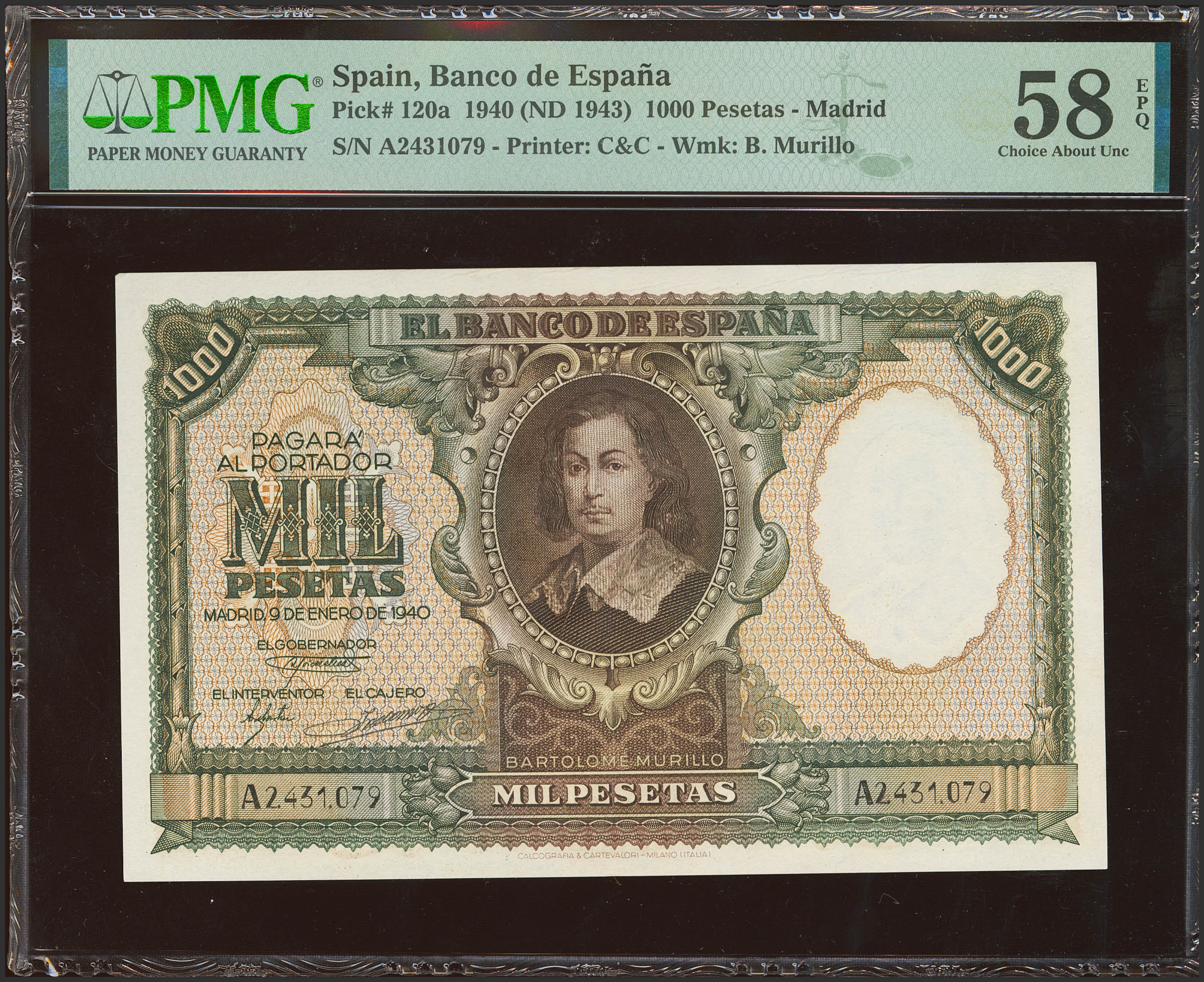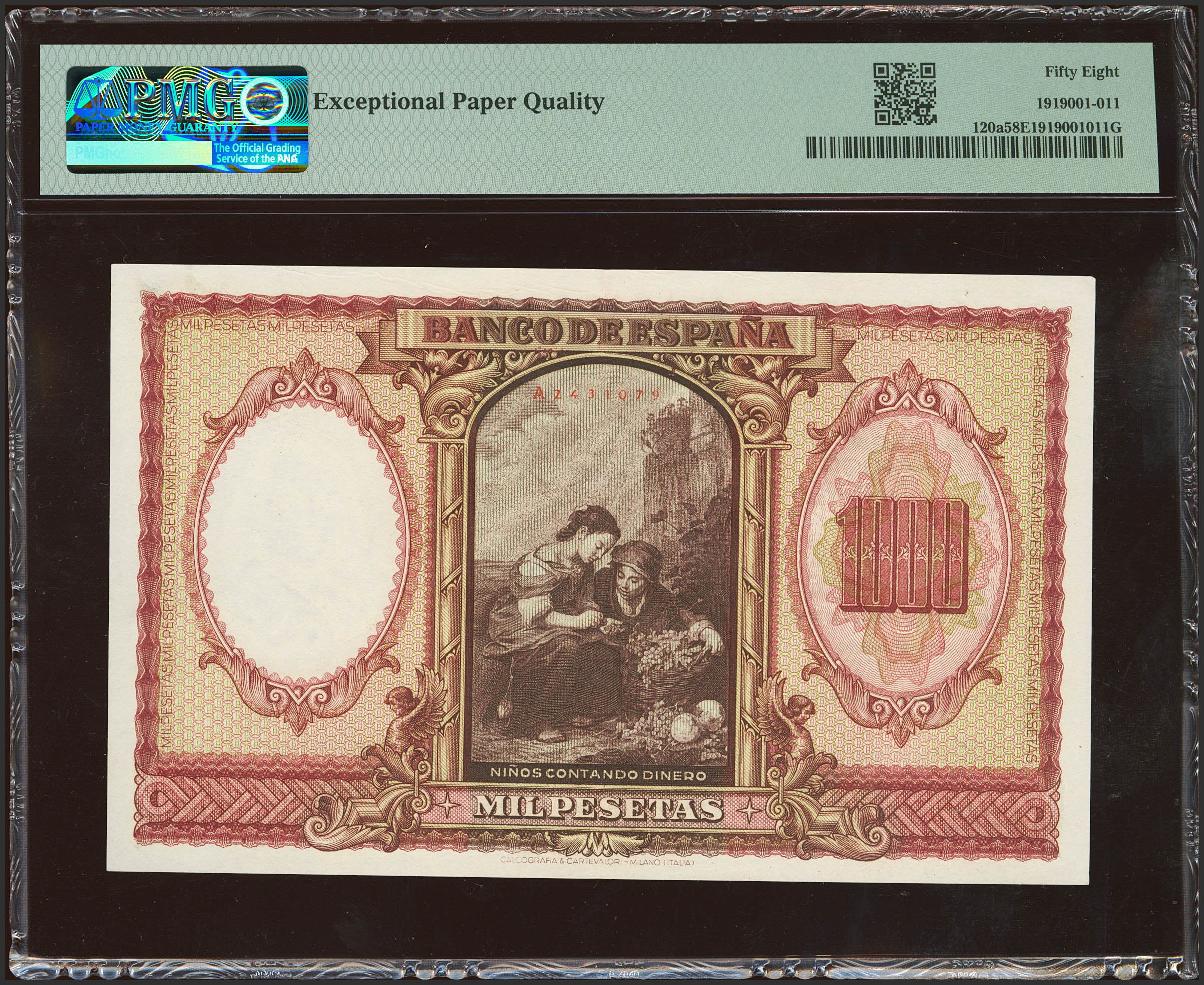 1000 Pesetas. 9 de Enero de 1940. Serie A. (Edifil 2021: 440, Pick: 120a). Raro en esta calidad, apresto original. EBC+++. Encapsulado PMG58EPQ. (para hacernos idea de la rareza, a fecha 1 de Junio de 2024, este billete es el cuarto mejor calificado junto a otros cinco billetes en PMG)