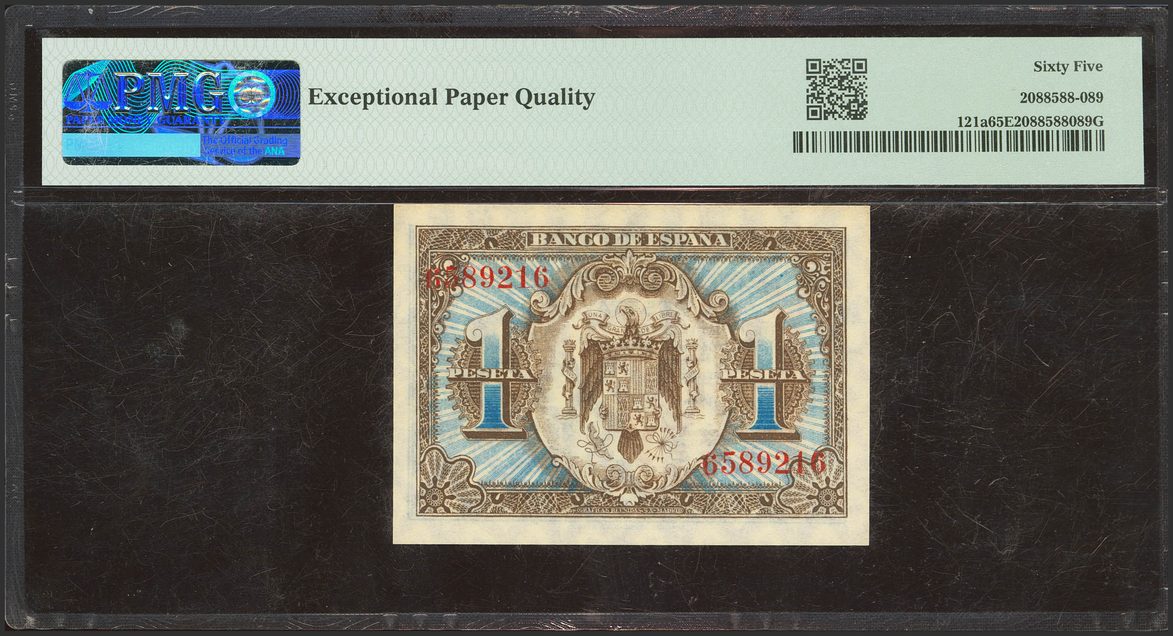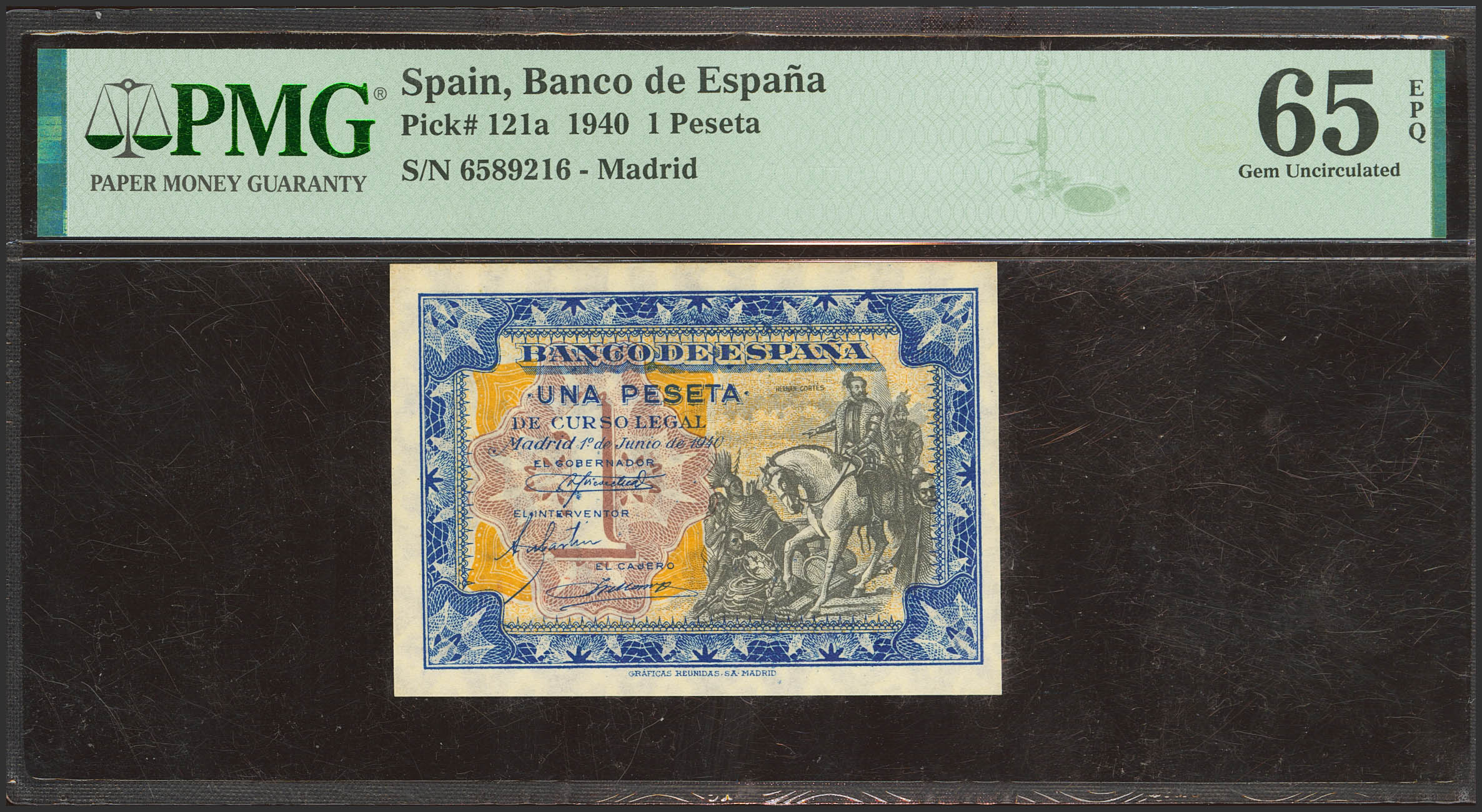 1 Pesetas. 1 de Junio de 1940. Sin serie. (Edifil 2023: 441, Pick: 121a). Inusual en esta calidad, apresto original. SC. Encapsulado PMG65EPQ.