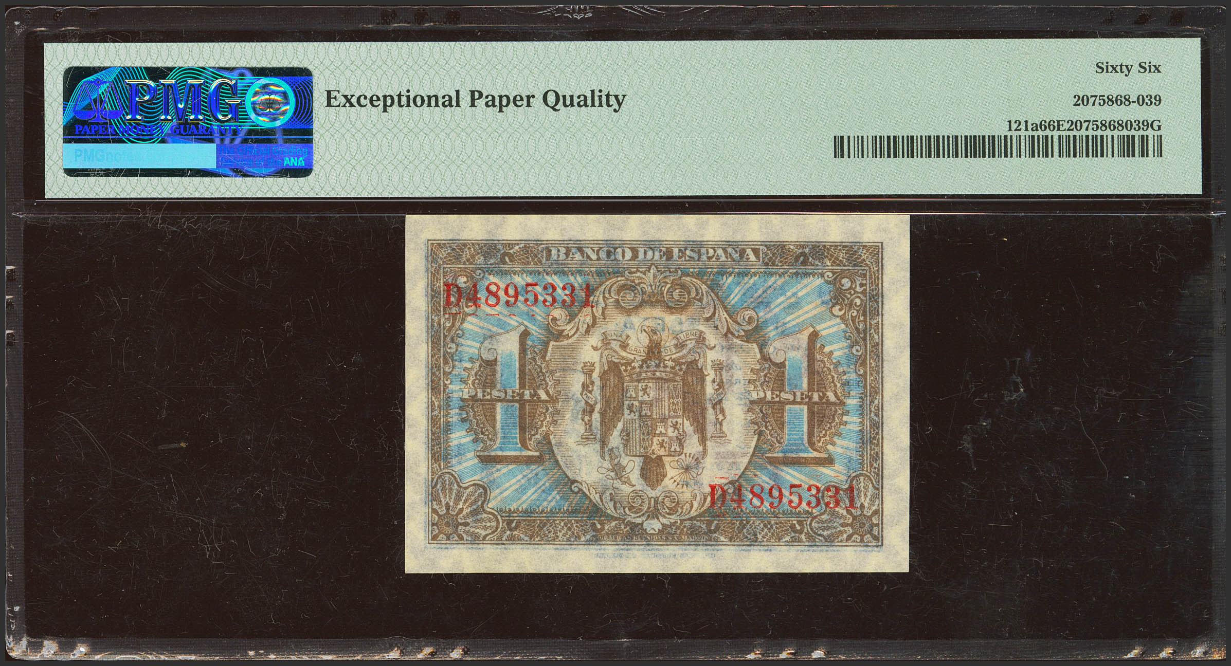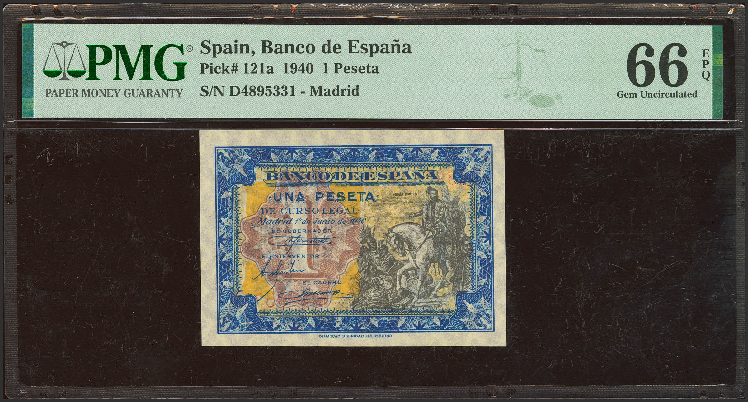 1 Peseta. 1 de Junio de 1940. Serie D. (Edifil 2023: 441a, Pick: 121a). Raro en esta excepcional calidad, apresto original. SC. Encapsulado PMG66EPQ.